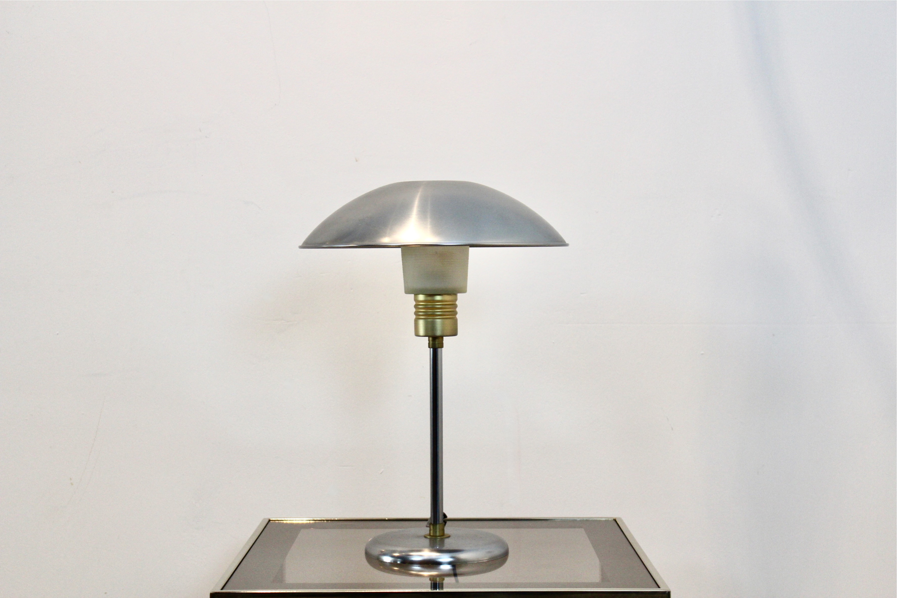 The lamp features a domed brushed steel shade with a frosted glass diffuser that softens the light beautifully. The slender brass-accented stem rises from a weighted circular base, achieving a perfect balance between industrial functionality and timeless elegance. Ideal as a desk lamp, bedside lamp, or accent light on a console or sideboard, this piece adds sophistication to any interior.