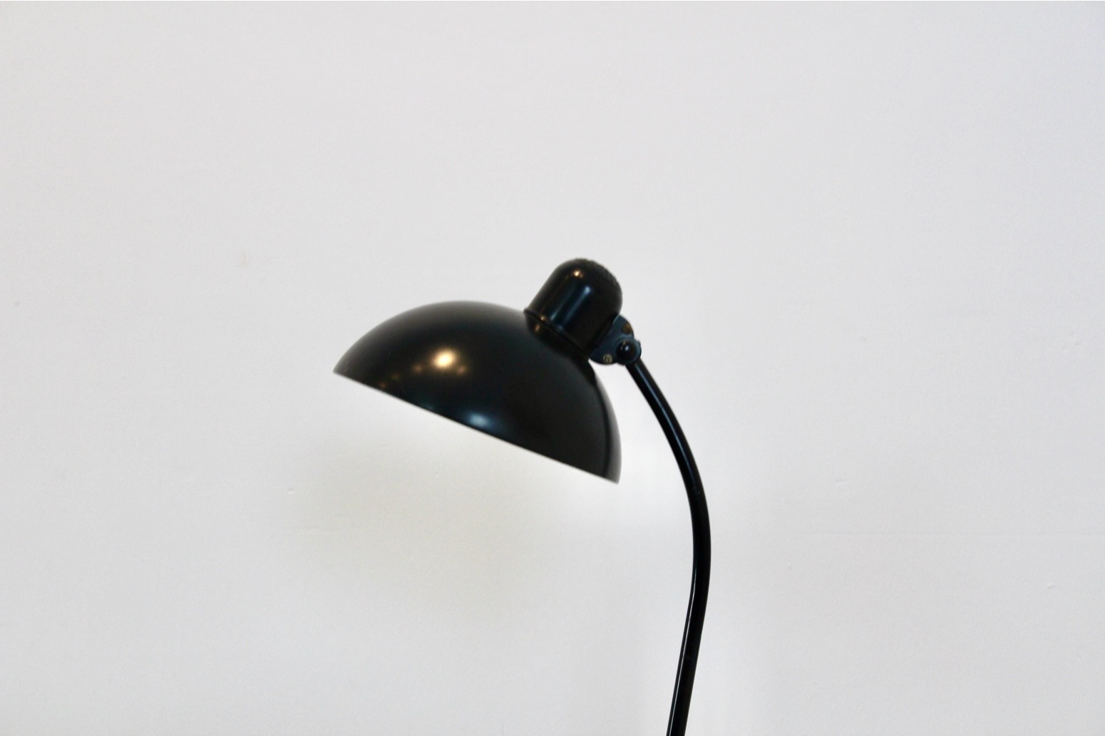 Beautiful German Desk Lamp produced by Kaiser Idell and designed by Christian Dell 1930s. Featuring a tilt, arched tubular steel stem and a wide, adjustable black lacquered metal dome lampshade. Utilizes patented swivel joint design on a solid round black lacquered metal D base. Original paint. Stamped on the top and with very nice sculptural lining.