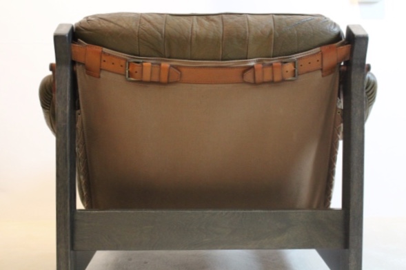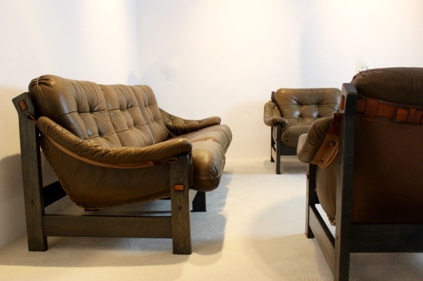 Brazilian Oak & Olive Green Leather 3-Seat Sofa by Jean Gillon