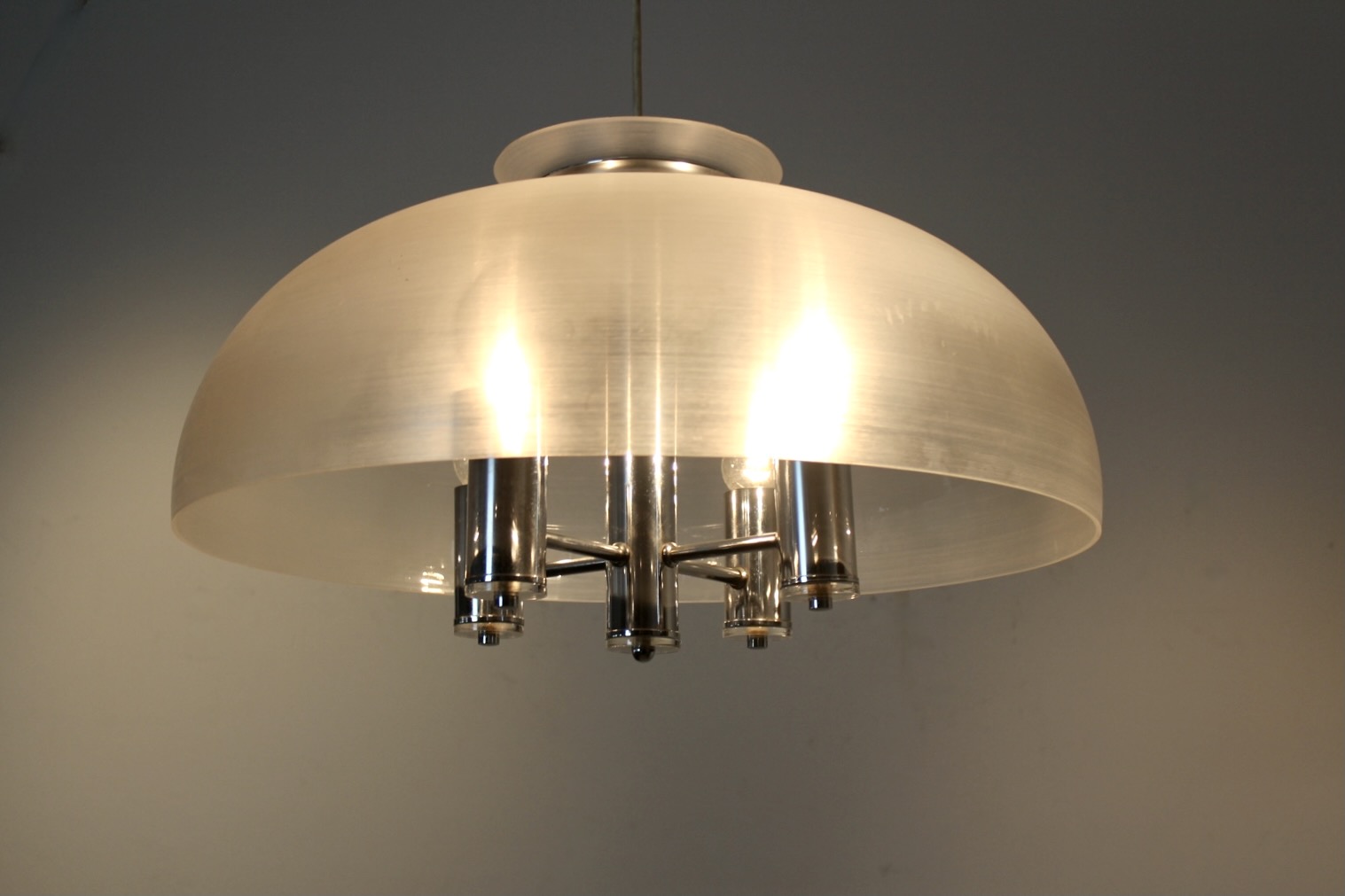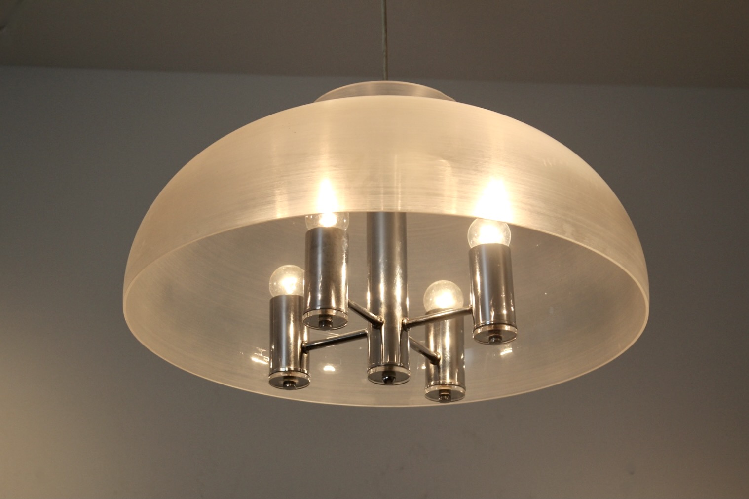 Beautiful Pendant by Doria Leuchten, Germany 1960s. The pendant comes with a Lucite Dome with inside a small chrome chandelier with 5 lights. It has a classic look: it is pure, simple and it gives a very stylish light. The height of the pendant is adjustable through the wire. This Dome Pendant is in very good vintage condition, cleaned and checked, so ready for use.