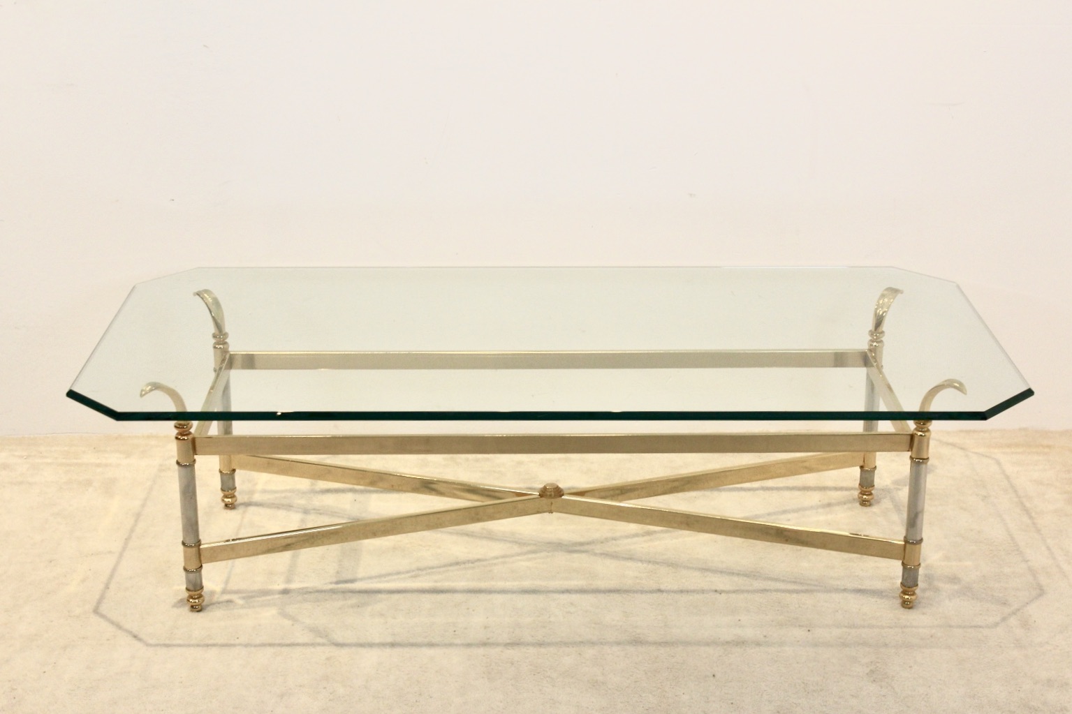 Sophisticated French Center table with a stunning Brass and Chrome frame with a beautiful graphical design and chique accents. The glass has facet sides and is very thick. This solid and glossy rectangular shaped table is a unique example of the chique French style and in excellent condition.