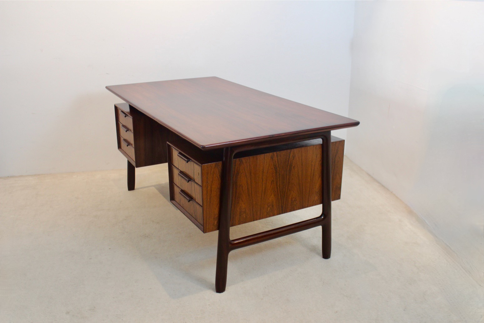 Exquisite Danish Free-Standing Desk in teak. Designed by Arne Vodder and produced by Sibast Denmark in 1960s. The Desk is made of teak wood and features two sets of three drawers on each side and 2 storage compartments as well as an extra closed storage compartment on the back side. This means you can use it as a free-standing desk in the room, very beautiful! It shows some beautiful detailing, especially the organic shaped handmade leg construction and the handles. The condition is very good and in original condition, with normal wear due to use and age. Check the pictures for this high-quality Danish craftsmanship. Overall appearance presents beautifully. The desk is Spatially designed and looks great freely in space.