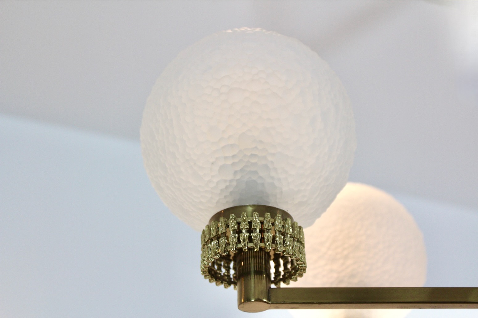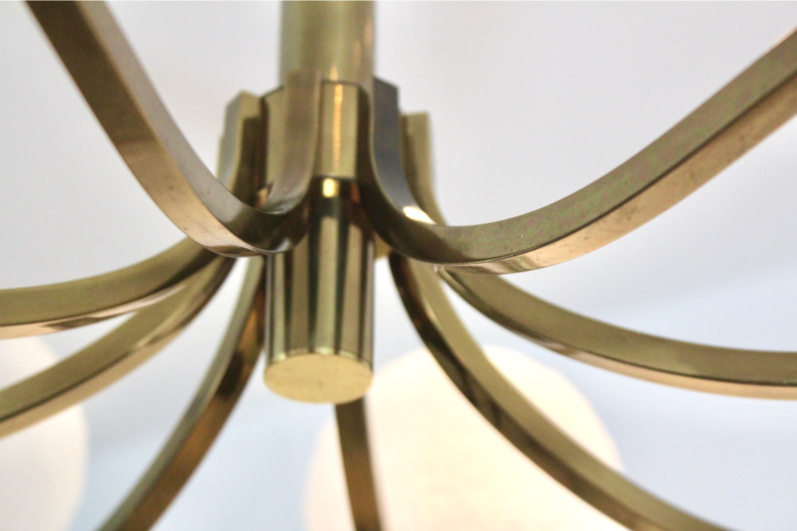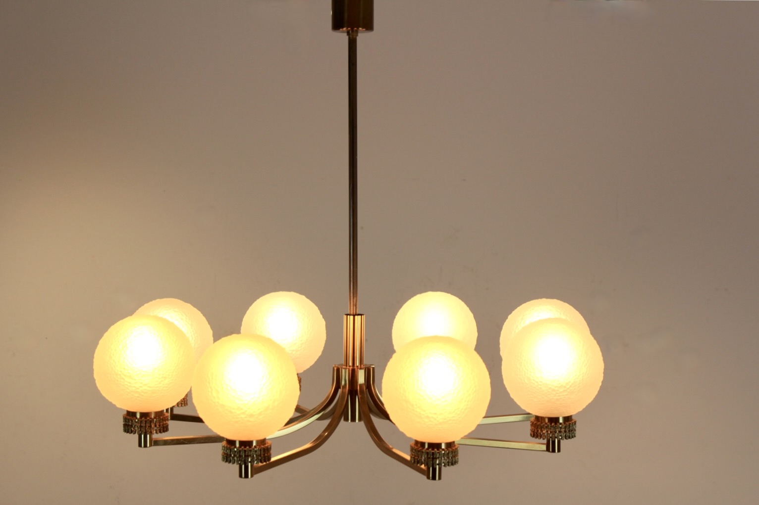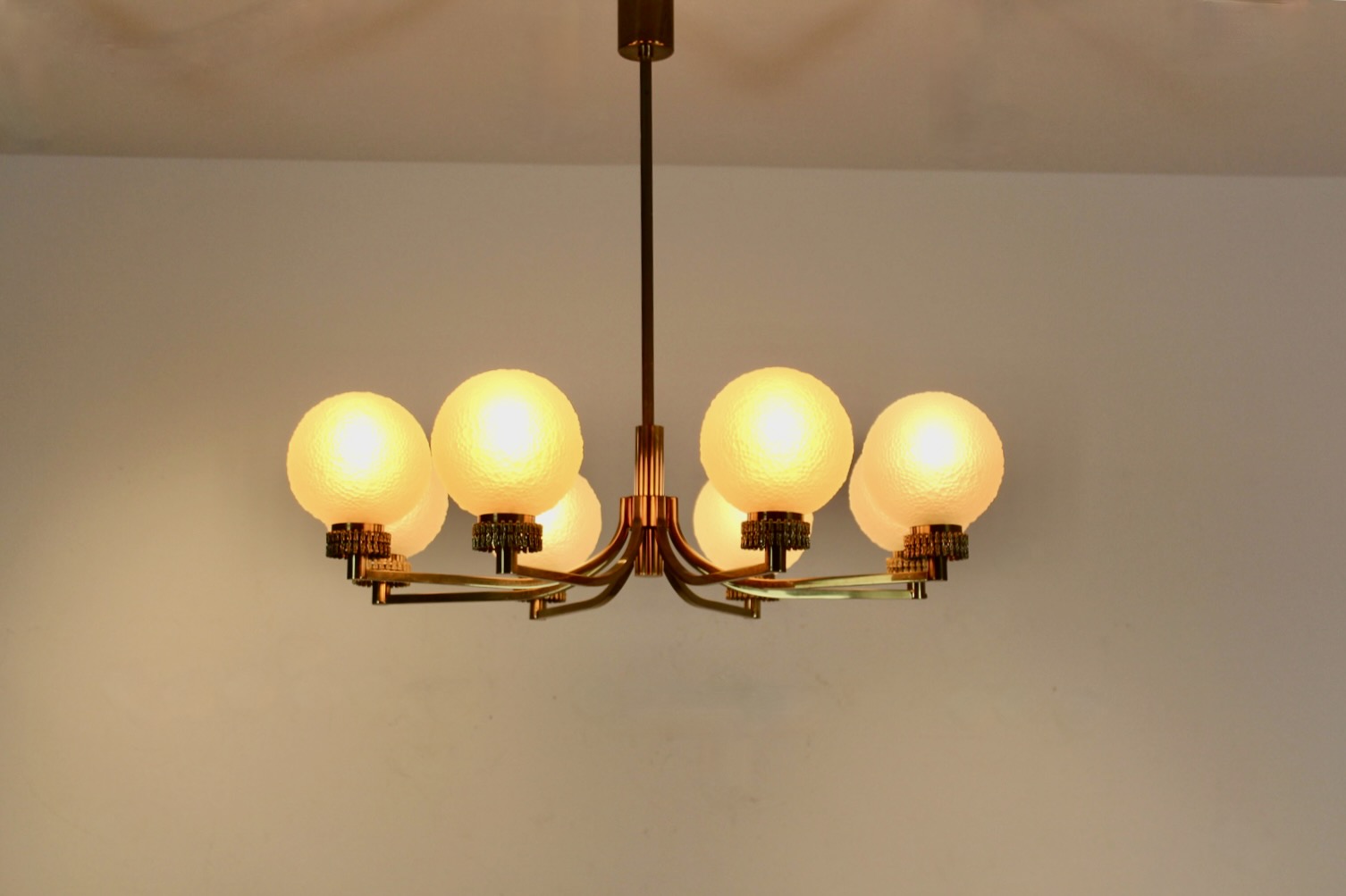Distinctive and unique Brass Chandelier with eight arms and with very nice Frozen Glass Shades. Coming from France, made in the 1960’s. Each arm features one Frozen Glass Bowl, so eight Glass shades in total. All are in good condition as is the whole chandelier. With a warm, delicate patina and exceptional base for the glass bowls. With a beautiful light fall on your interior and a classic look: it is pure and sophisticated.