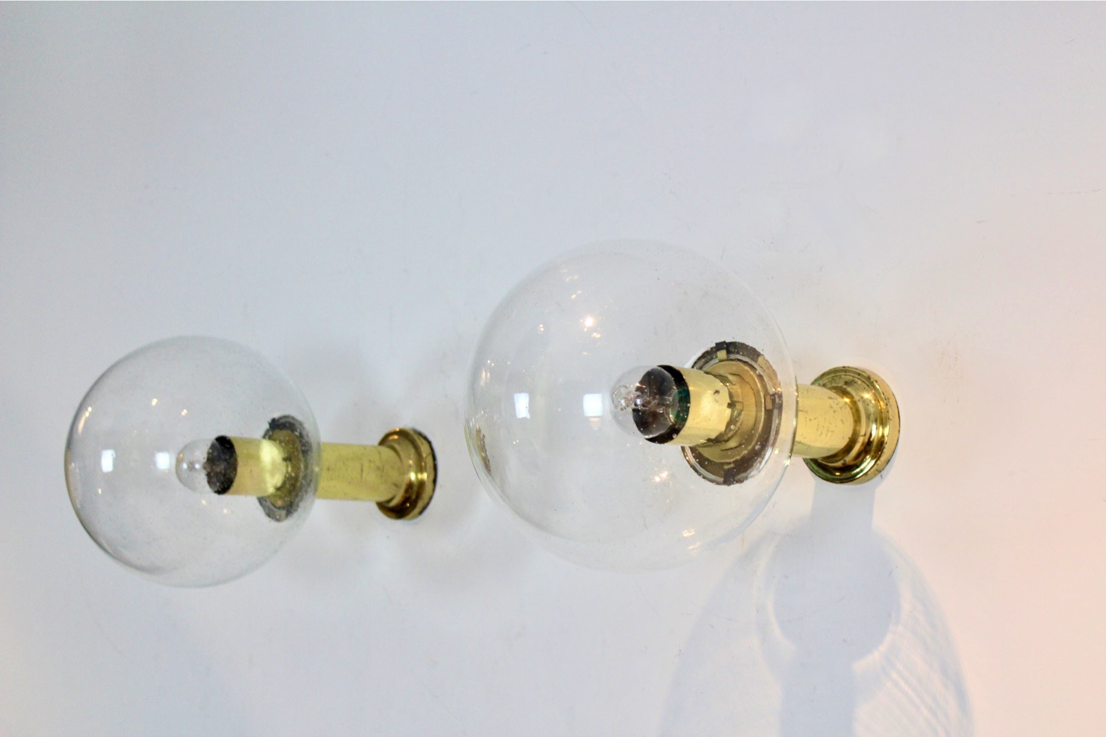 Beautiful high quality and characteristic Glashütte Limburg Flush Mount (or Wall Light). We have a stock of 6 pieces available. An example of Limburg's Modernist quality lighting. The lamp has a solid round Brass base fixture with a large Bubble Glass Globe. Holds an E27 (led)bulb and marked with Glashütte. Light wear and patina on the brass due to age but still in good and original condition with a beautiful light effect.
