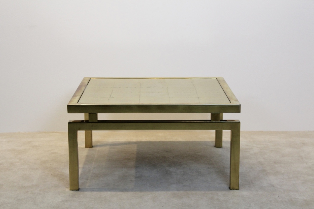 Extraordinary Gold Etched Glass Coffee Table on an elegant Brass frame, made in France in the 1970s. Stunning France coffee table with stylish performance, the gold leaf gives a beautiful dimension and has fantastic patina. The solid Brass frame has a total original finish with beautiful etched Glass. The table is a unique example of the Hollywood Regency style and in excellent vintage condition. This luxurious table comes with lots of room for storage or display magazines, books. Designed with precision and with a beautiful graphical frame.