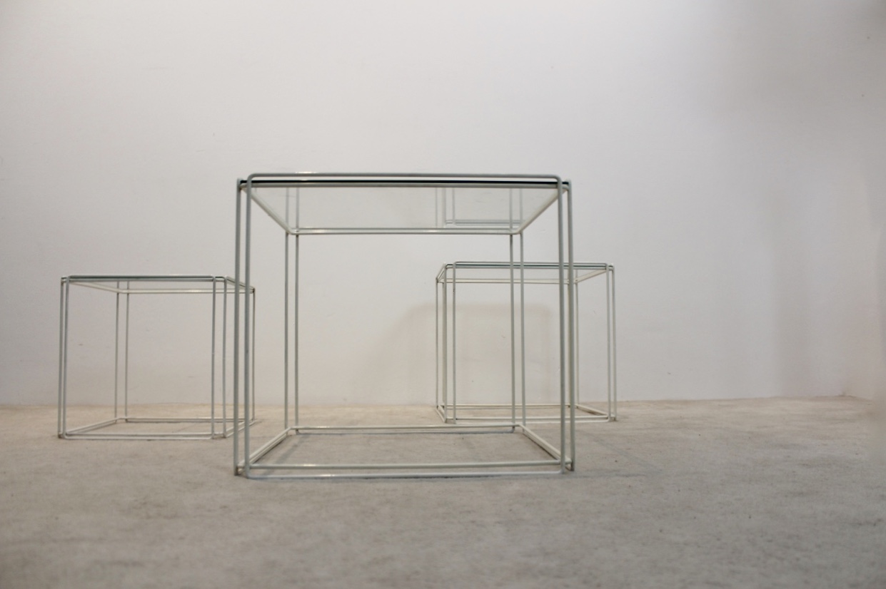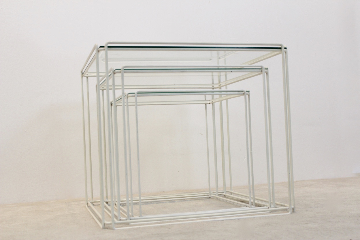 This nest of three Isocele Nesting Tables originates from France and was manufactured in the ‘70’s by Atrow. They have a White wire Steel frame with glass on top. Designed by Max Sauze and are in very good vintage condition. These Minimalistic tables come with a beautiful graphical design.