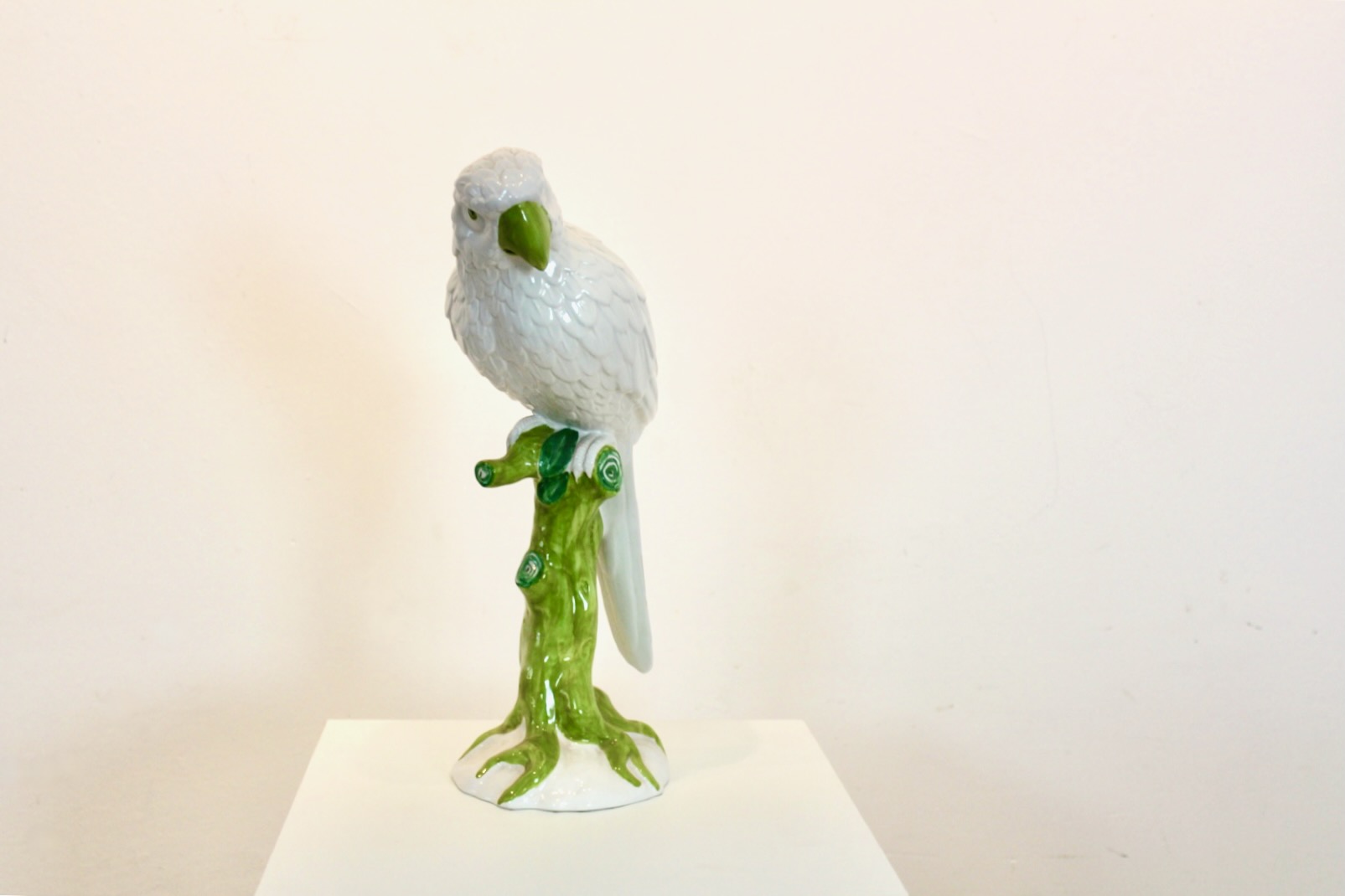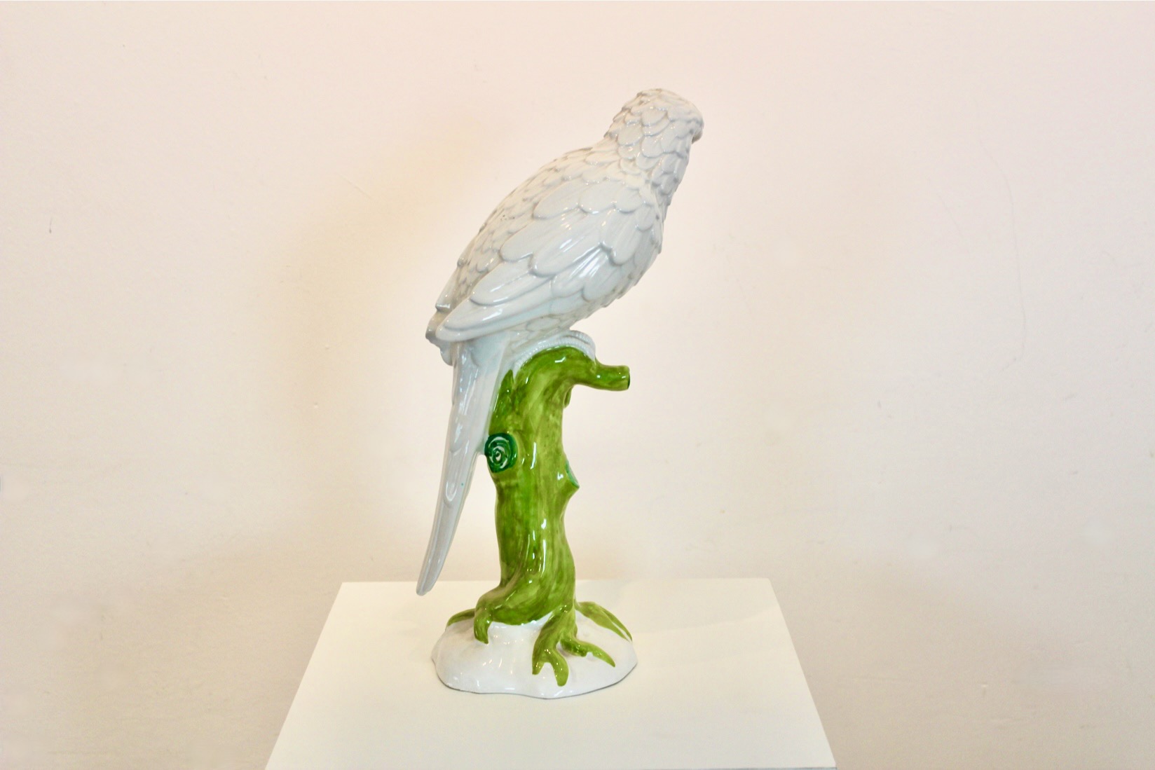 A striking example of mid-century Italian ceramic art, this Ronzan parrot sculpture exemplifies the refined craftsmanship and expressive design for which the Ronzan brothers are renowned. Measuring 34 cm in height, the parrot is rendered in a beautifully nuanced white glaze with subtle cream feathering, perched confidently on a vivid green tree branch base. Handcrafted in Italy, likely in the 1960s–70s, the piece is notable for its sculptural precision and the vibrancy of its glaze. The expressive form, particularly the bird’s poised posture and thoughtful detailing, reflects Ronzan’s unique ability to blend natural realism with stylized elegance.