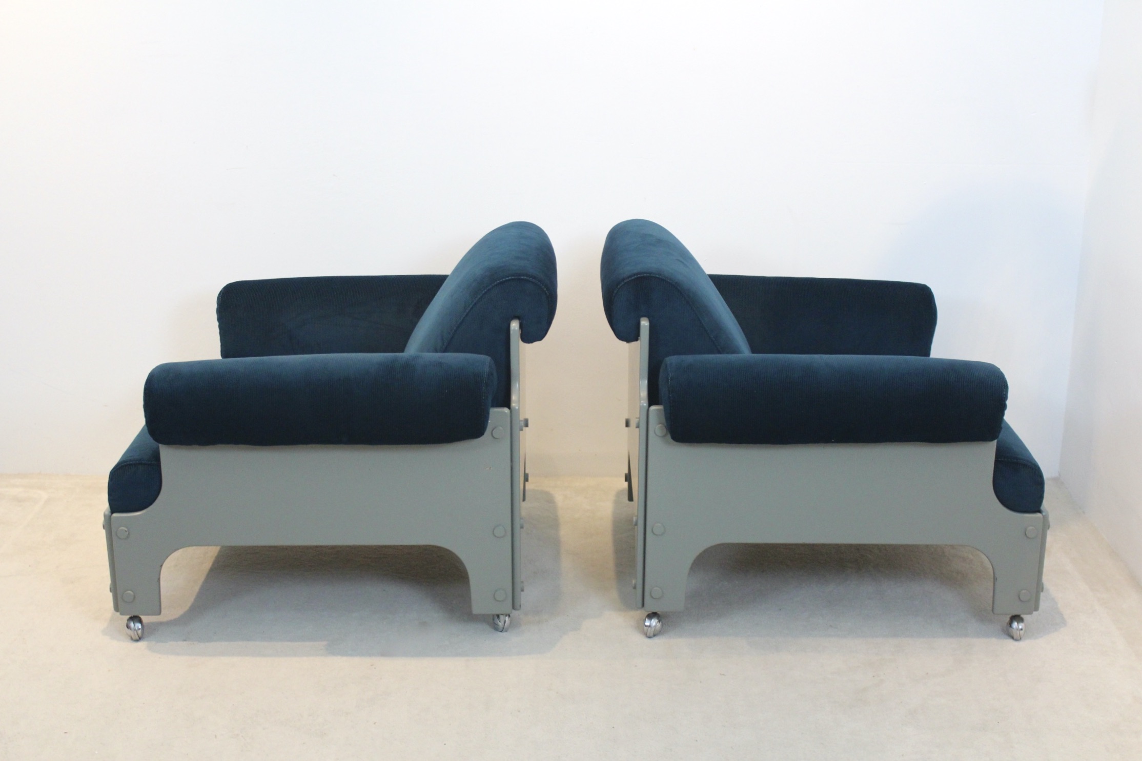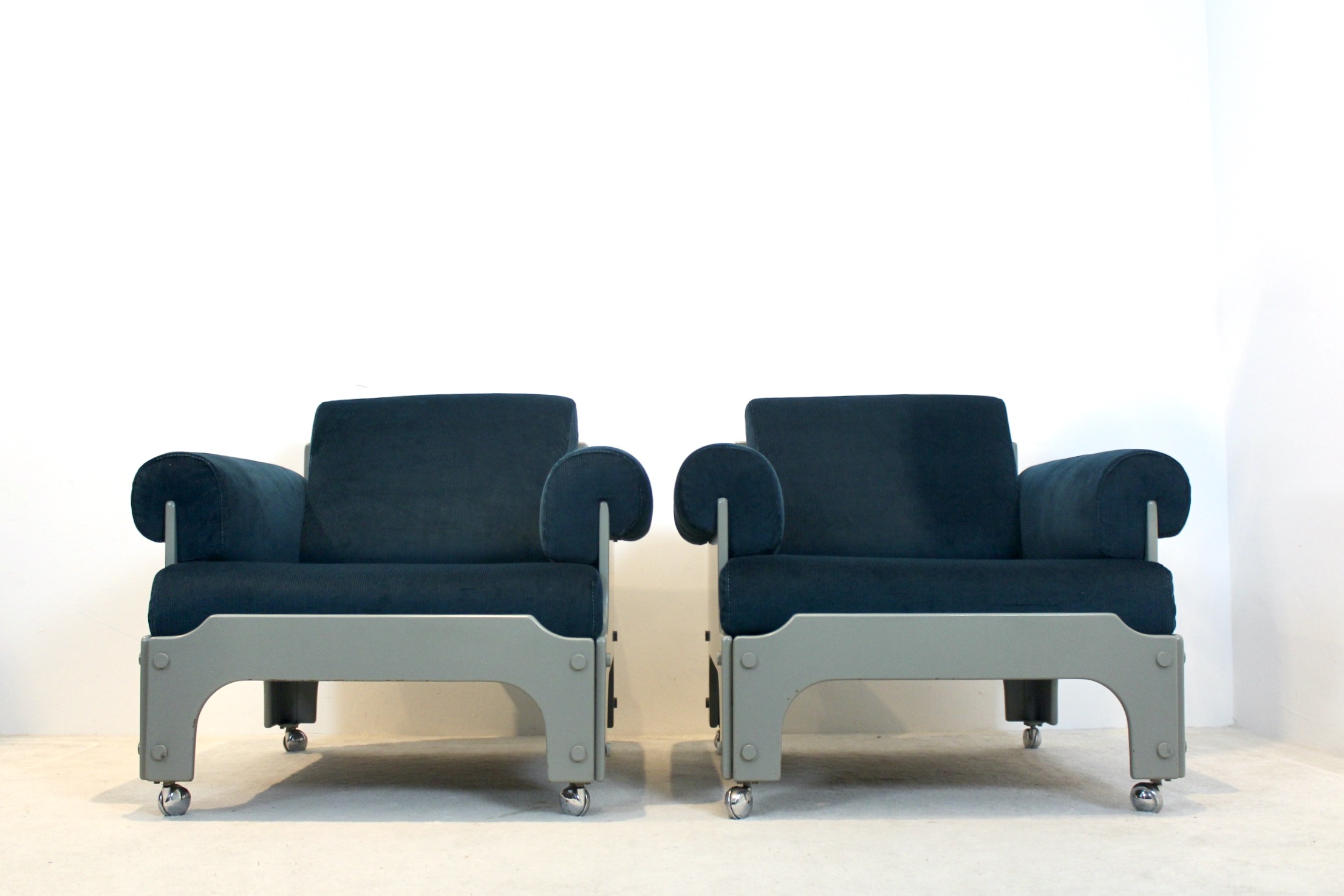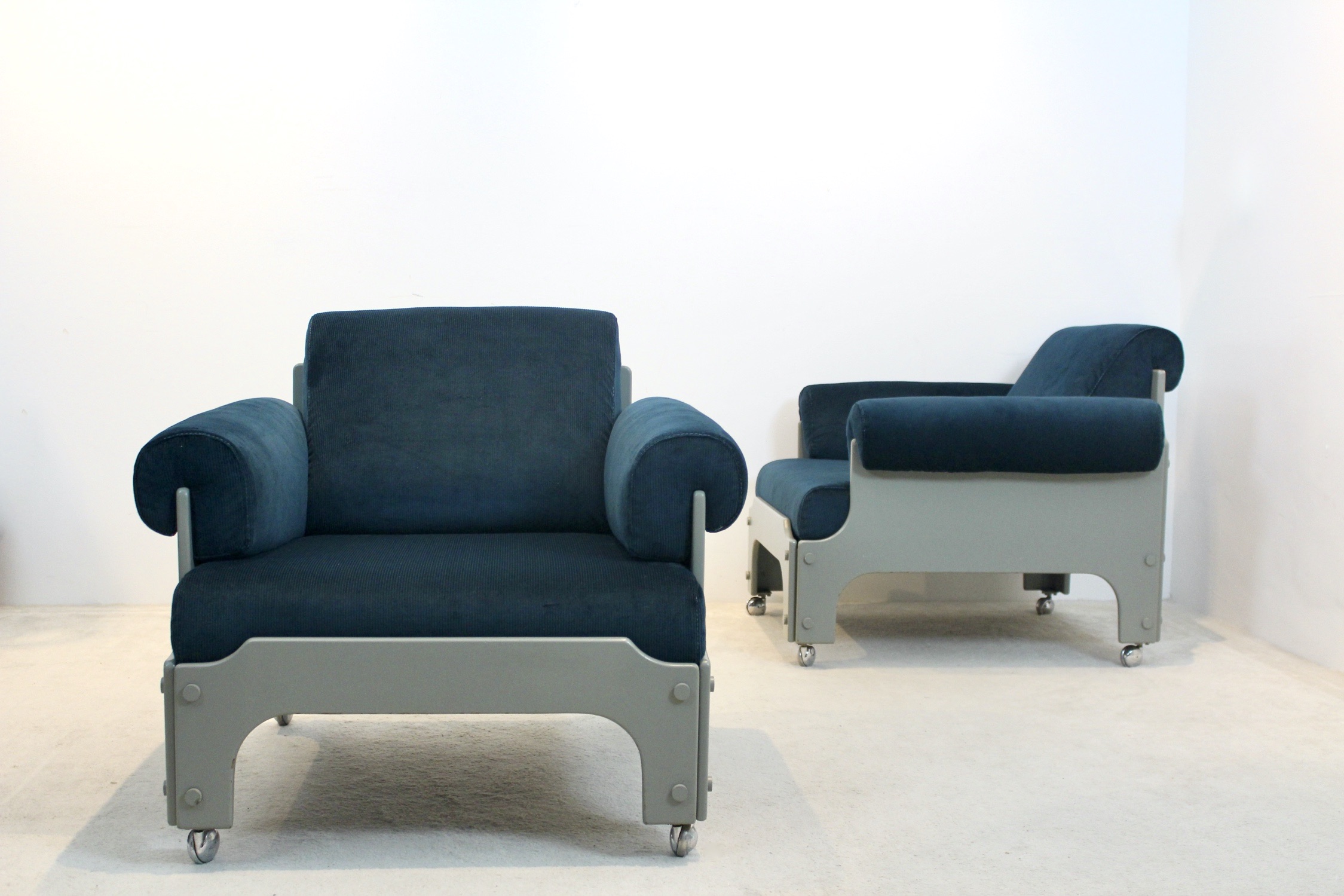 A rare and striking pair of SZ 85 lounge chairs designed by Jan Pieter Berghoef for Spectrum in the 1968/1969 (signed). These bold, industrial-style armchairs embody the forward-thinking spirit of Dutch modernism with an unmistakably architectural presence. Each chair features a lacquered multiplex frame in a soft gray hue, contrasted by deep petrol blue corduroy upholstery, giving them a tactile richness and sculptural silhouette. The integrated casters provide practical mobility without compromising their aesthetic integrity.