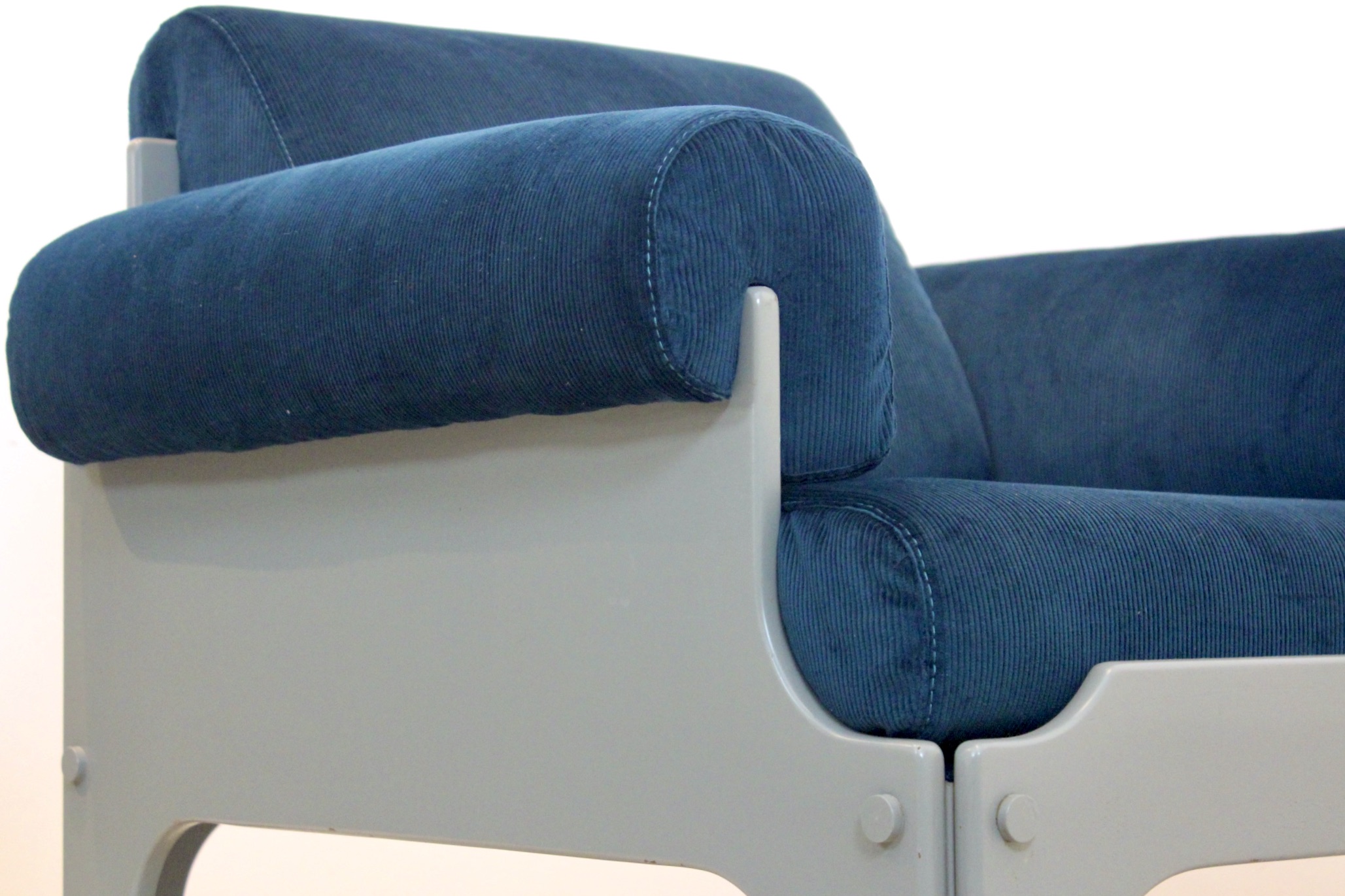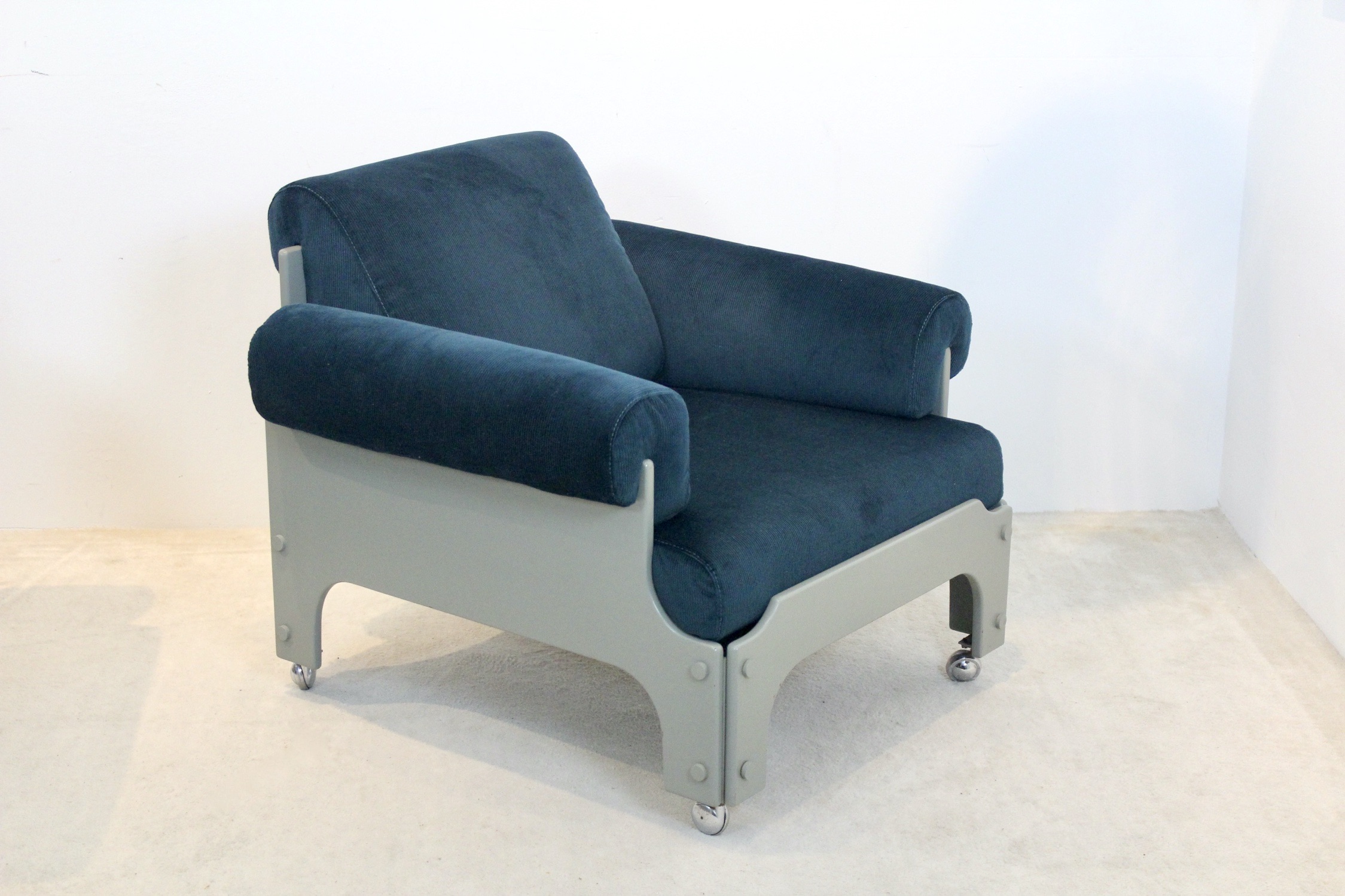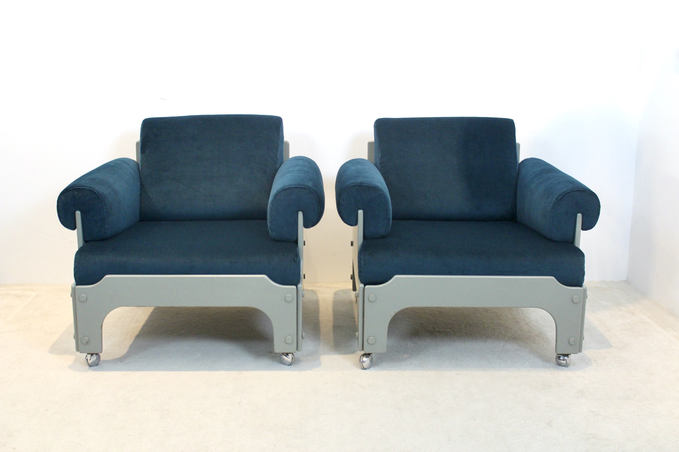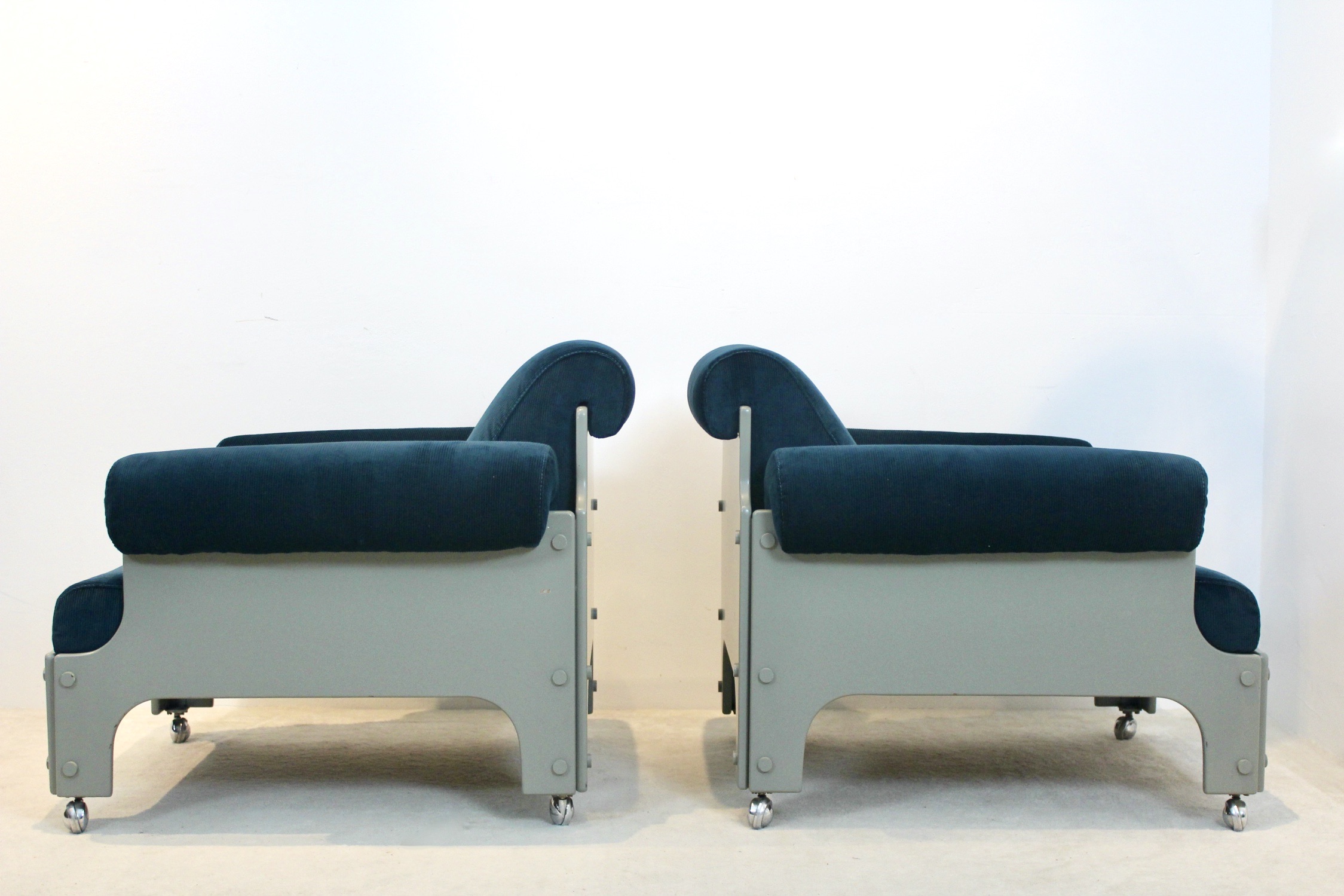 A rare and striking pair of SZ 85 lounge chairs designed by Jan Pieter Berghoef for Spectrum in the 1968/1969 (signed). These bold, industrial-style armchairs embody the forward-thinking spirit of Dutch modernism with an unmistakably architectural presence. Each chair features a lacquered multiplex frame in a soft gray hue, contrasted by deep petrol blue corduroy upholstery, giving them a tactile richness and sculptural silhouette. The integrated casters provide practical mobility without compromising their aesthetic integrity.