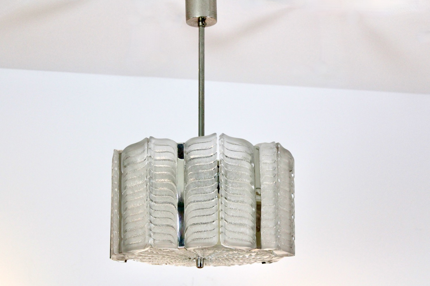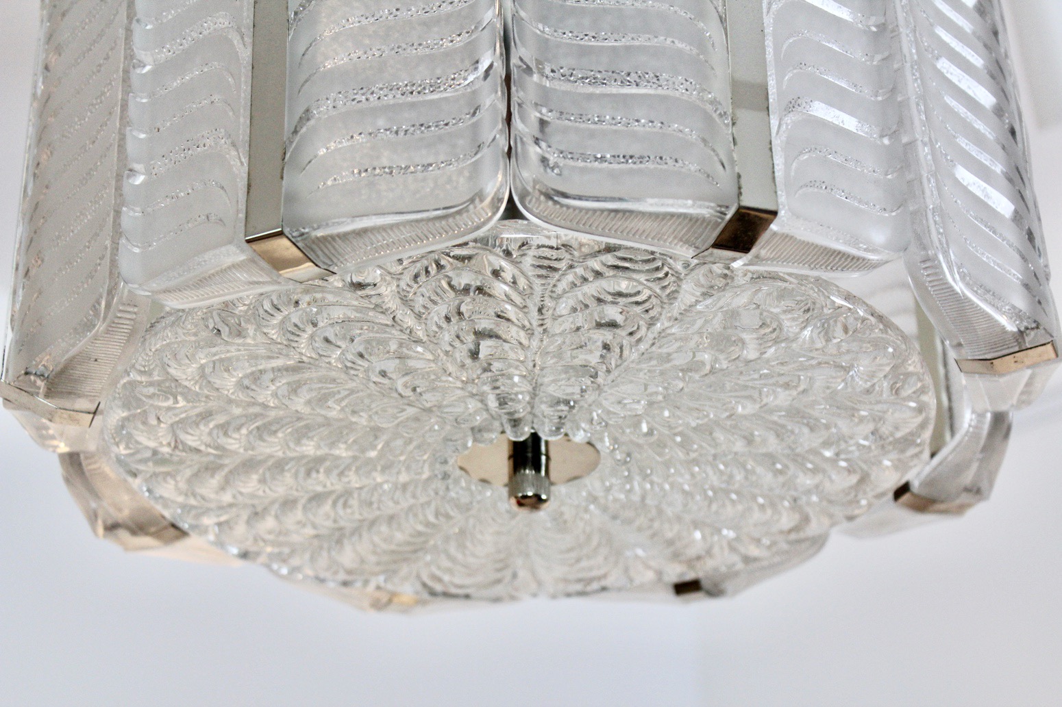 A beautiful Austrian chandelier in textured glass and nickel-plated, designed and executed by Kalmar Vienna. Nicely drum shaped pendant with a Nickel-plated metal frame with textured ice glass in an elegant Chevron shape. Underneath there is a round glass disk, fixed with a nickel-plated bolt in the center. Manufactured by J.T. Kalmar circa late 1950s. In very good condition and heavy glass. Making a wonderful light.