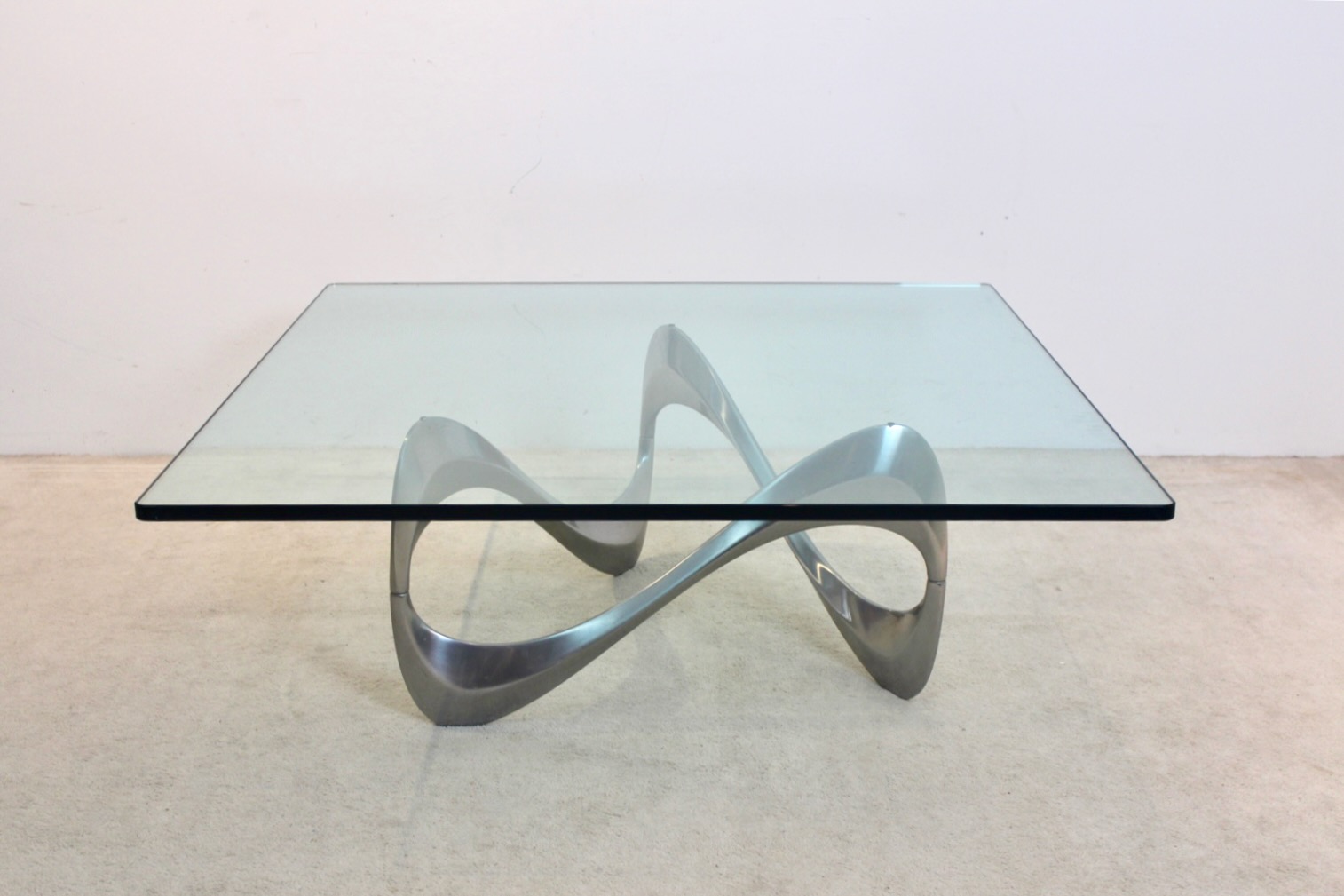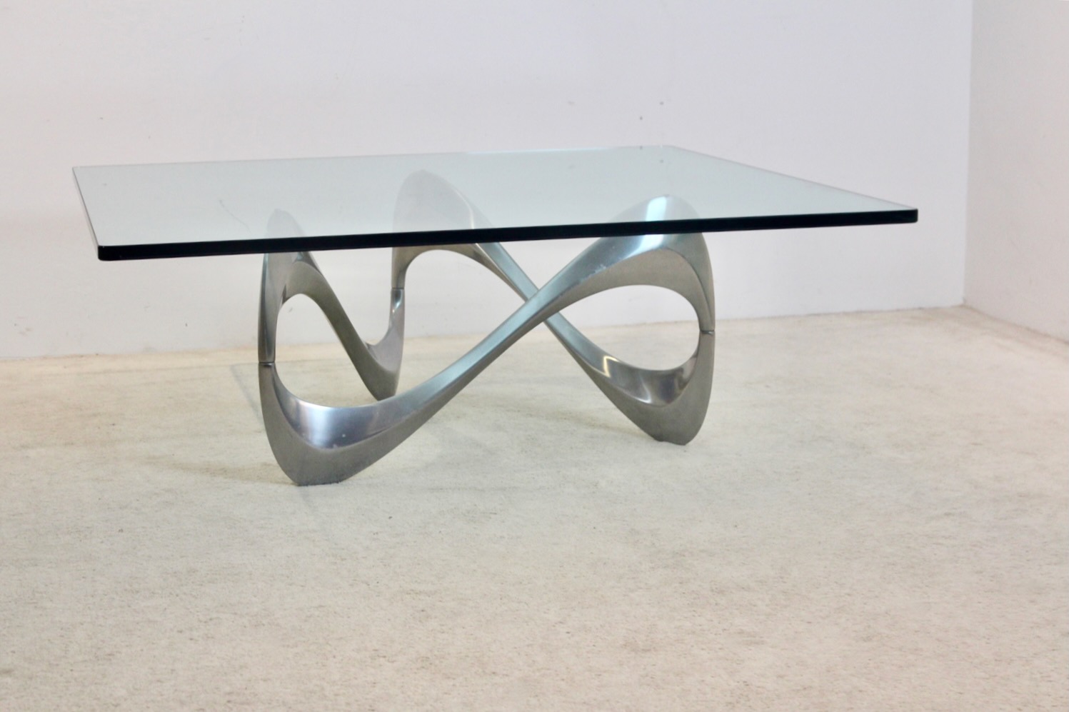 A rare and sculptural "Snake" coffee table designed by celebrated German sculptor Knut Hesterberg for Ronald Schmitt in the 1960s. This piece exemplifies the fluid biomorphic aesthetic characteristic of Hesterberg’s most iconic works. The polished aluminum base forms a continuous, looping structure — a seamless blend of art and function. The table is topped with a substantial square glass surface, providing a stunning juxtaposition of transparency and sculptural form. The minimalist glass top allows the organic curves of the base to remain the visual focus, offering a dynamic centerpiece from every angle. This table is not just a piece of furniture — it's a functional sculpture, making it ideal for collectors, designers, and connoisseurs of mid-century modern design.