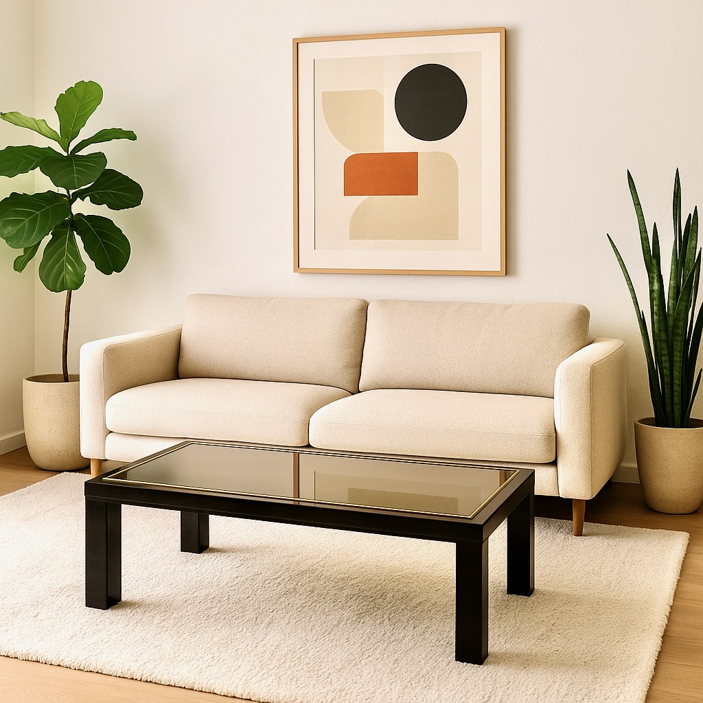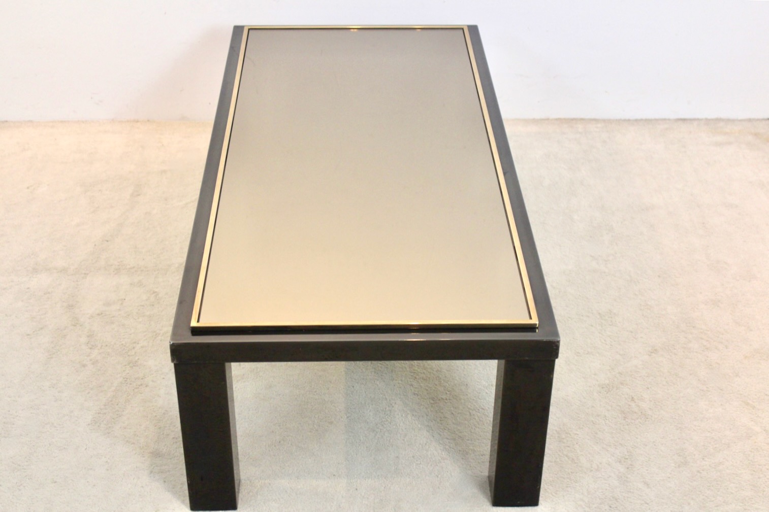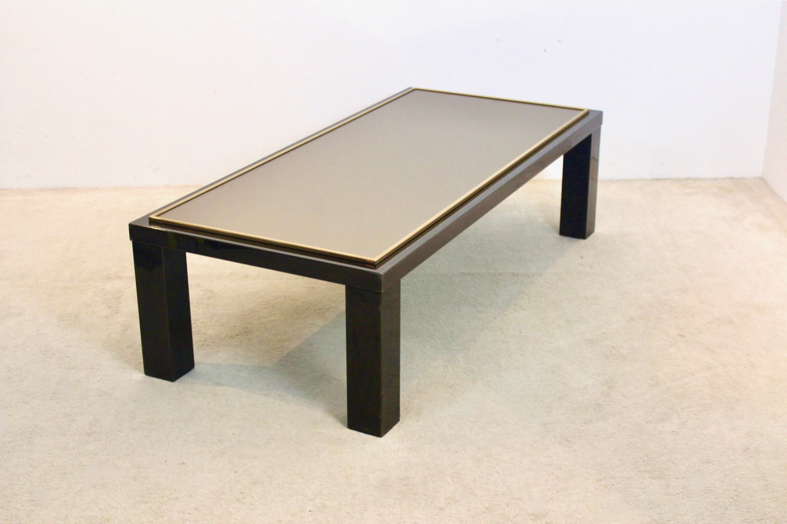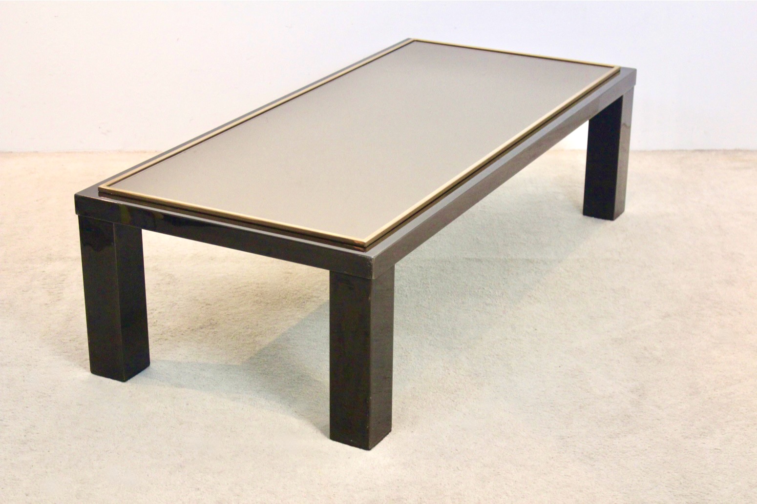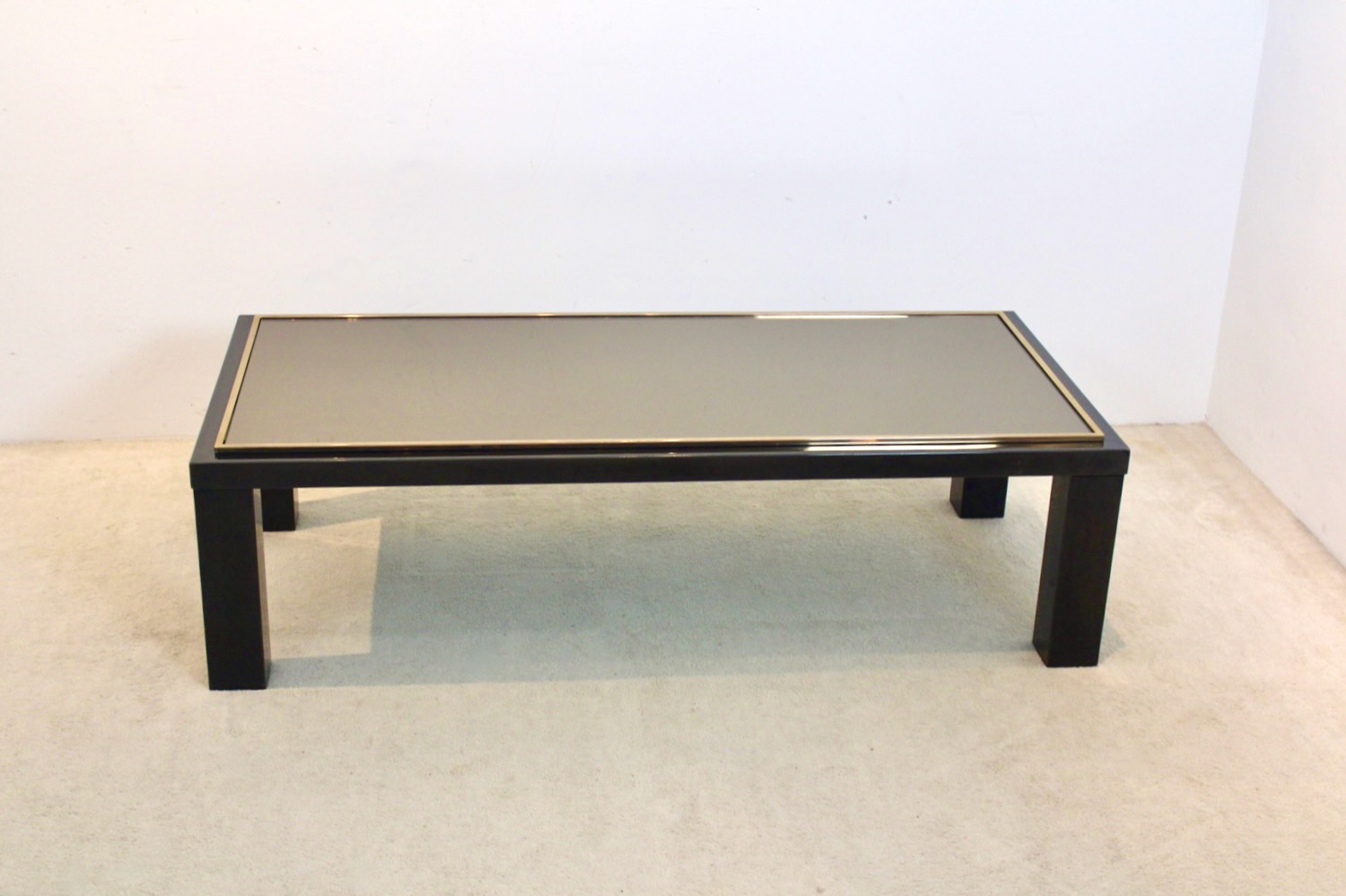 Refined Mid-Century Modern Coffee Table by Belgochrom, crafted in Belgium in the 1970s. This elegant piece showcases the brand’s signature blend of modernist form and luxurious materials. The table features a sleek black lacquered frame with bold, geometric legs, embodying the minimalist aesthetic of the era. Its top is composed of smoked mirrored glass, bordered with a slim 23carat Goldplated trim that adds a touch of understated glamour. The materials are impeccably balanced—reflective, weighty, and architecturally precise.