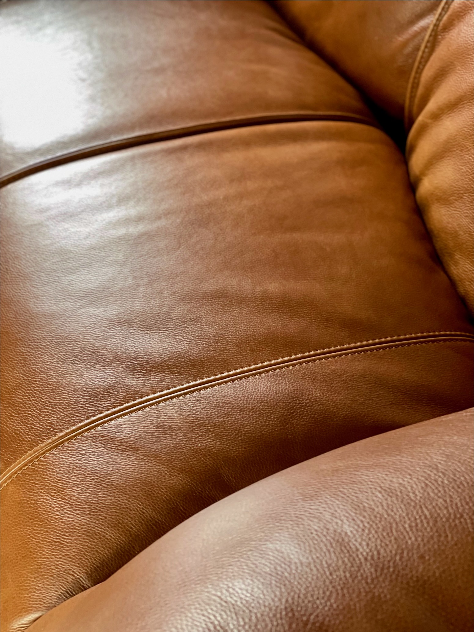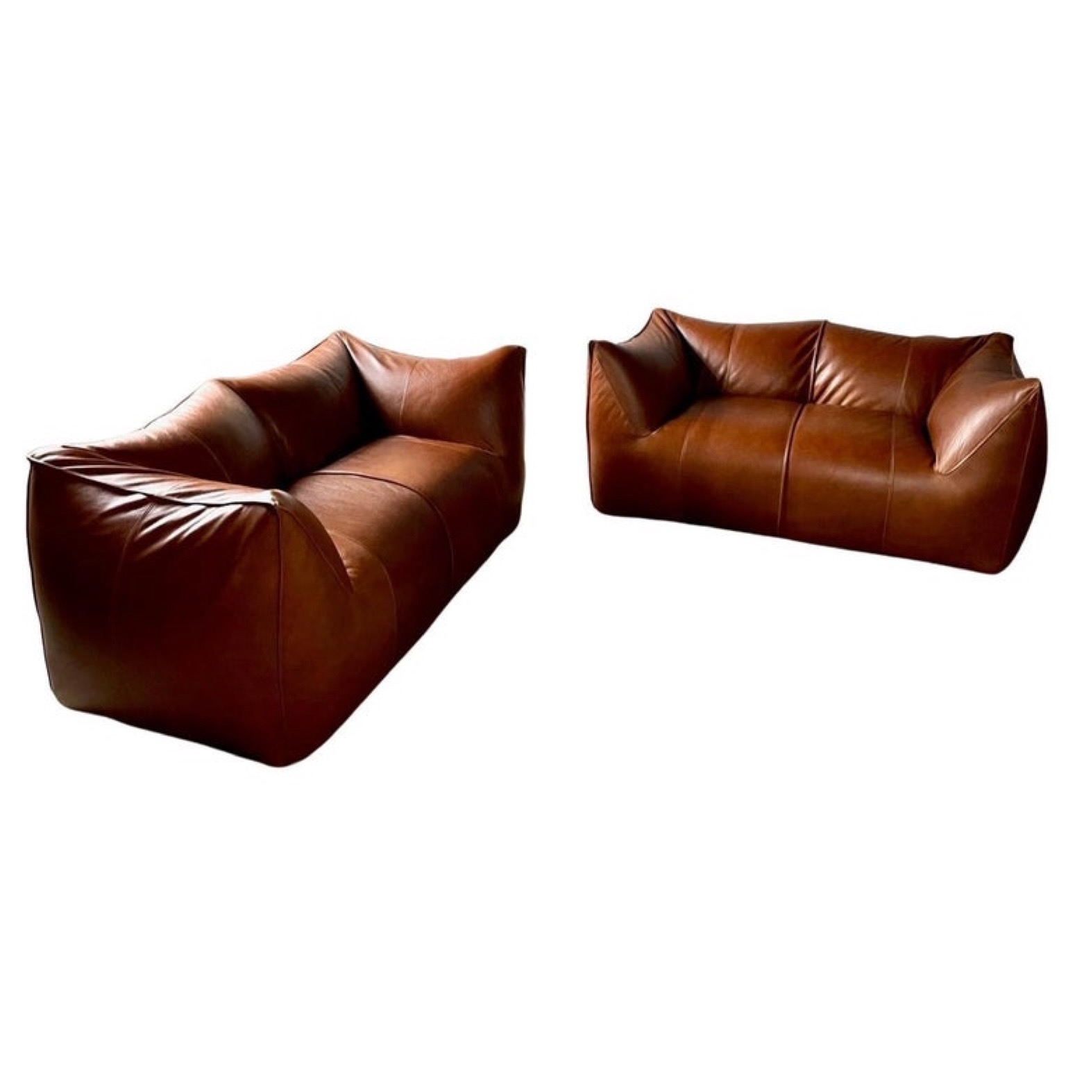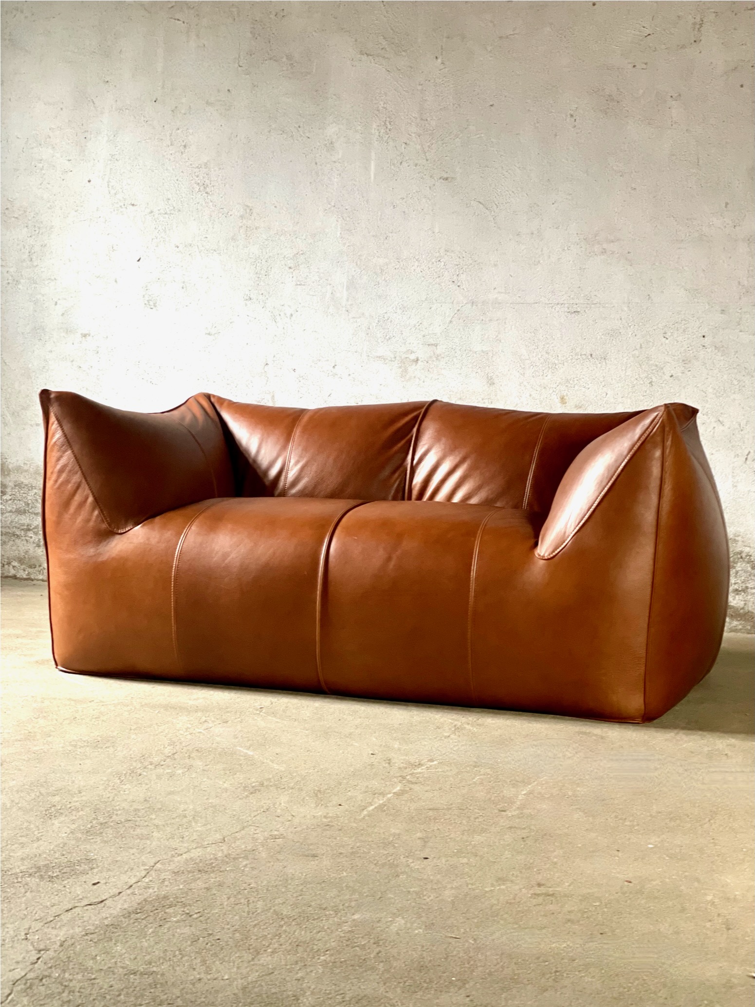 Amazing stock of three Le Bambole Sofa’s by Mario Bellini in Cognac leather. Le Bambole sofa is a design classic created by Italian architect and designer Mario Bellini in 1972. The sofa's name translates to "the dolls" in Italian, which refers to the soft, organic shapes and curves of the design. These sofa’s genuine from 1975 (marked) and are totally newly upholstered with excellent soft aniline leather, in excellent condition. The sofa adjusts to the user's body, creating a comfortable and customizable seating experience.