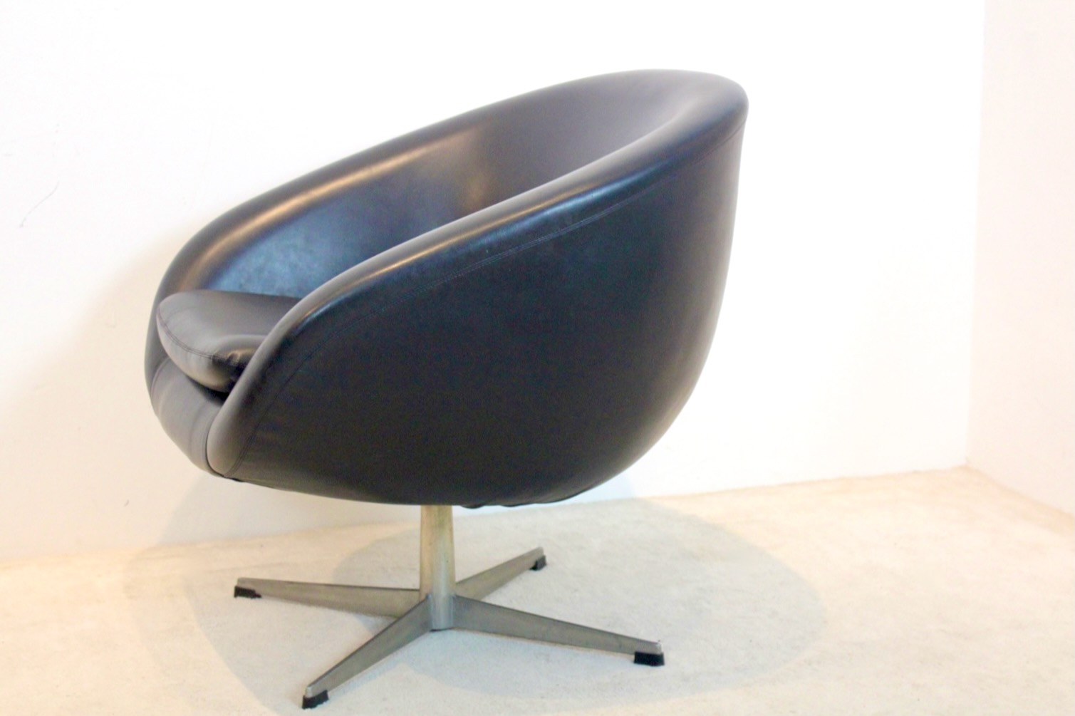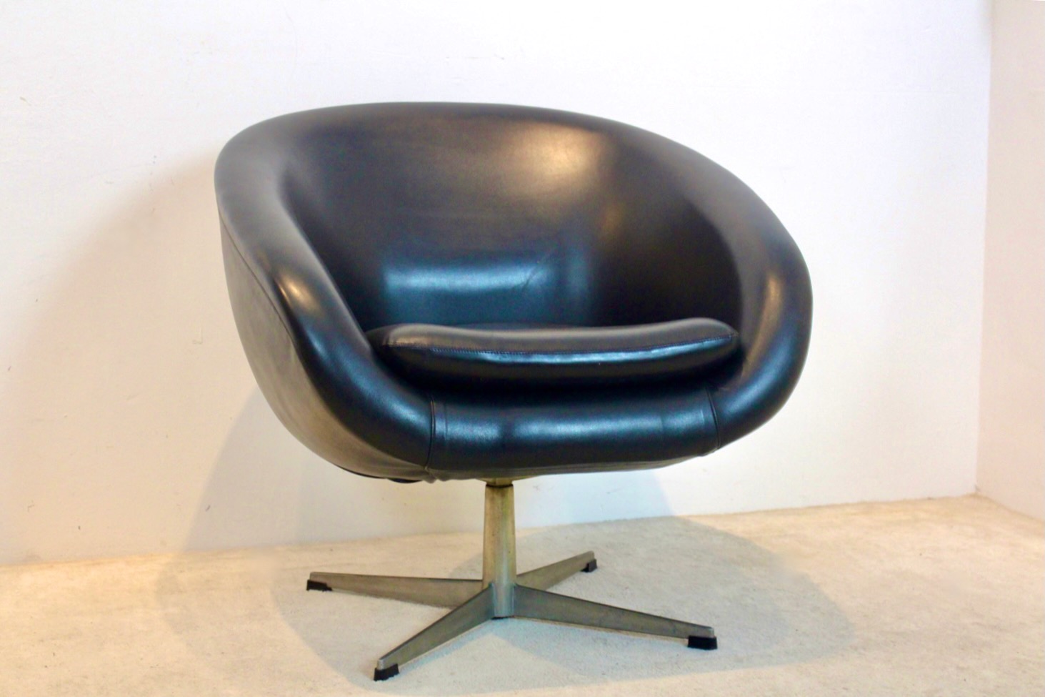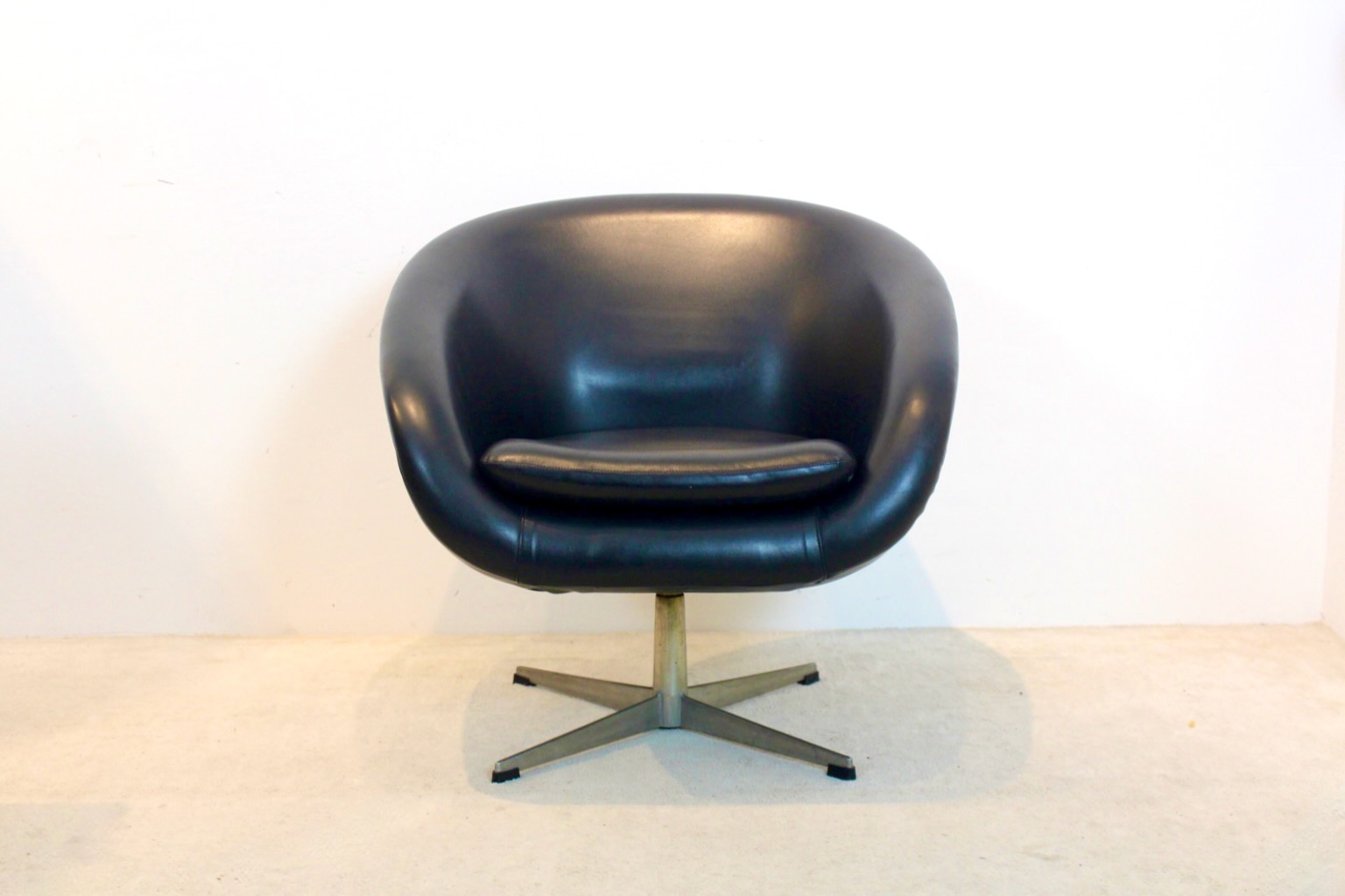 Very comfortable Dutch swivel chair coming from the first owner and in complete original condition. Faux Leather with a stainless-steel base, marked with the production date 22/09/1965. In very good condition and an excellent sit.