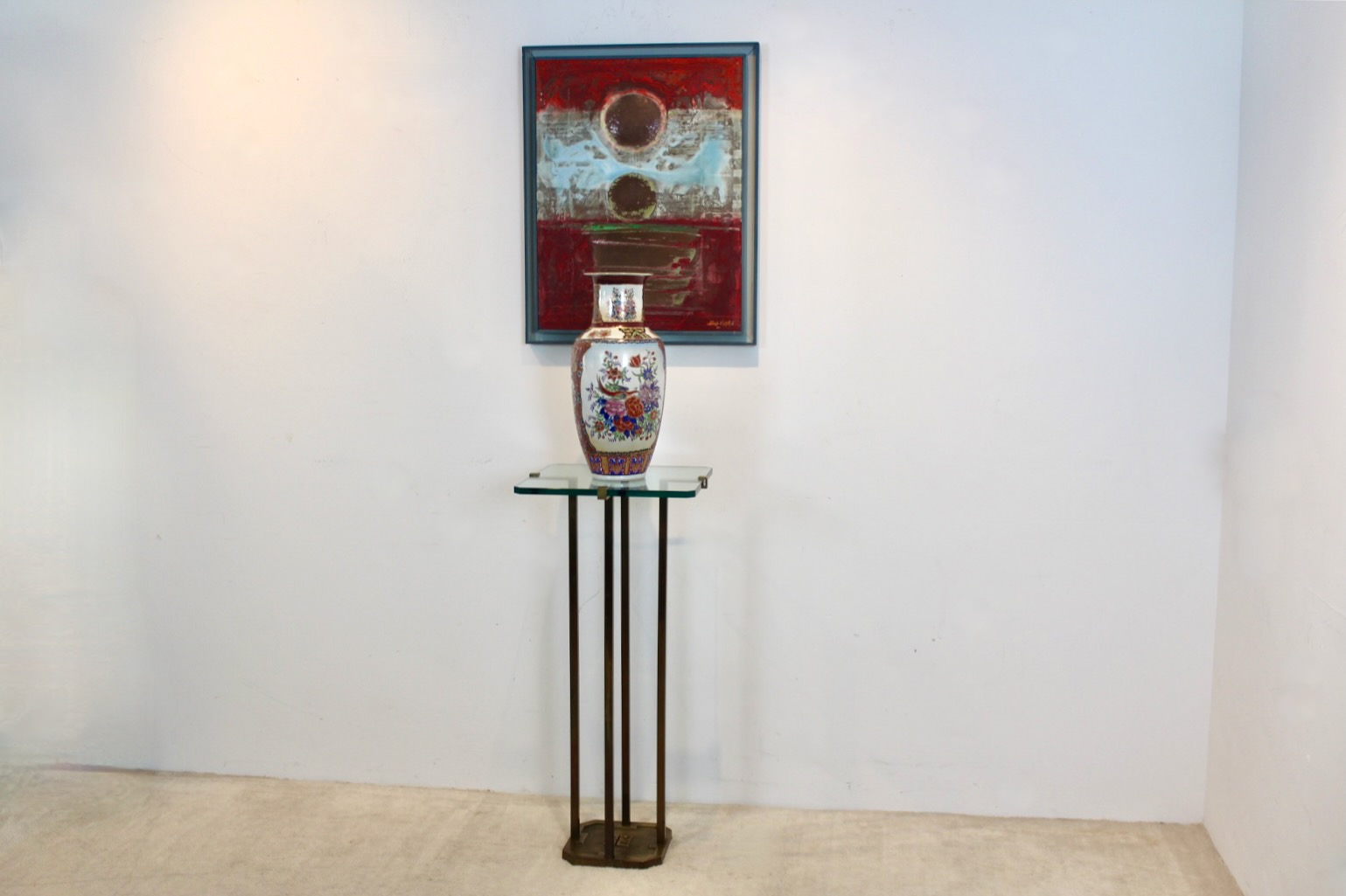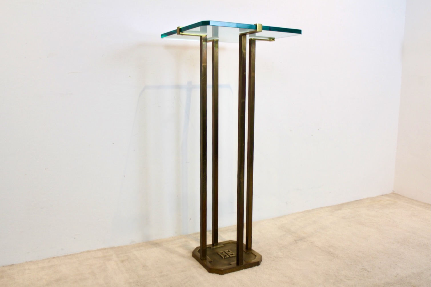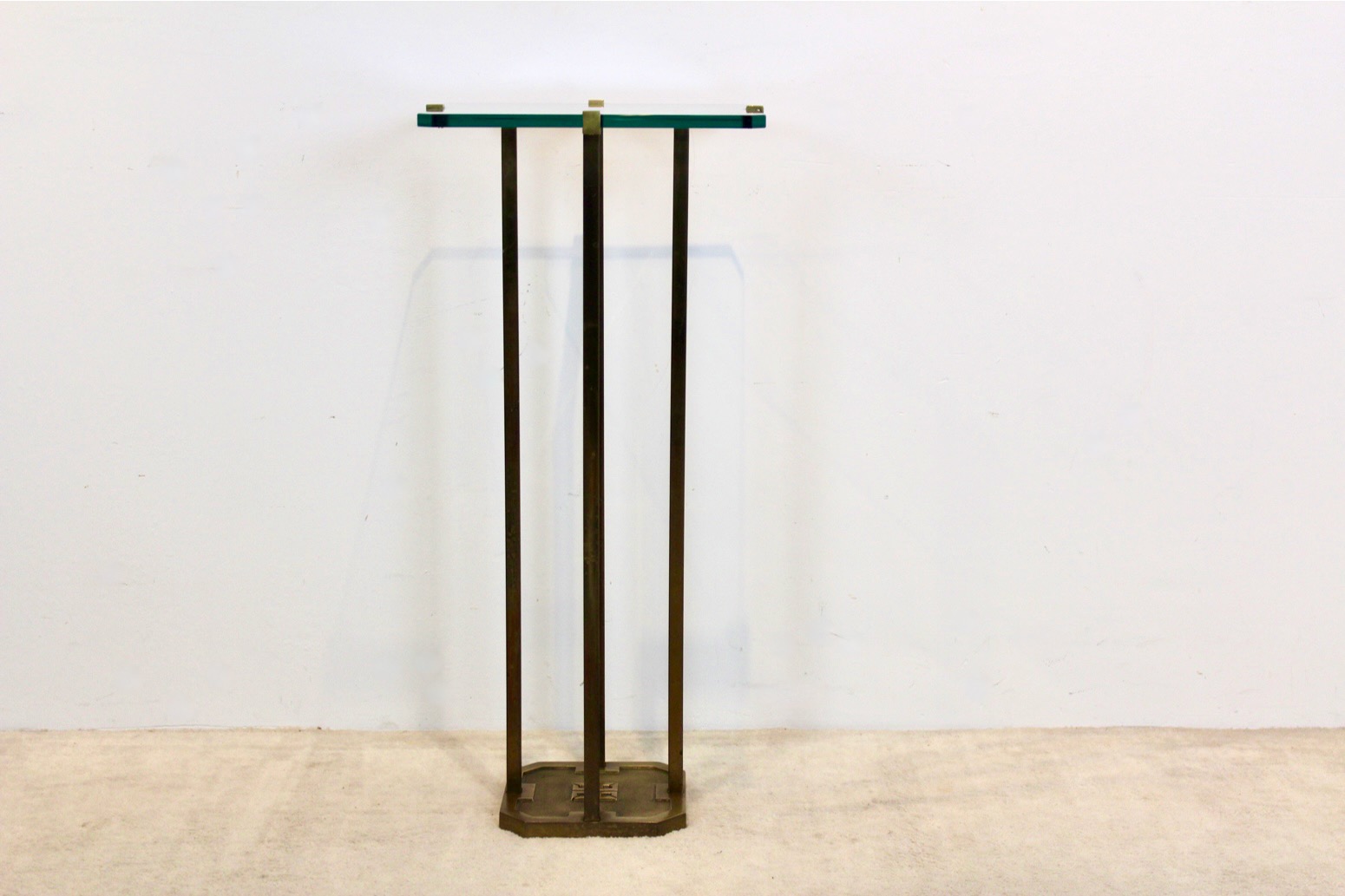 Wonderful and Minimalist Brass and Glass Pedestal Table designed by Peter Ghyczy in the early 1970s in the Netherlands. Born in Budapest, Peter Ghyczy started his career as an architect in Germany and has been living in the Netherlands for many years. His furniture consists of high-grade materials and solid craftsmanship to give every piece a unique quality. Patina is part of the design. The characteristic combinations of brass with glass are custom-made and handcrafted in Holland. The brass base of this pedestal table, is very solid and heavy and features the Ghyczy-logo. The quality glass is not damaged and 2.5cm thick and made out of 1 piece. Very sophisticated design, rare to find in this quality, highly decorative and in very good condition.