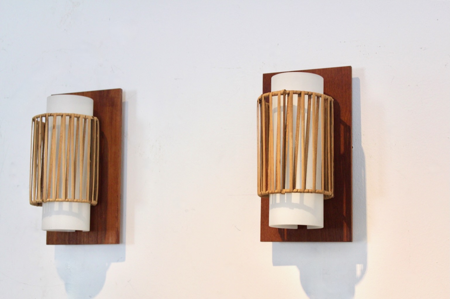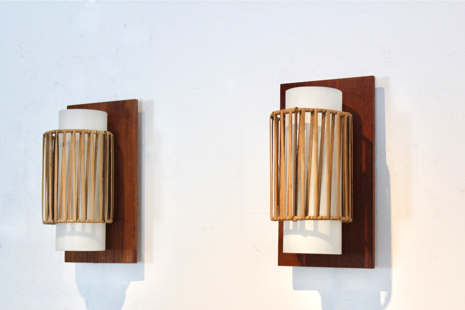 Natural pair of Rattan, Teak and Opaline Glass Wall lights