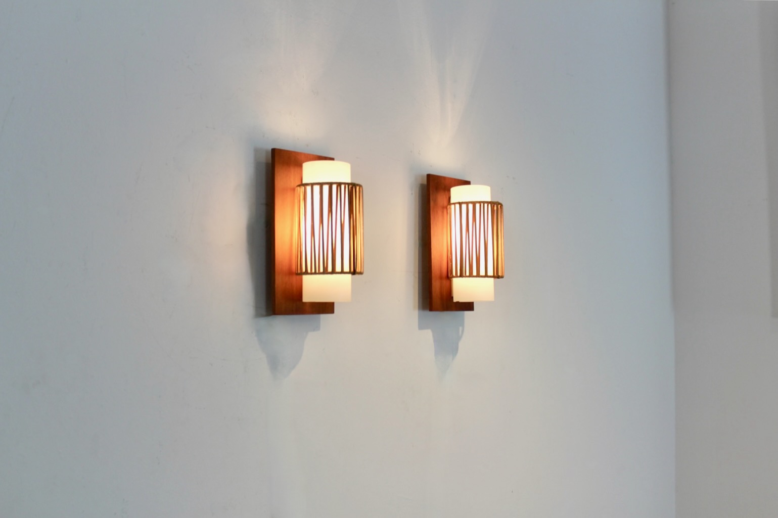 Sophisticated pair of Opaline Glass Wall Sconces with a transparent Natural Rattan shade produced in the Netherlands in the ‘60’s. This set comes in a very rare version never seen. Each lamp has a handsome Teak rectangle back plate which creates a nice geometrical pattern combined with the round curves of the glass and the rattan. In very good condition and original with normal wear. The beautiful set comes with a very nice lighting effect.