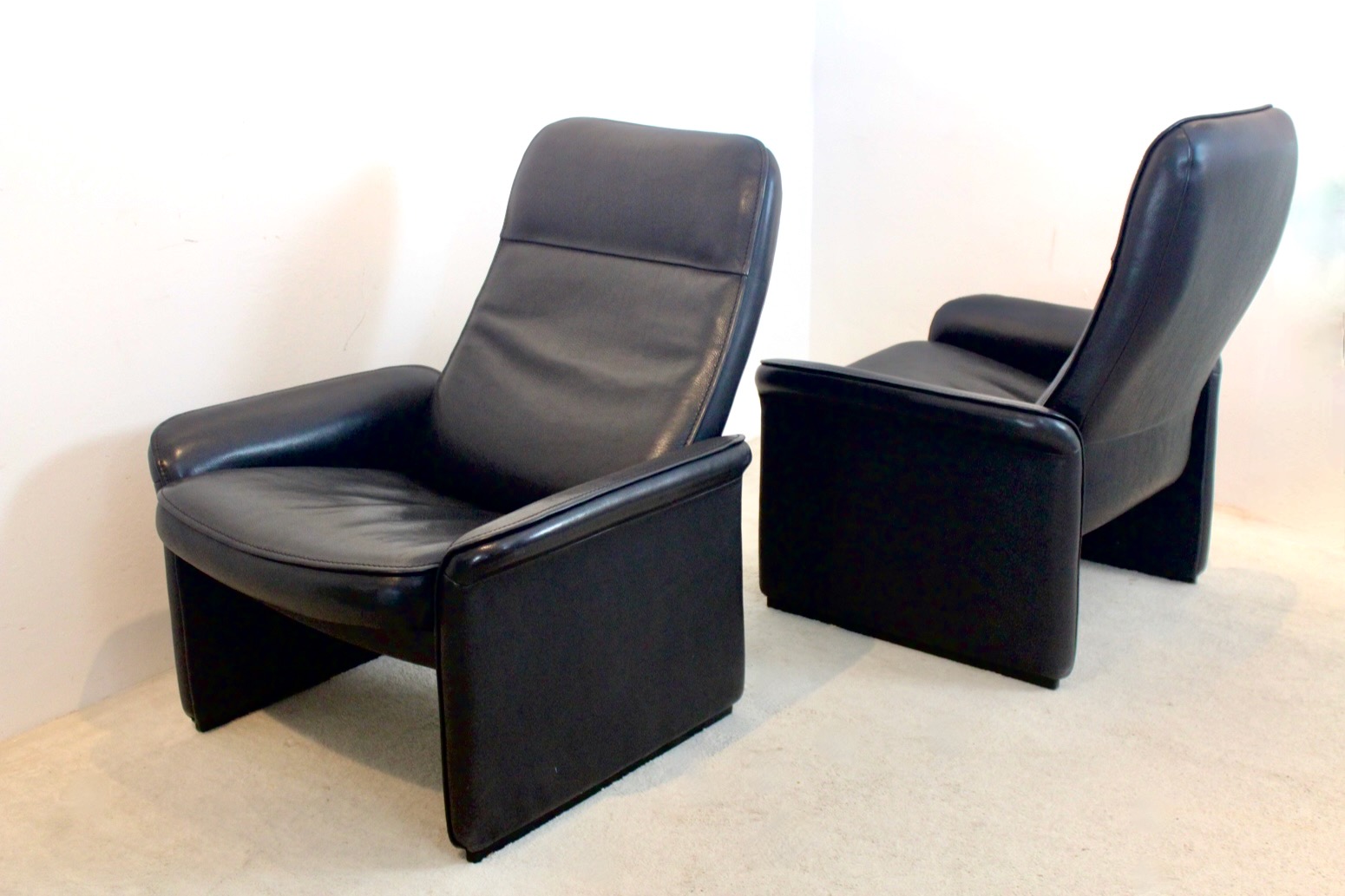Exceptional pair of De Sede DS-50 adjustable Lounge Chairs with a set of Ottomans in thick Black Buffalo Leather. The fine leather is in very good condition, cleaned and reinforced and has a beautiful patina. Manufactured in the ‘70’s on a heavy frame of solid wood with the thickest leather of the Sede collection. Wear consistent with age and use, no rips or tears. Both lounge chairs have a reclining mechanism allowing you to recline the lounge chairs almost flat if you choose. So, you can adjust the Lounge Chairs in any wanted position for your comfort. The ottoman completes the comfort to the max. A real eye-catcher in your home or office.