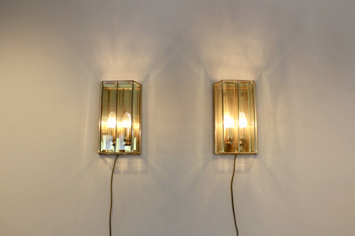 Highly sophisticated pair of Brass and Facet Glass Sconces produced in France, ‘80’s. Each lamp has a handsome Brass back plate and frame and has a beautiful Geometrical pattern with 4 full glass Facet Glass pieces. The beautiful glass fits perfectly in the Brass holders and comes with a beautiful lighting effect. The sconce takes two small E14 bulbs. In very good and original condition.
