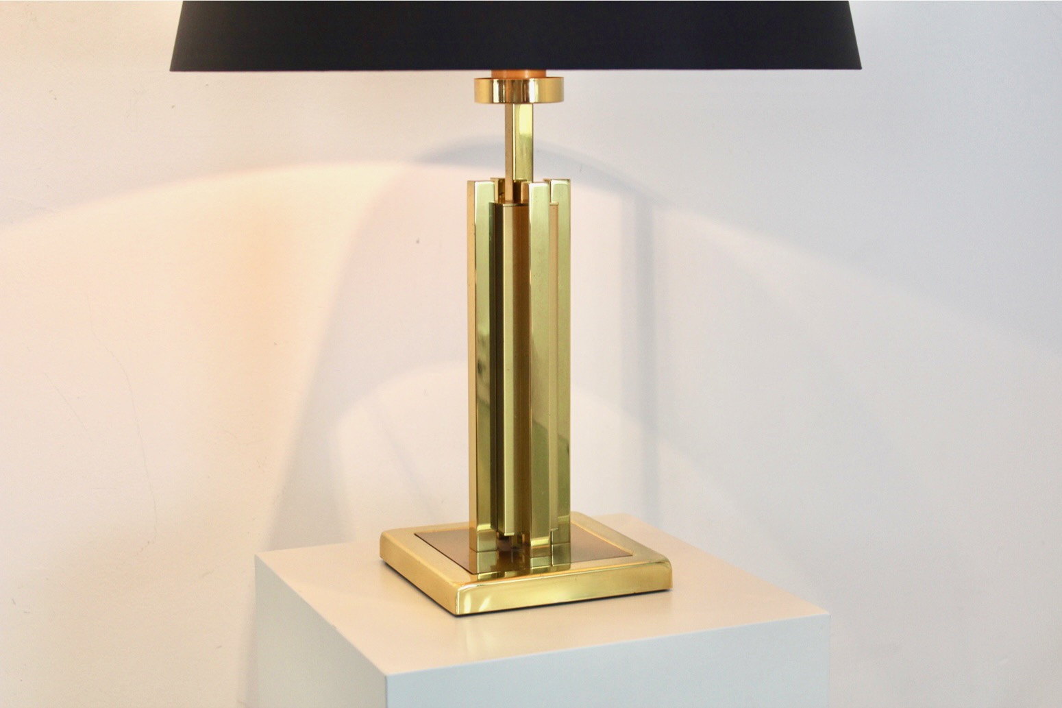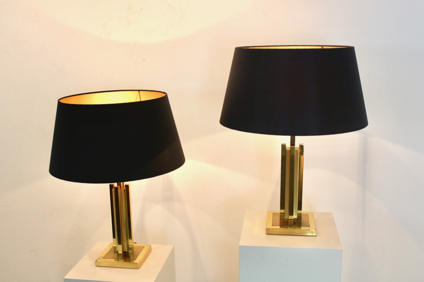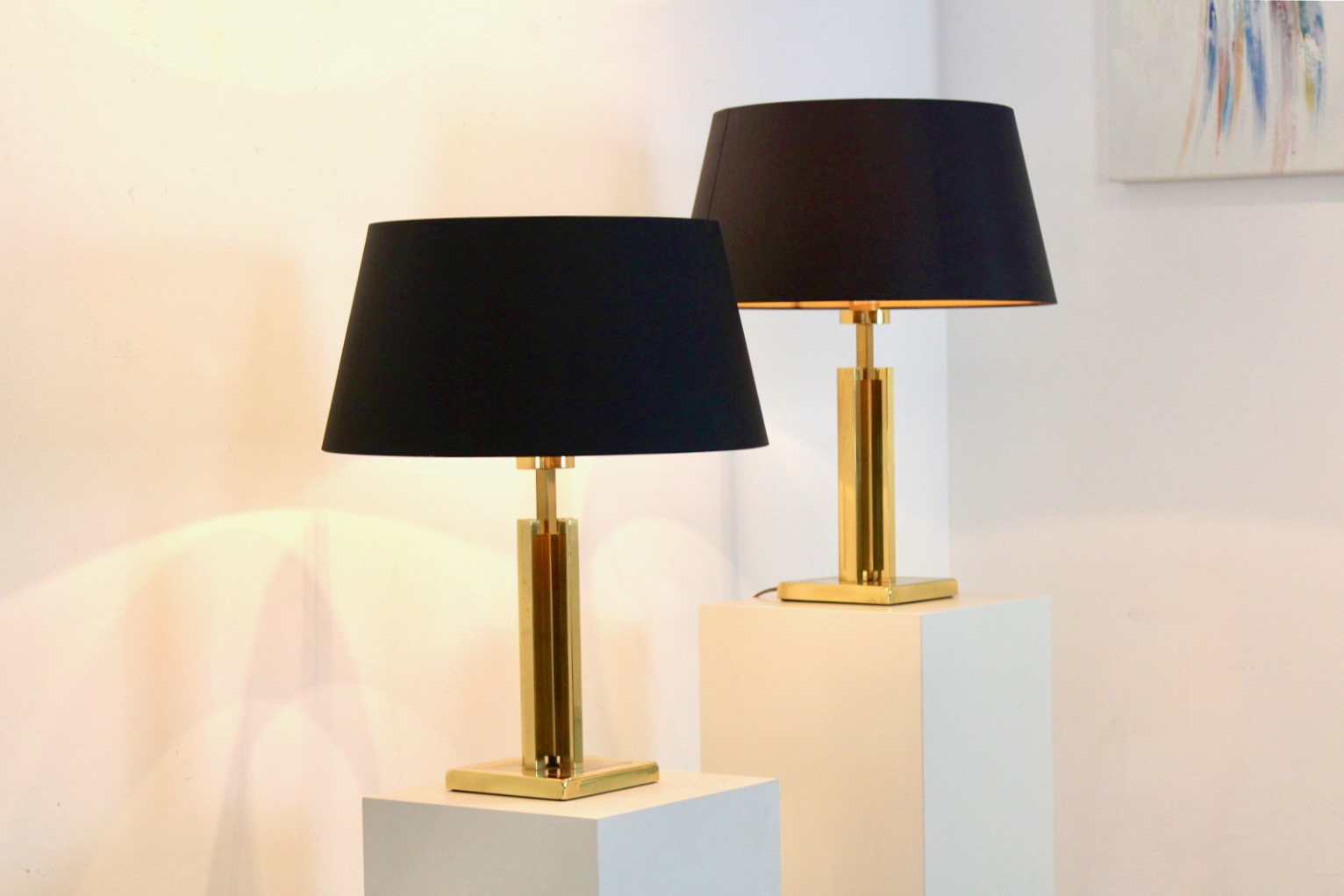 Each lamp features a columnar base constructed from interlocking brass elements, creating a subtle interplay of depth and light. The original black empire-style shades provide a bold contrast and complete the sophisticated look. Their balanced proportions and minimalist elegance make them ideal for any interior. These lamps are a superb example of Boulanger’s high-quality production and mid-century Belgian design sensibility. They would make a refined addition to a living room, bedroom, or office space.