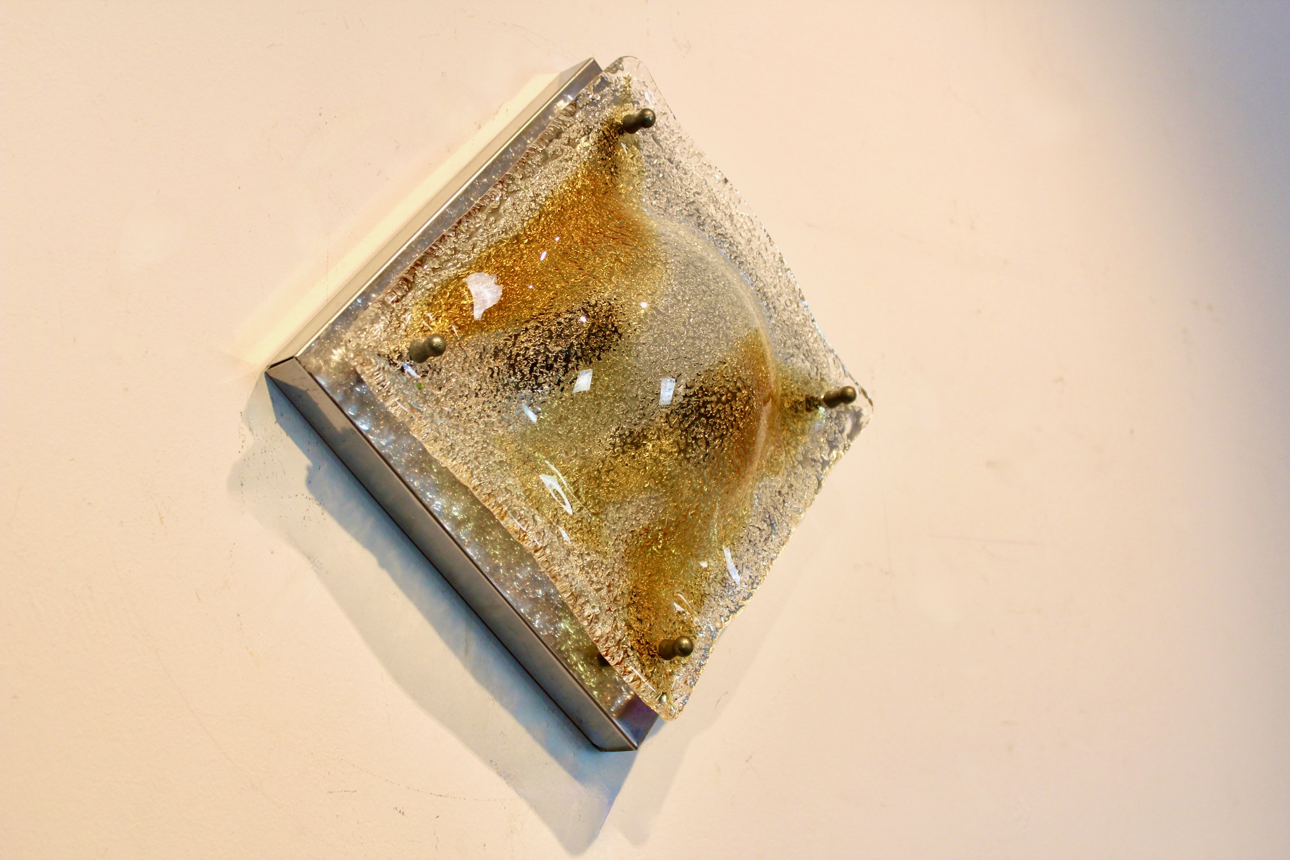 A refined pair of Italian mid-century Murano glass wall lamps, designed by Toni Zuccheri for Venini, circa 1970s. Each sconce features a square textured and convex Murano glass diffuser with a richly textured surface and amber and gold inclusions, mounted on a polished chrome backplate. When illuminated, the glass comes alive with a warm, organic radiance, characteristic of Zuccheri’s poetic approach to light and material.