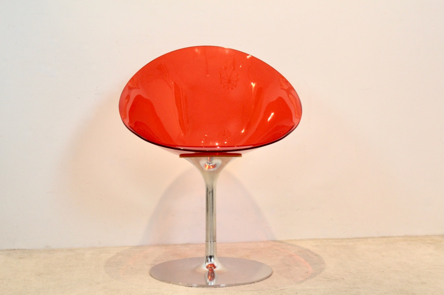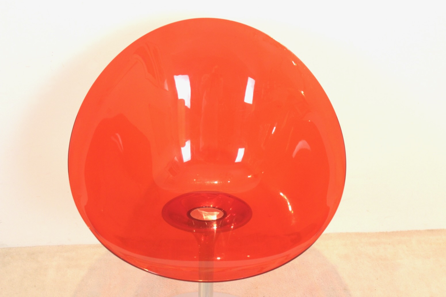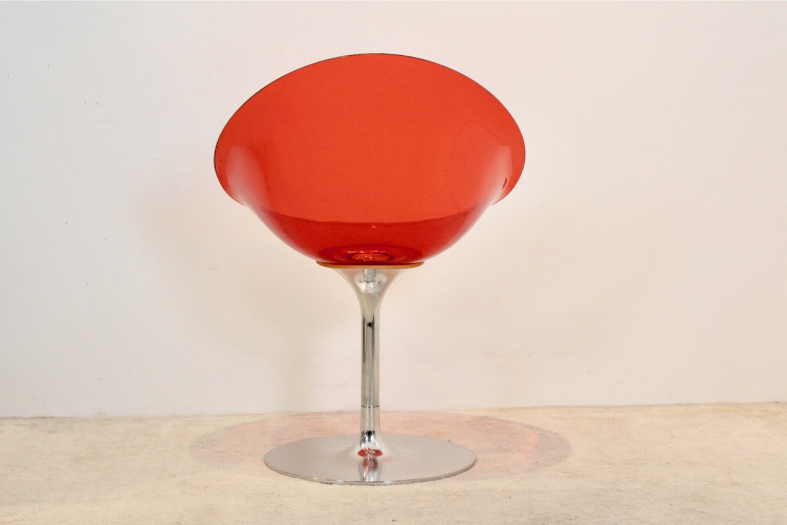 Iconic Eros Chair, designed by Philippe Starck for Kartell, Italy. This striking piece exemplifies Starck’s masterful balance of form, function, and futuristic elegance. Crafted from vibrant, translucent red molded polycarbonate, the chair features a sculptural, oval-shaped shell that offers both visual lightness and ergonomic comfort. The single-socket seat is supported by a sleek chromed aluminum pedestal base, creating a floating effect that enhances its modern appeal.