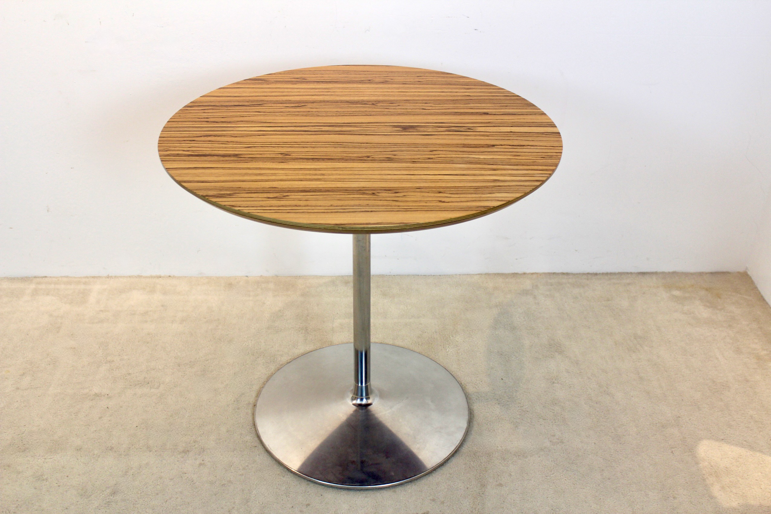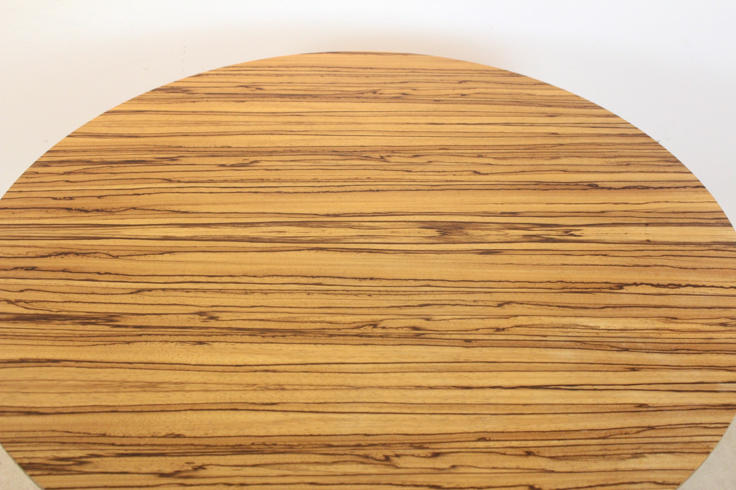 Condition: Excellent vintage condition. The zebrano laminated wood top is exceptionally well preserved, with no visible stains, warping, or structural issues. The surface shows only very very minor signs of age-appropriate wear upon close inspection, consistent with careful use and handling. The table is intact and beautifully figured throughout.