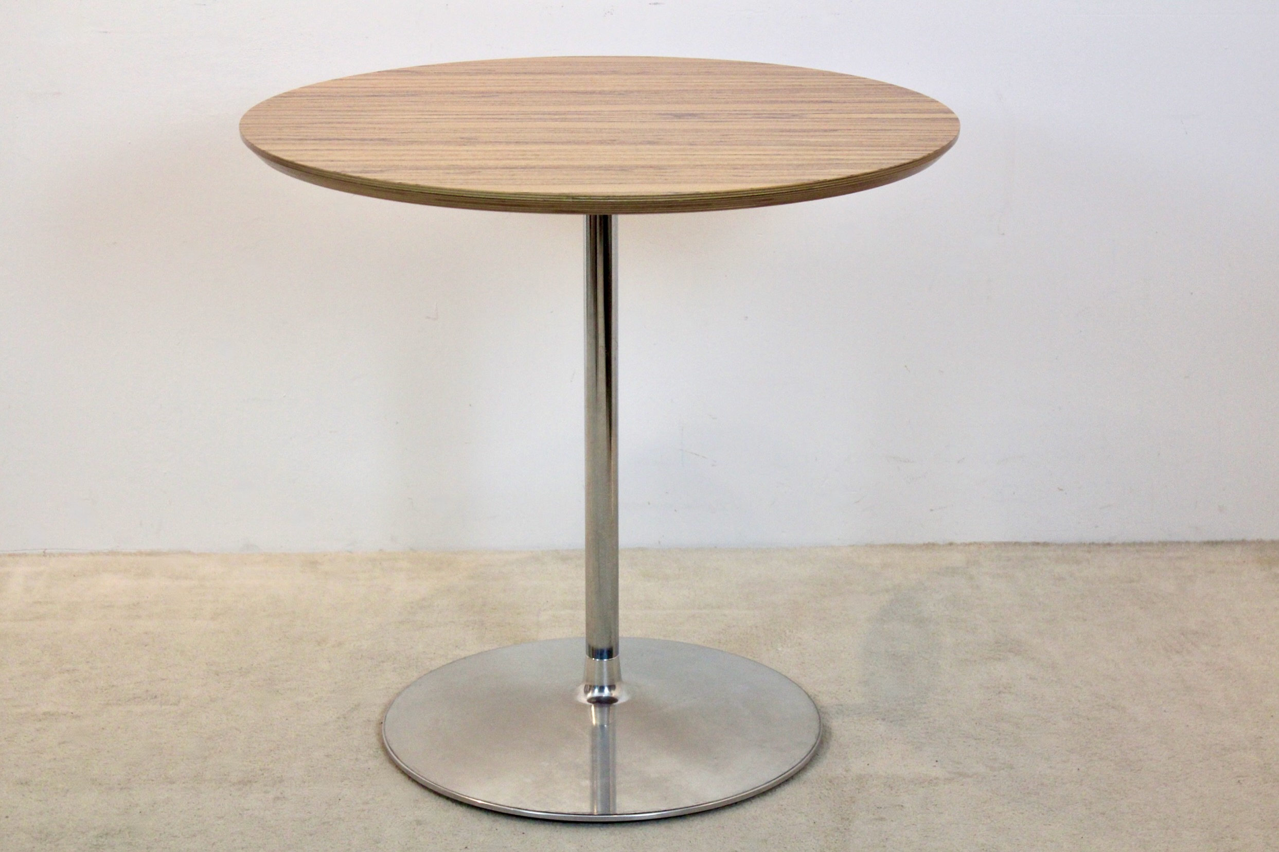 Designed by Pierre Paulin for Artifort, this Circle table exemplifies the designer’s refined modernist approach and mastery of form. Produced in the Netherlands, the table features an aluminum and chrome base with a circular top with a diameter of 80 cm, offering a compact yet confident presence suited to both dining and occasional use. The tabletop is finished in beautifully figured laminated zebrano wood, selected for its expressive linear grain and natural warmth. Preserved in excellent condition, the surface highlights the quality of materials and craftsmanship associated with Artifort’s production.