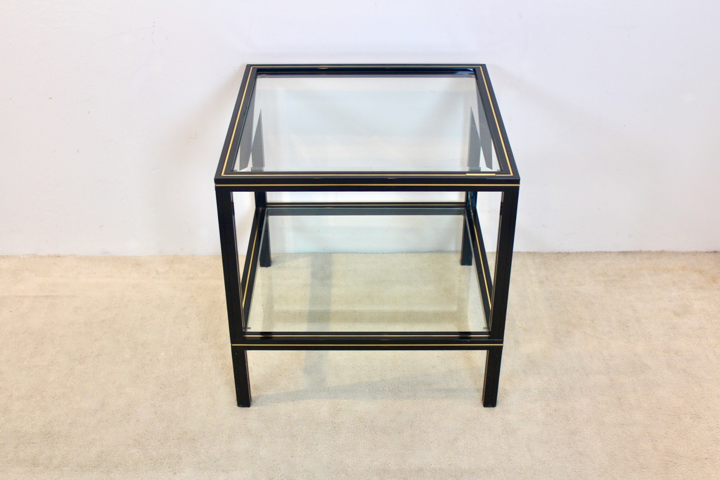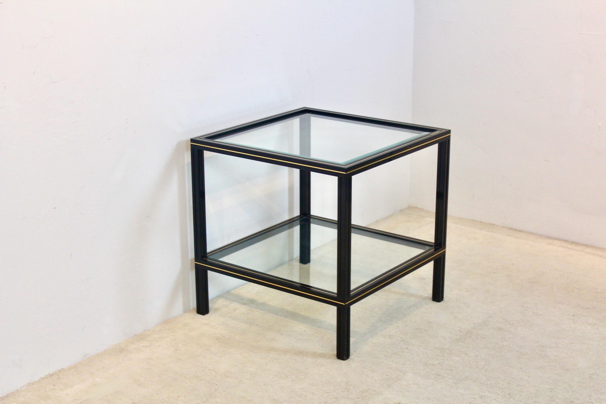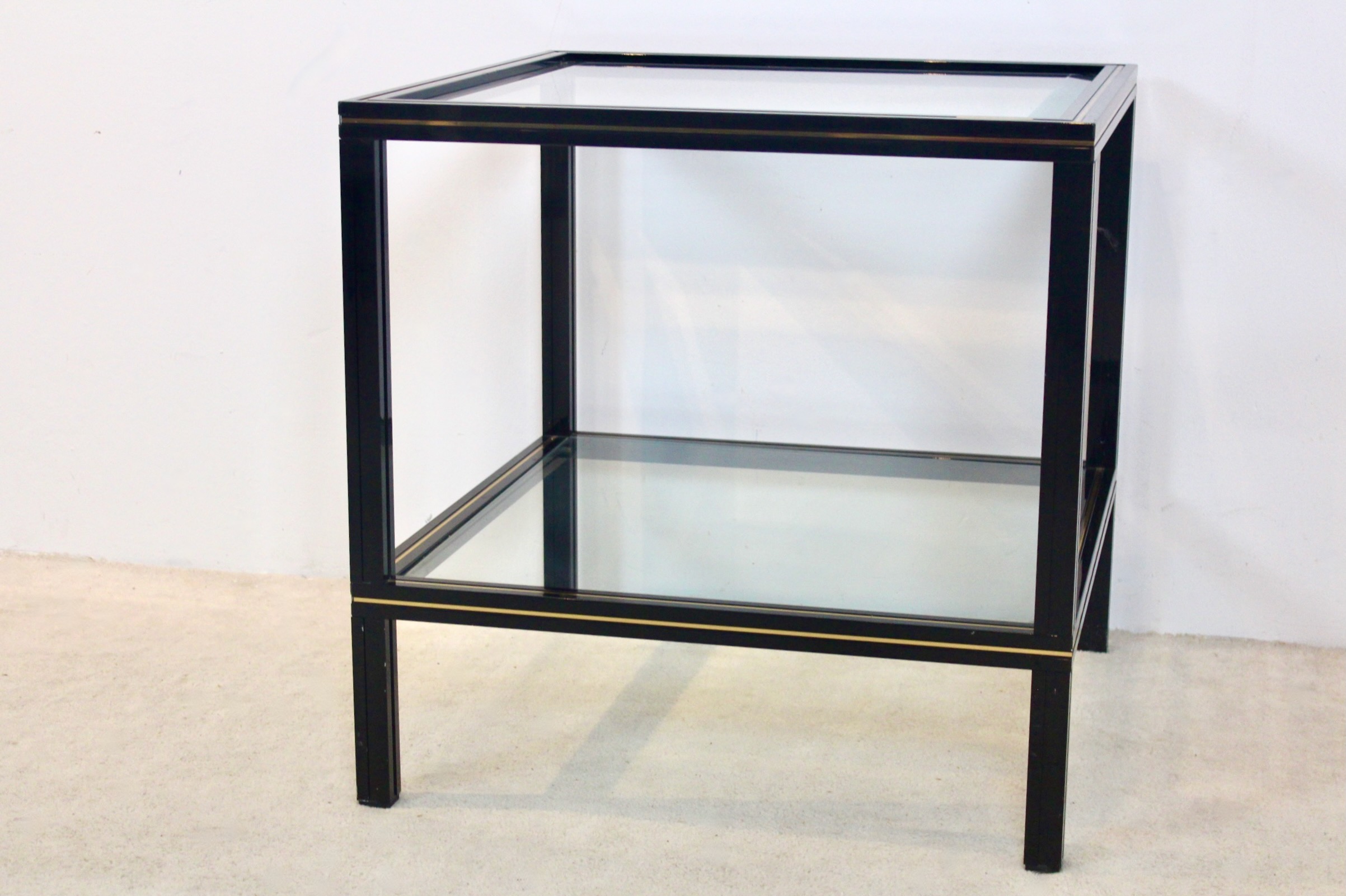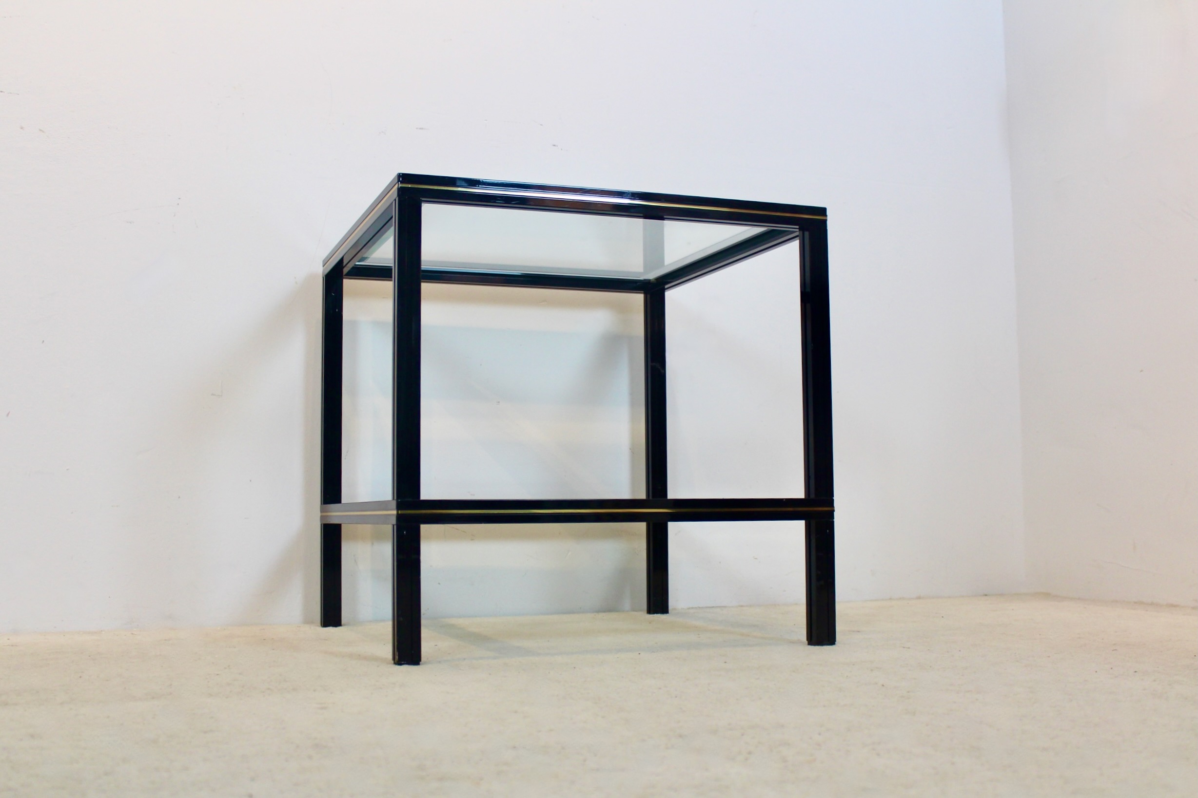 An elegant and timeless side table by Pierre Vandel, emblematic of French luxury design from the 1970s. The table features a sleek black lacquered aluminum frame, subtly accented with fine brass inlay lines, a signature detail of Vandel’s work that adds quiet sophistication without excess ornamentation.