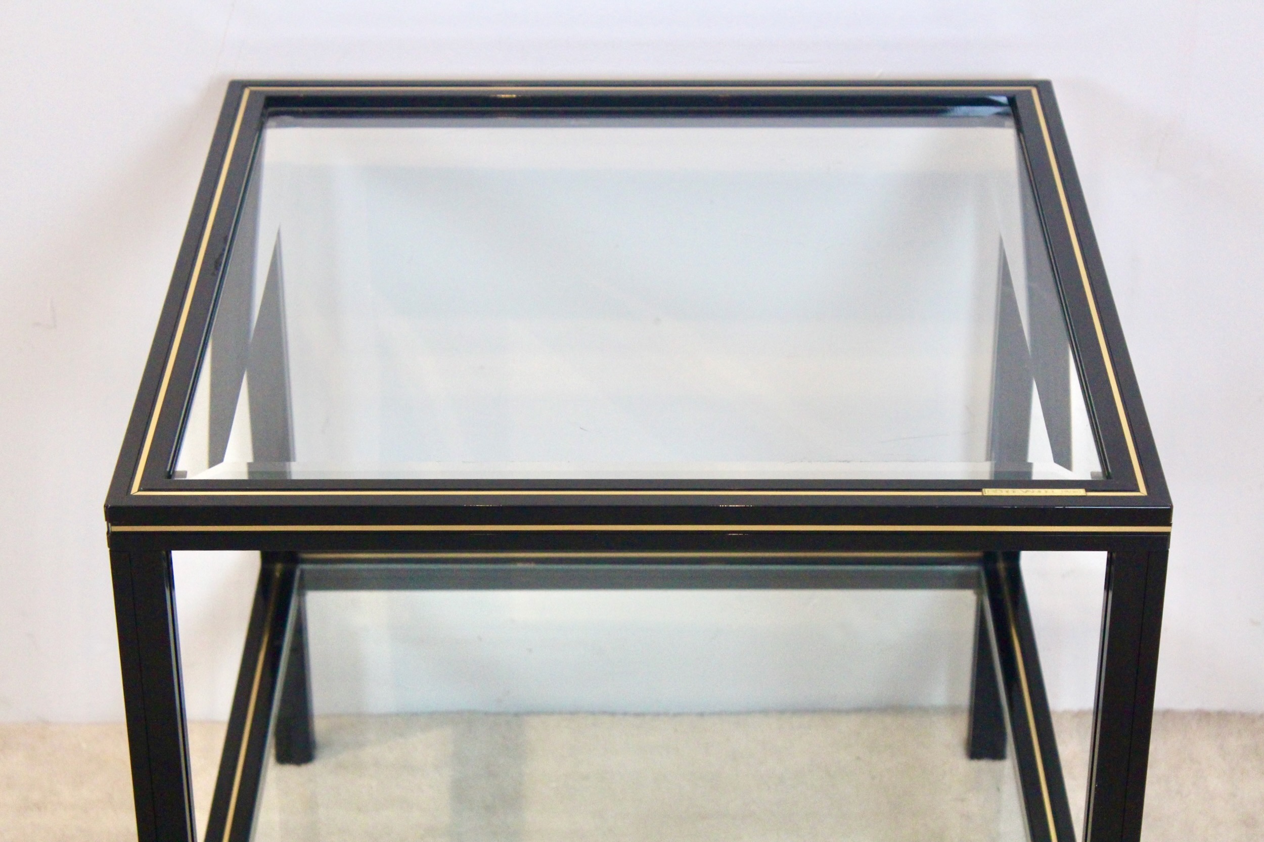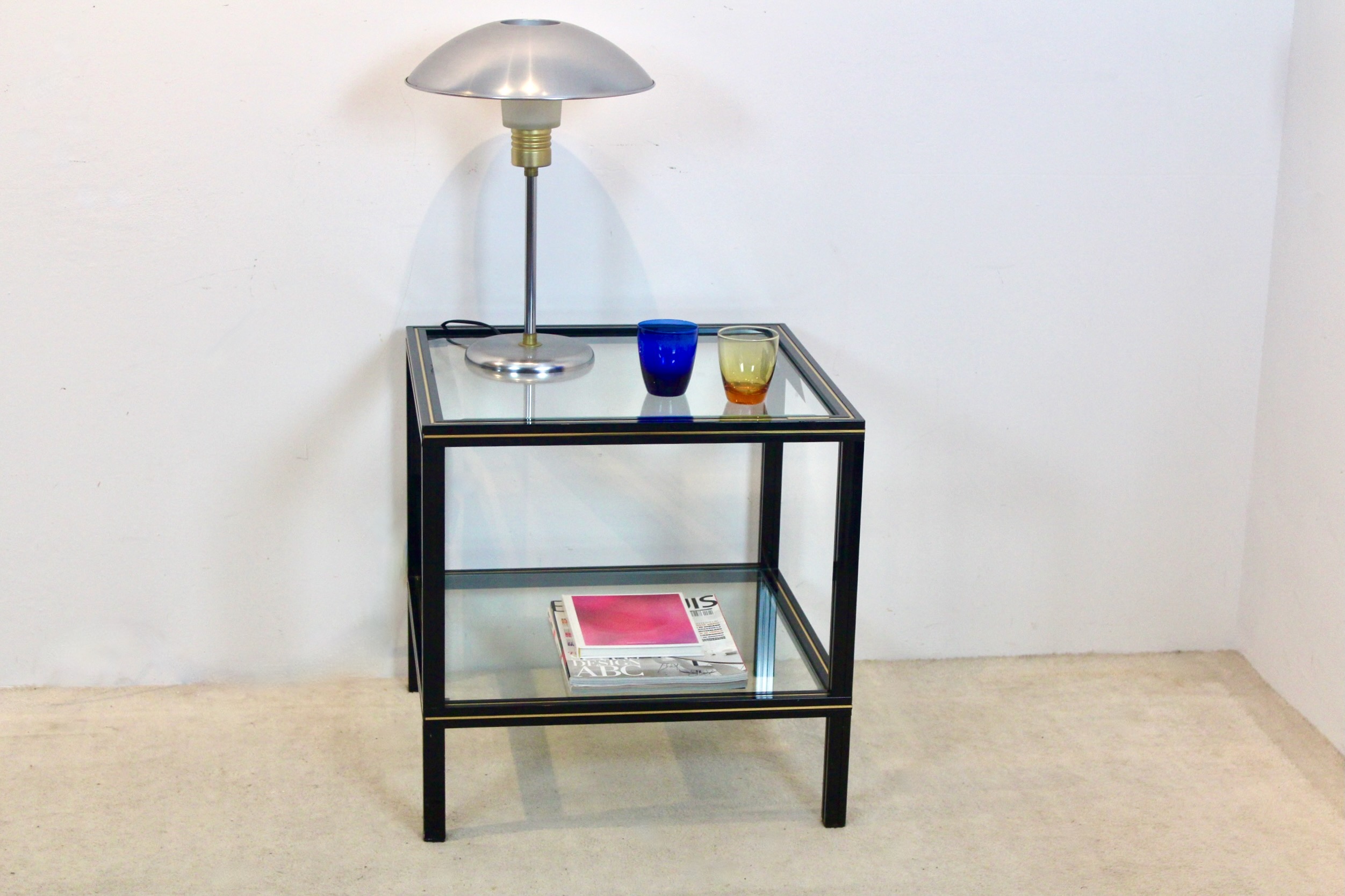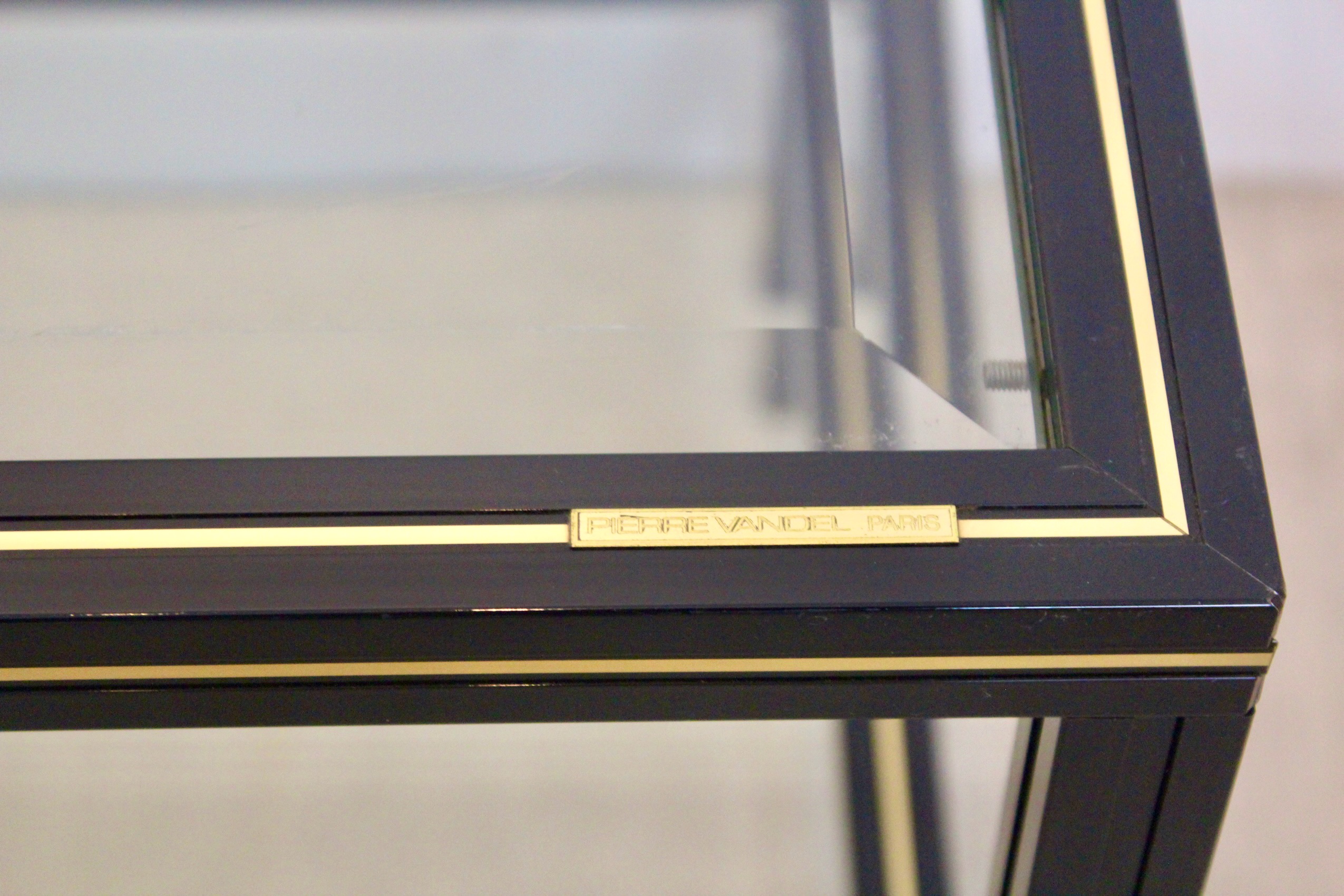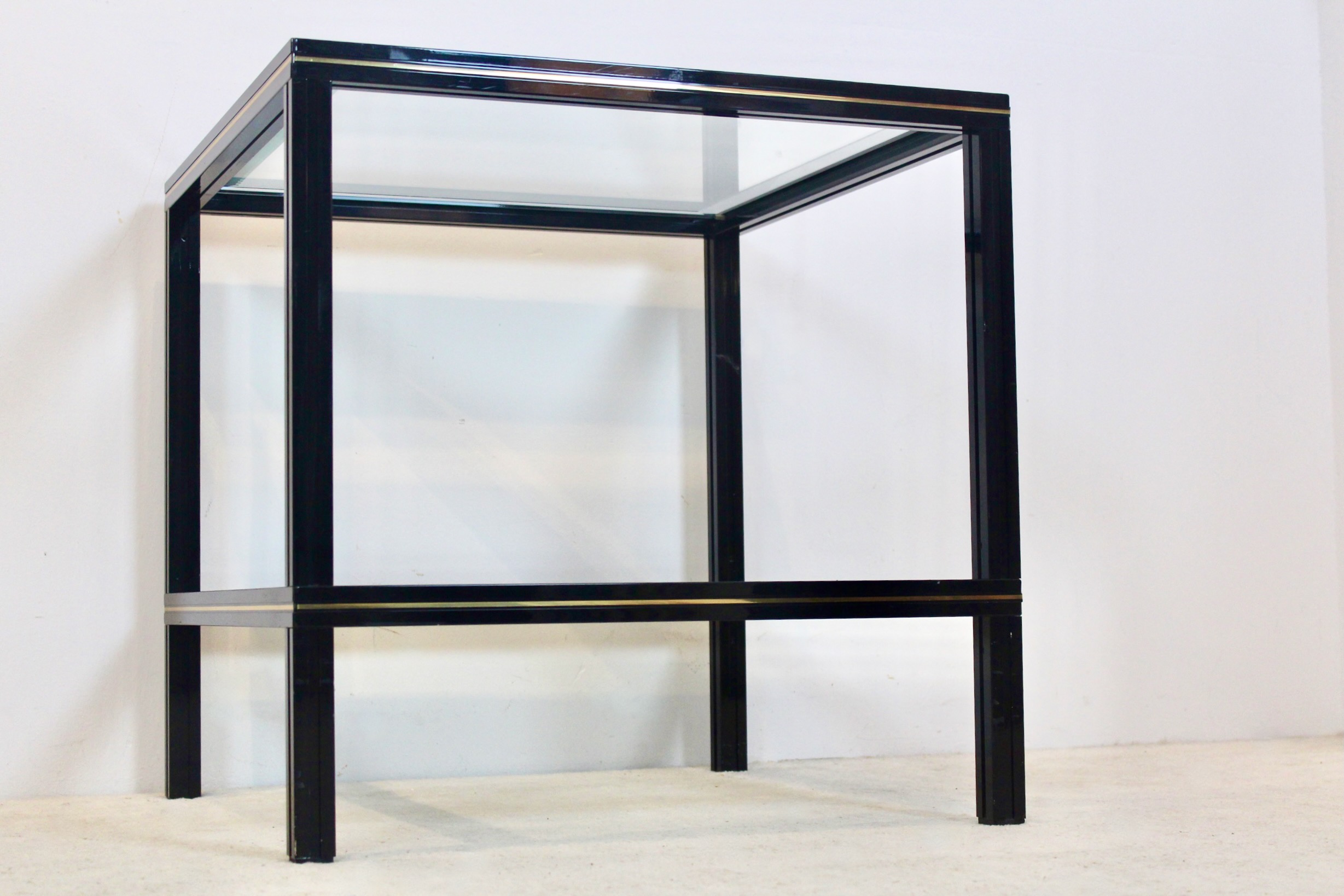 An elegant and timeless side table by Pierre Vandel, emblematic of French luxury design from the 1970s. The table features a sleek black lacquered aluminum frame, subtly accented with fine brass inlay lines, a signature detail of Vandel’s work that adds quiet sophistication without excess ornamentation.