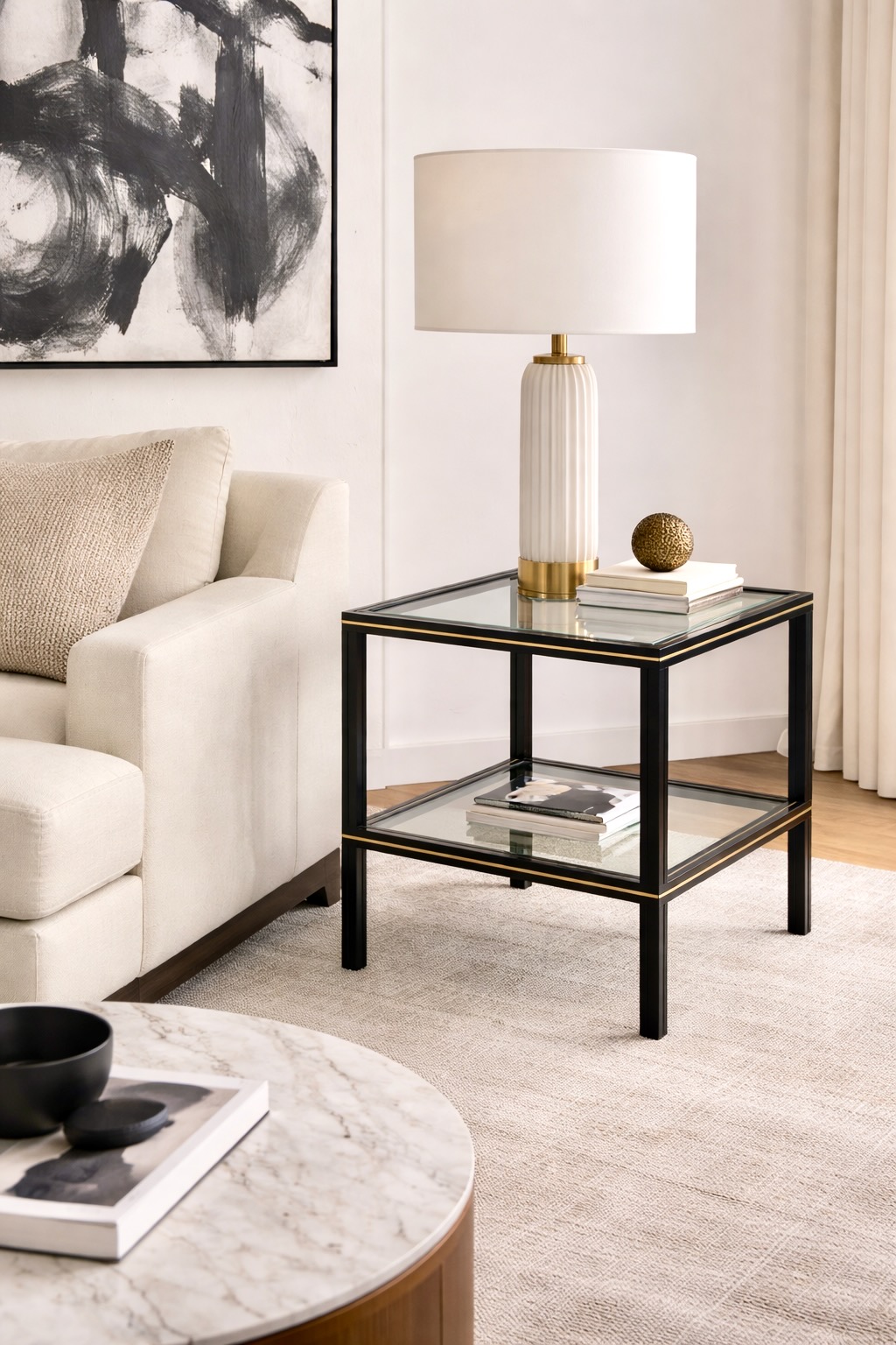 The design is completed with two glass tiers, creating a light, architectural presence while offering practical surface space. The square, balanced proportions and crisp geometry make this piece exceptionally versatile—ideal as a side table, lamp table, or refined occasional table in both modern and classic interiors.