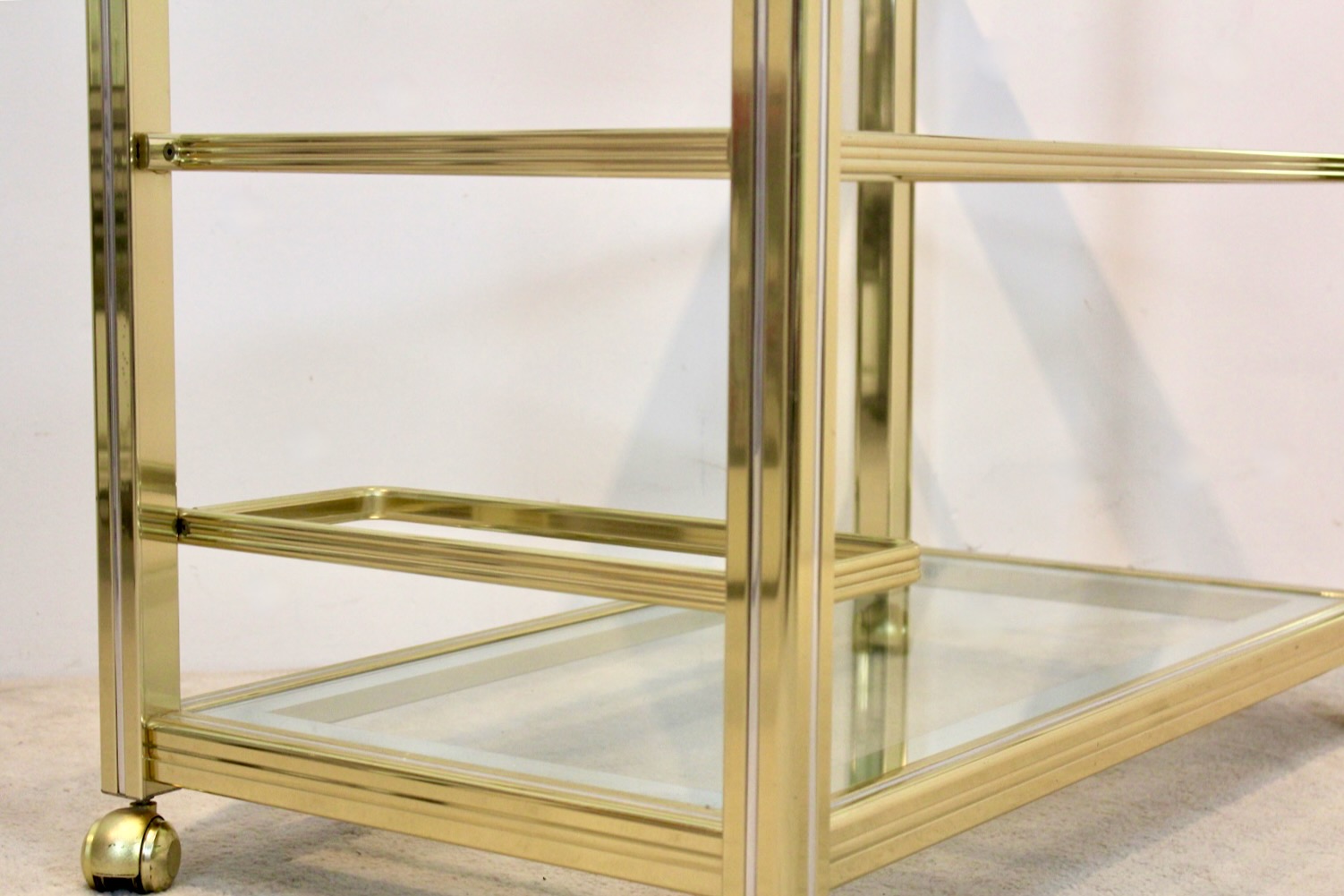 Extraoirdinary French Bar Cart in Brass with Chrome-Silver lining and Mirrored Glass. Designed and manufactured in France by Pierre Vandel in the ‘70s. The solid metal frame has a total original brass finish with elegant Chrome-Silver lining. The Bar cart features three tiers, the lower amd the upper tier feature mirrored glass. The Cart is in very good vintage condition. Designed with precision by Pierre Vandel with a very stylish performance.