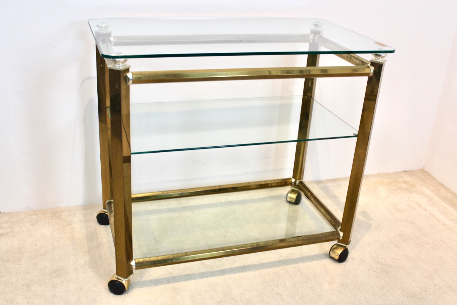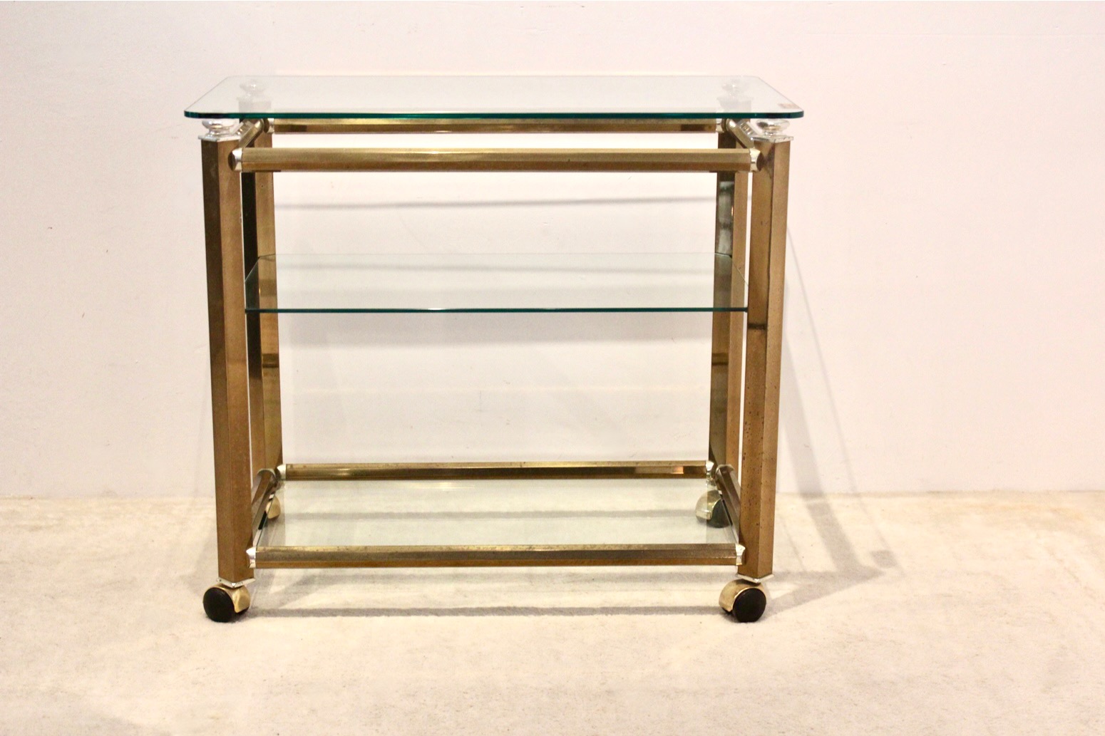 Rare Italian Bar Cart in Brass and Nickel with three tiers Glass. Designed and manufactured in Italy by Ponti & Terenghi. The solid brass frame has a total original finish with elegant Nickel accents. The Bar cart features three tiers with solid glass. The Cart is in good, used and original condition due to age and use. Designed with precision by with a very stylish performance.