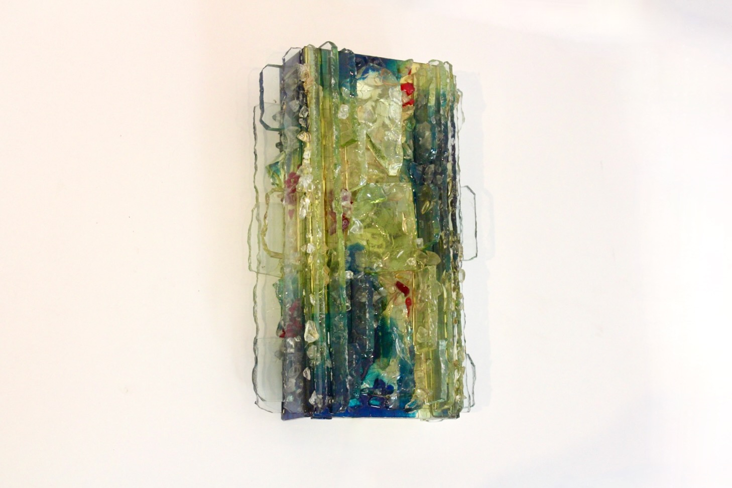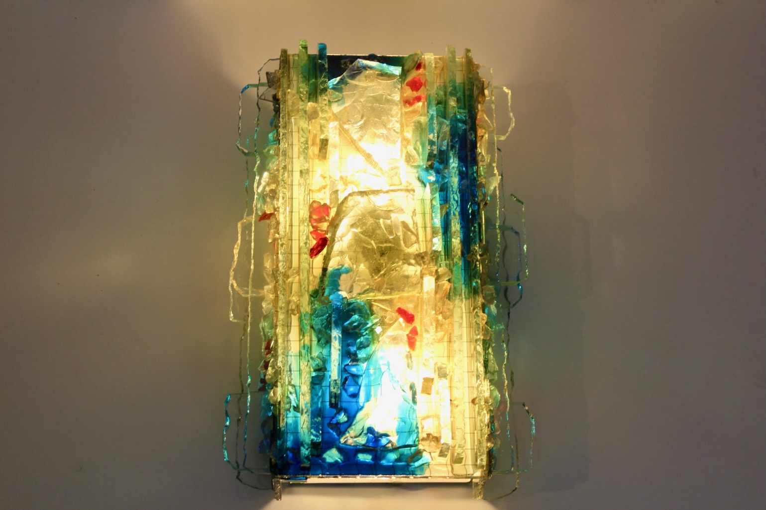 The wall lamp is handcrafted by Willem van Oyen for Raak. The fixture’s glass elements — in translucent shades of aqua blue, golden amber, and punctuated with vibrant red — are arranged in layered relief, creating a jewel-like surface that glows warmly when illuminated. The interplay of light through the irregular fragments gives the piece a painterly depth, bridging the line between functional object and luminous artwork.