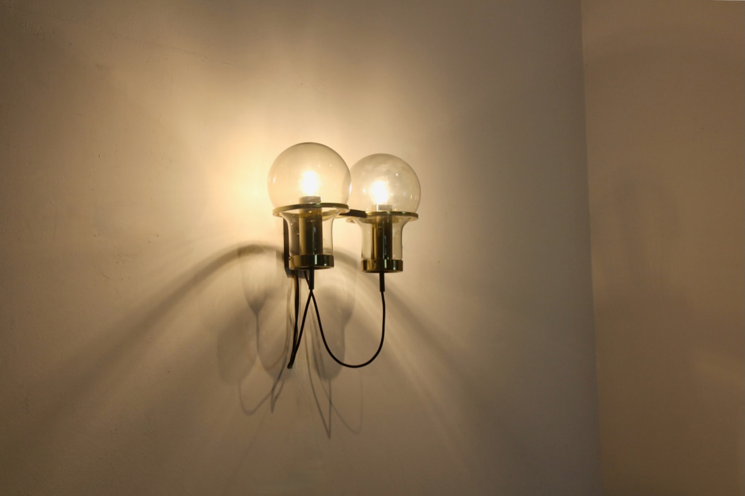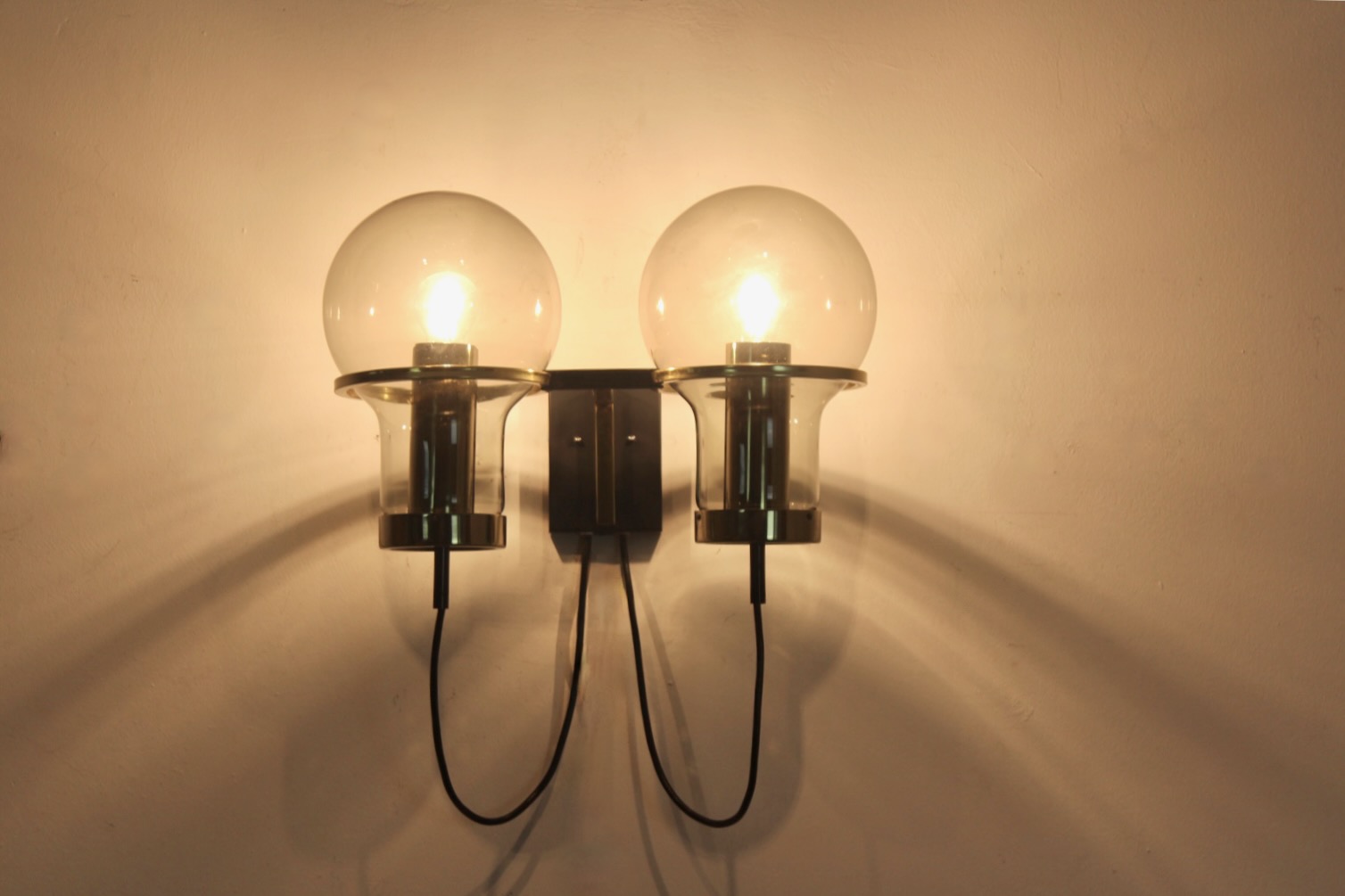 An exceptional example of mid-century Dutch design, this Double Maxi Globe wall lamp was produced by Raak Amsterdam in the 1960s — a standout piece from one of the era’s most influential lighting manufacturers. Composed of two large smoked-glass globes, each mounted on refined brass-toned cylindrical sockets, the fixture embodies the Raak ethos: architectural elegance with a sculptural twist. The globes are supported by a matte black metal backplate, creating a minimalist yet dramatic profile ideal for both residential and commercial interiors.