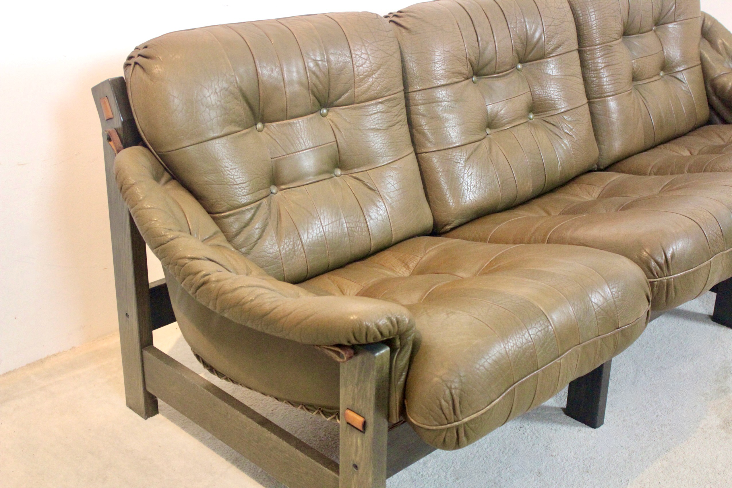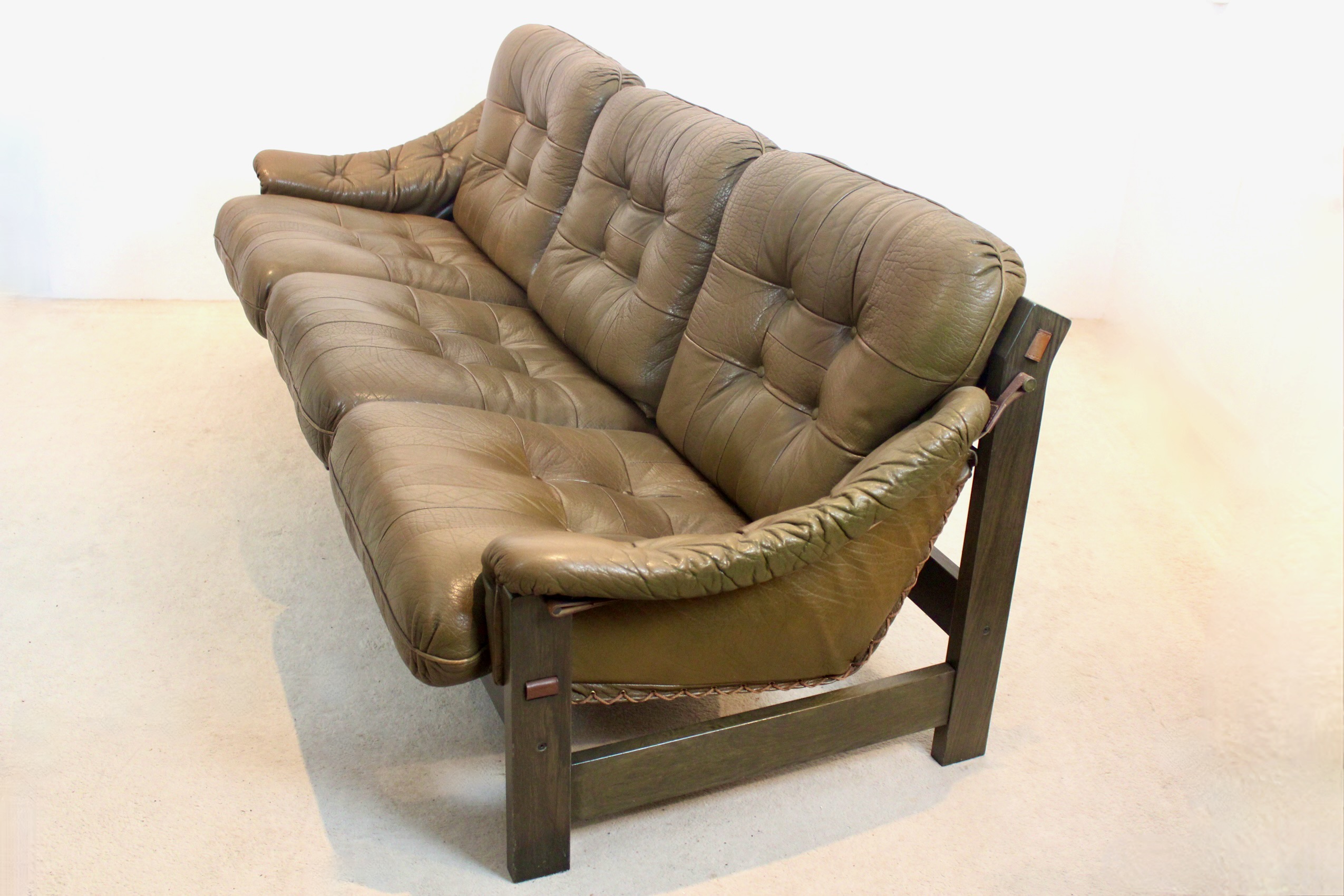 Hand-laced leather detailing along the lower edges further elevates the piece, underscoring the artisanal nature of its manufacture. The dialogue between supple leather and robust wood frame places this sofa within the tradition of Norwegian lounge furniture associated with designers such as Ingmar Relling, though here interpreted with more substantial, fully upholstered cushions and a notably luxurious sensibility.