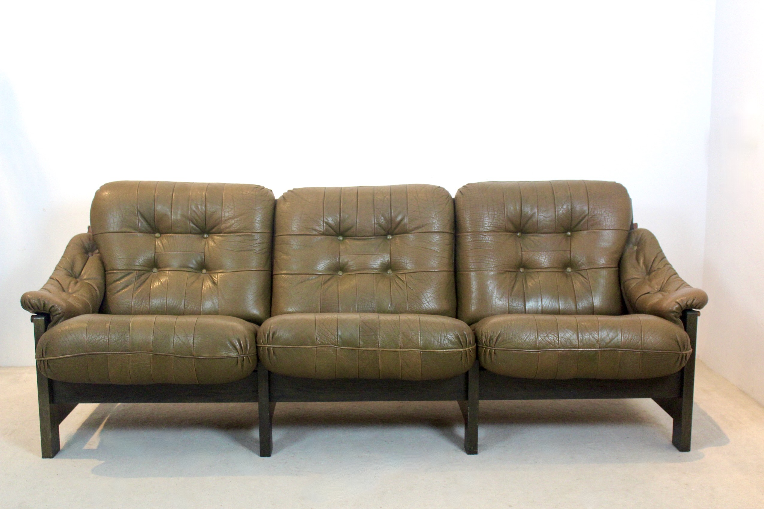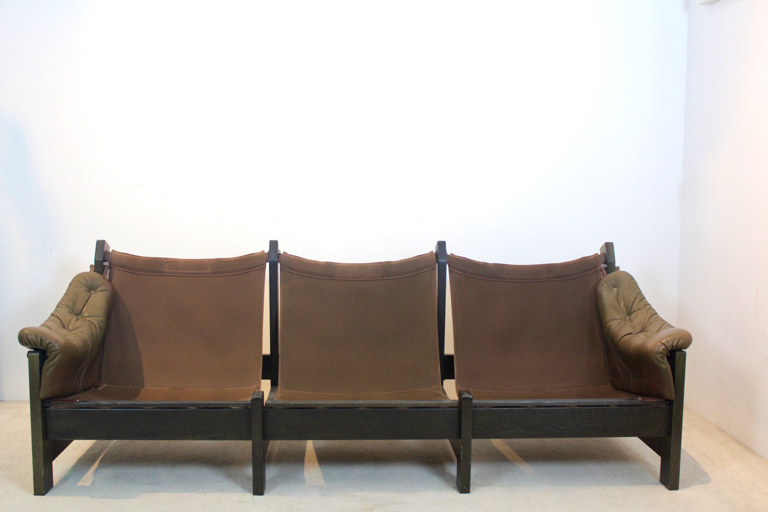 This striking modular sofa is a refined example of high-end Norwegian modern design from the late 1960s–early 1970s, combining architectural presence with exceptional comfort and craftsmanship. Composed of three generously scaled seating modules, the sofa is constructed around a solid stained oakwood frame with exposed uprights and stretchers, lending the piece a confident, sculptural character.