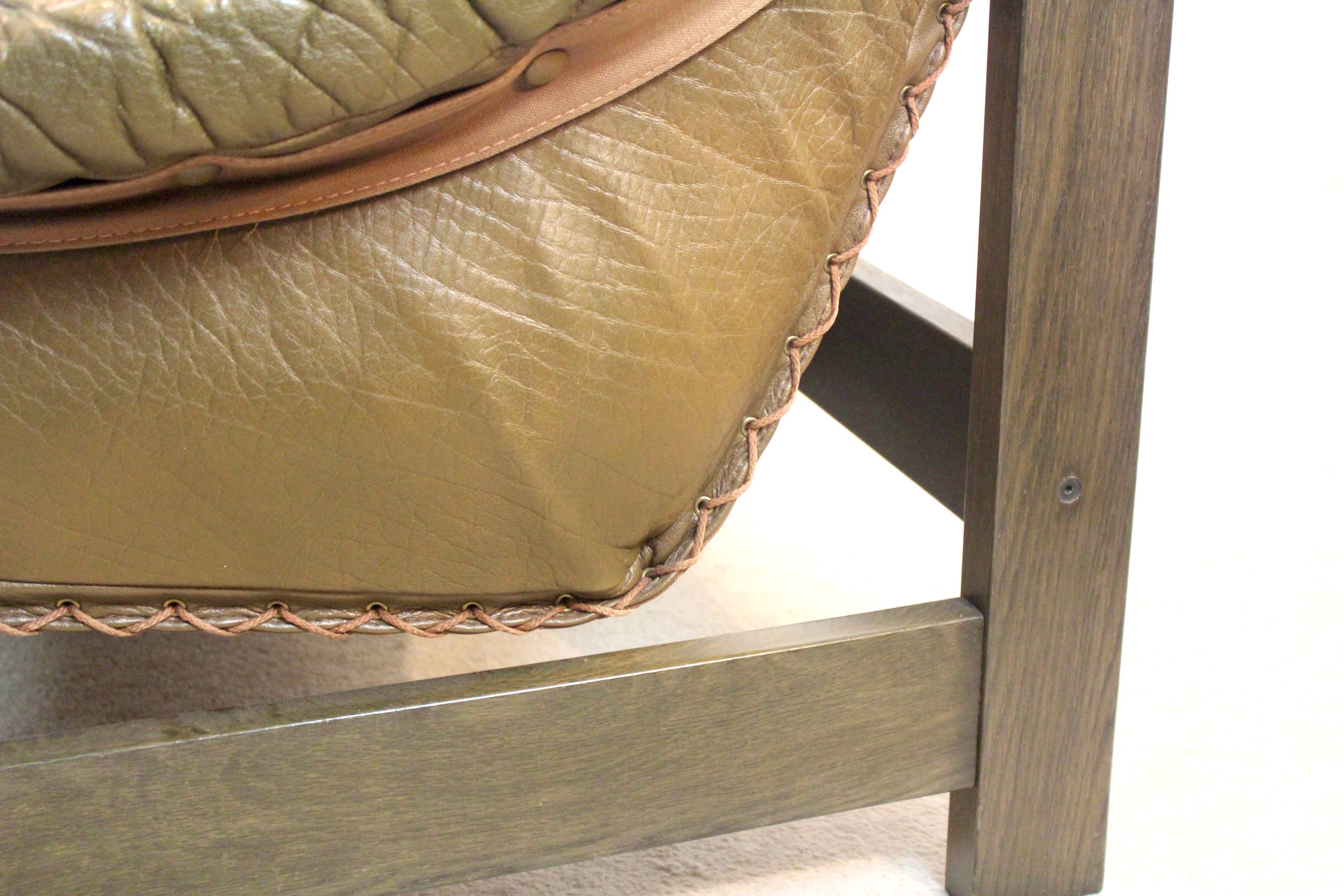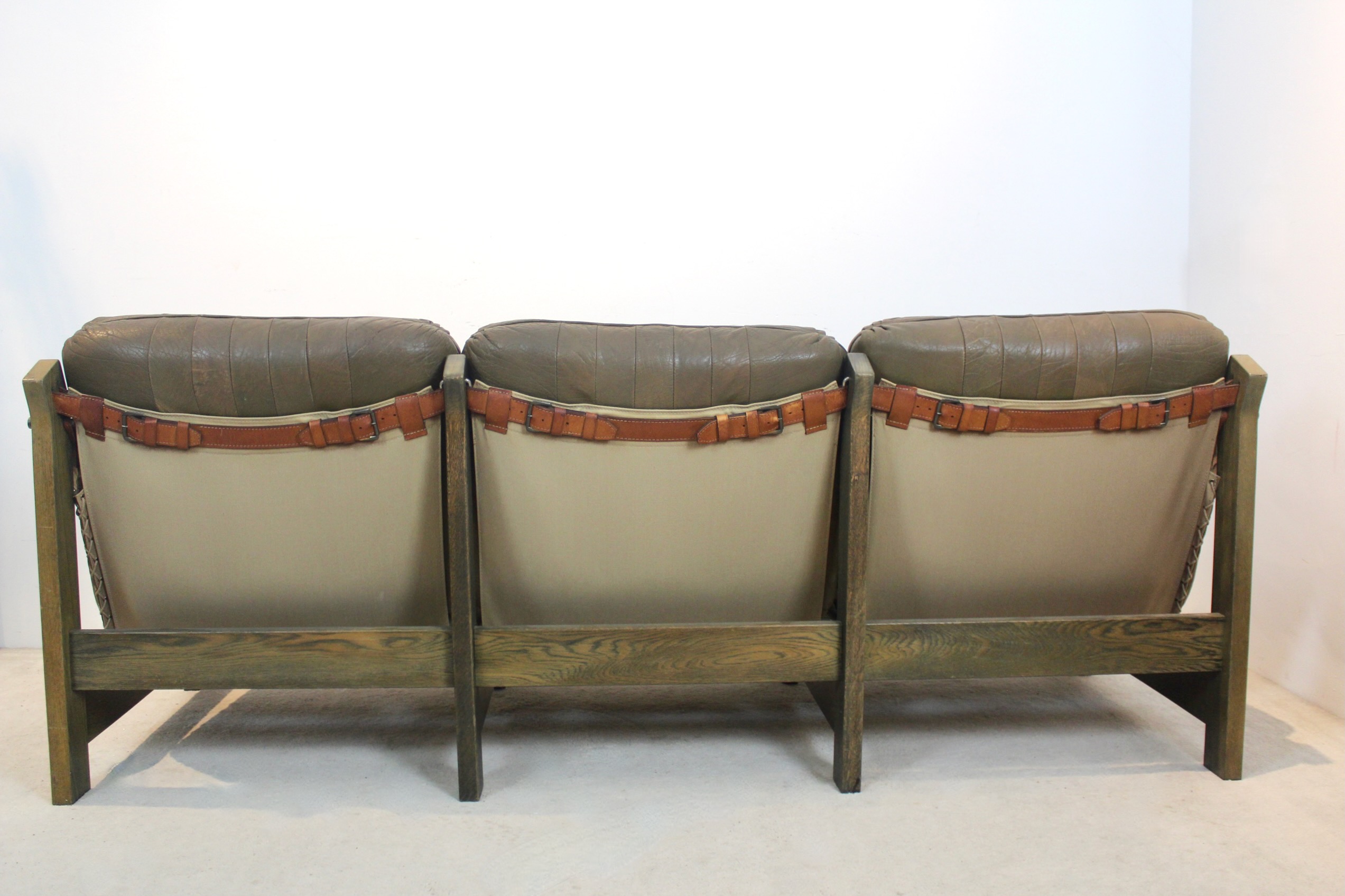 The seating and back cushions are upholstered in luxurious, thick aniline leather, richly padded and button-tufted, now displaying a beautifully developed patina that speaks to both quality and age. The reverse reveals a particularly sophisticated construction: full leather sling backs, individually tensioned and secured with multiple adjustable saddle-leather straps and buckles. This functional yet expressive system allows for subtle adjustment of comfort over time and reflects the Scandinavian emphasis on longevity, repairability, and intelligent design.