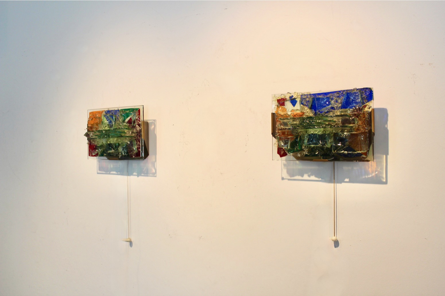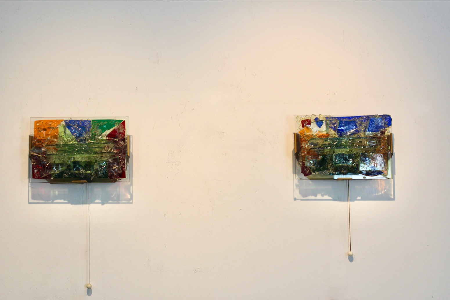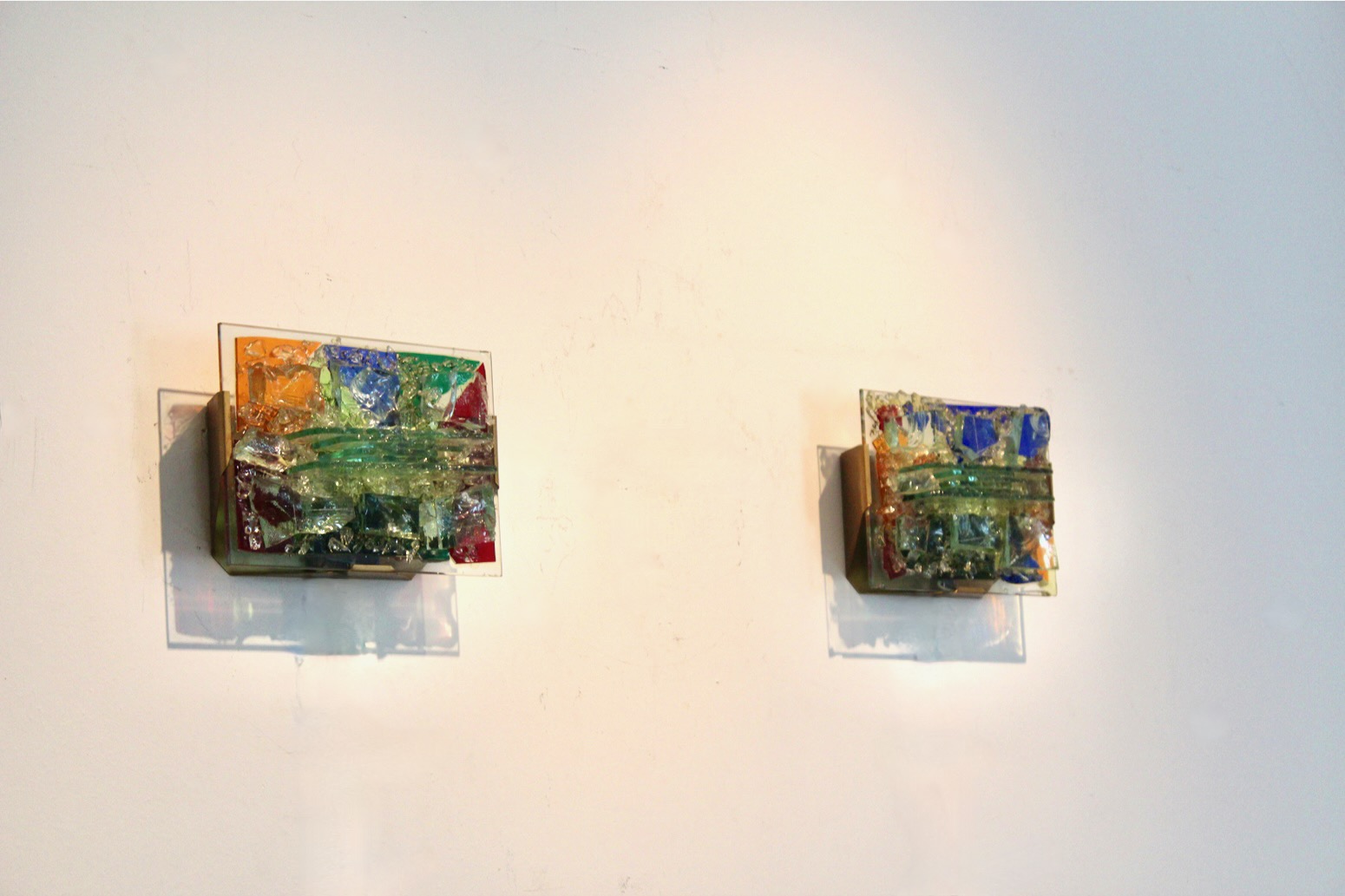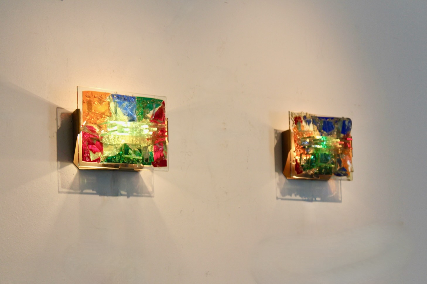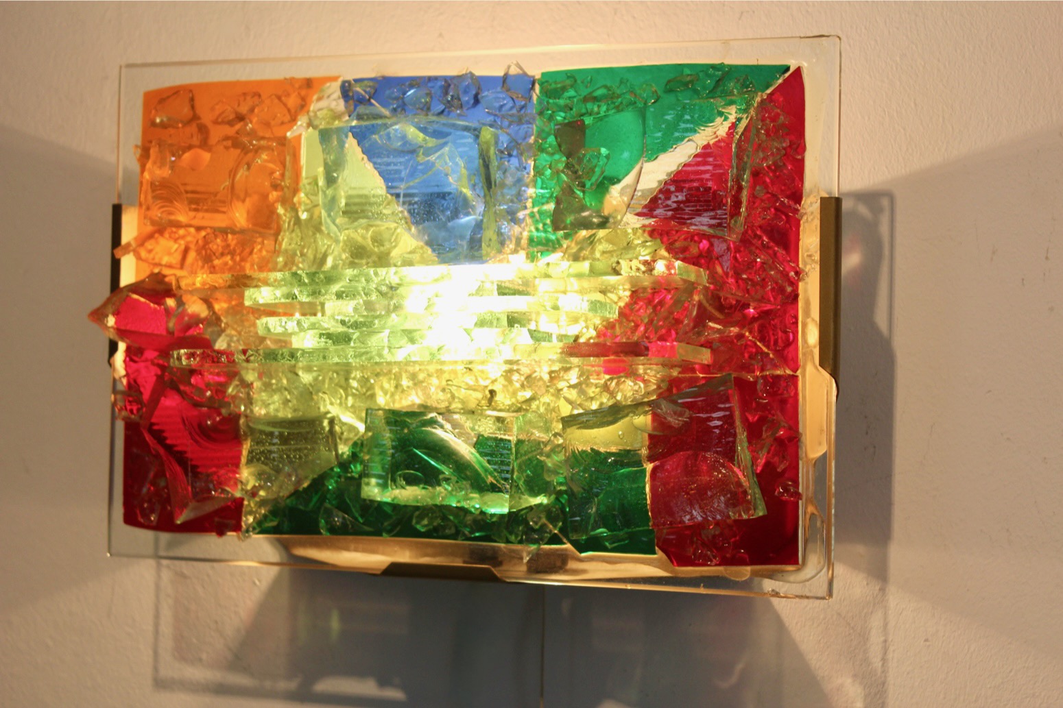A rare and striking illuminated wall sculpture attributed to Cosack Leuchten, one of Germany’s most innovative lighting manufacturers of the postwar era. We have 2 pieces available and these lamps exemplify the studio’s exploration of light as both a functional and artistic medium. Each piece features a composition of thick, hand-assembled clear glass chunks, mounted in dynamic relief over a glass backplate accented with bold, colored elements. The color itself is not inherent in the glass but rather achieved through cleverly positioned inserts—allowing light to refract, glow, and shift through the crystalline surfaces in a deeply architectural way.