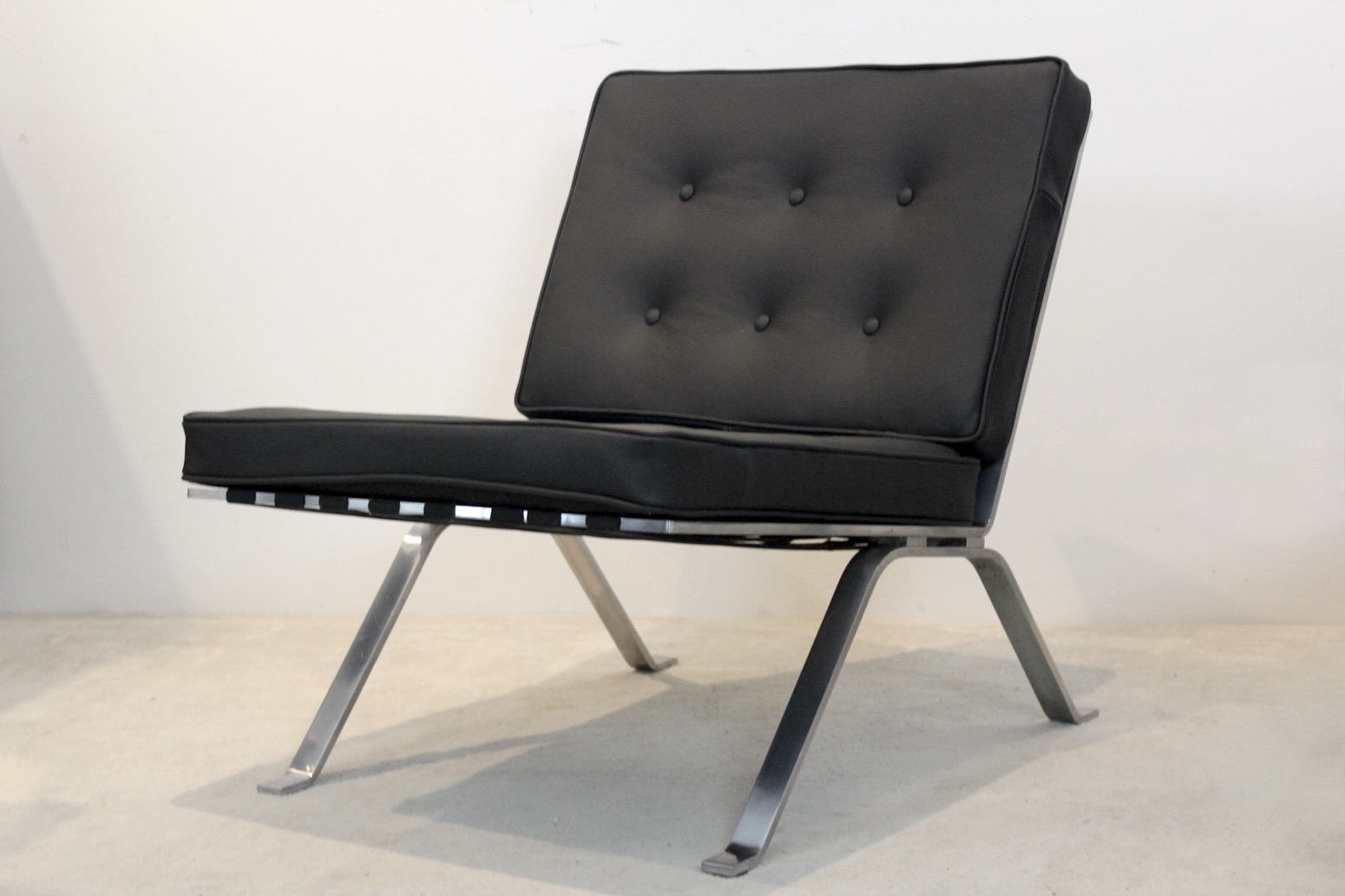 A pair of very comfortable Lounge chairs with a heavy stainless steel base and tuffed leather cushions designed by Hans Eichenberger for Girsberger and made in Switzerland in the late ‘60s. The chairs are designed in 1966. Hans Eichenberger is an interior architect from Switzerland. He designed some of the finest furniture pieces of the Swiss Mid-Century Modern era. Many famous Swiss companies like De Sede, Strassle and Girsberger worked with him. These chairs are in very good condition normal wear due to normal use and with new leather upholstery. They have a great sit!