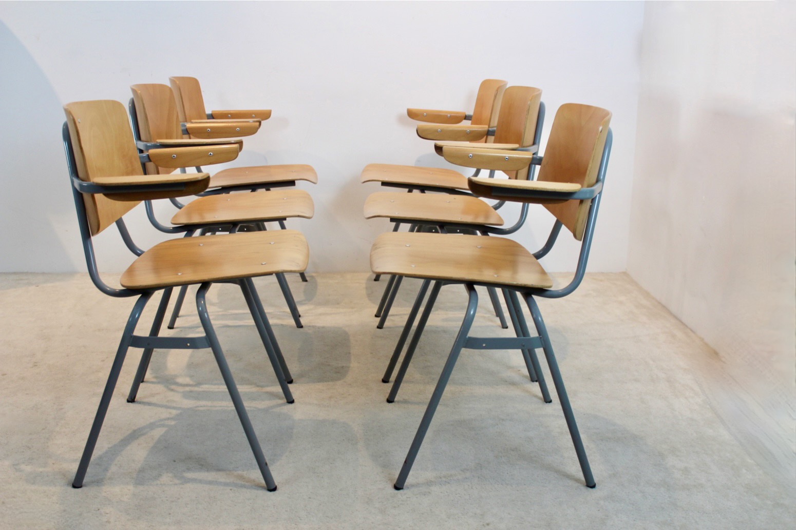 Set of six Plywood CAR '305-Chairs' with Armrests designed by Kho Liang Ie and J. Ruigrok in 1957. These chairs are considered iconic examples of mid-century modern design. The chairs were manufactured by CAR Katwijk and are labelled with ‘CAR Katwijk, made in Holland’. The design was a result of a collaboration between Kho Liang Ie, an Indonesian-born designer, and J. Ruigrok, a Dutch furniture manufacturer. The chairs were primarily intended for use in waiting rooms and public spaces. The Plywood CAR '305-Chairs' feature a sleek and minimalist design. They are constructed on an enameled grey tubular steel base and using molded plywood for the seat and backrest, which was a popular material choice during the mid-century modern era. The chairs have a curved, ergonomic shape that provides comfort and support to the user. One distinctive feature of these chairs is the addition of armrests, which further enhance their comfort and functionality. The armrests are seamlessly integrated into the overall design. This design element adds an elegant touch while also providing a practical feature for users as is the fact that the chairs are stackable (up to 3) as well.