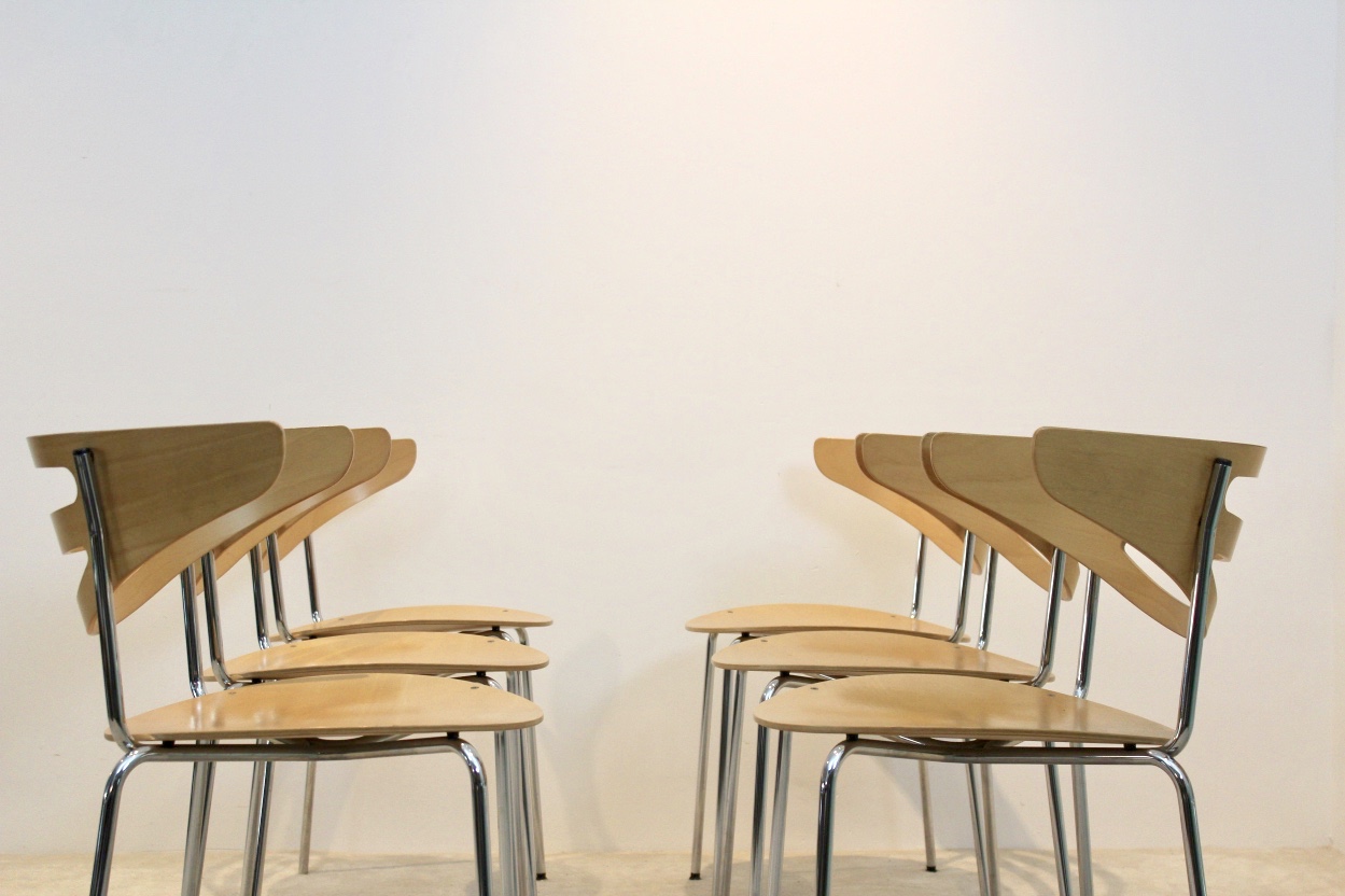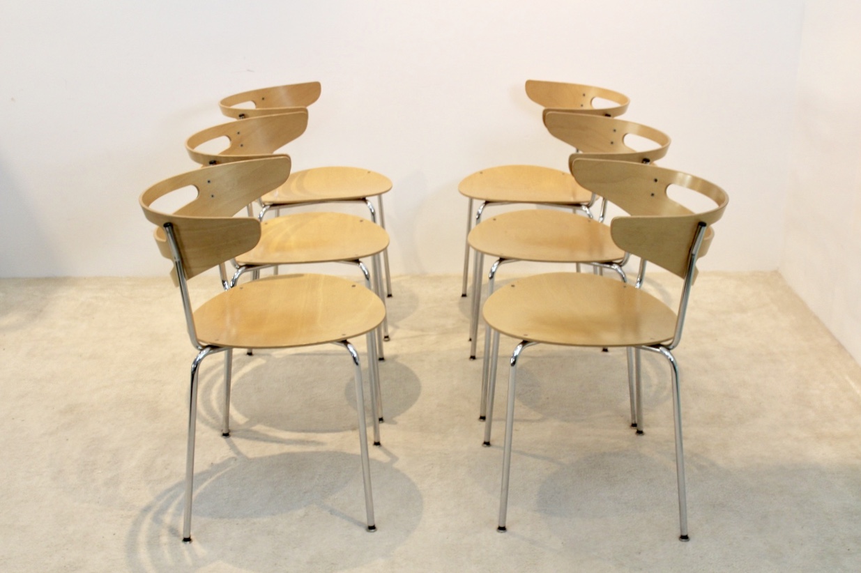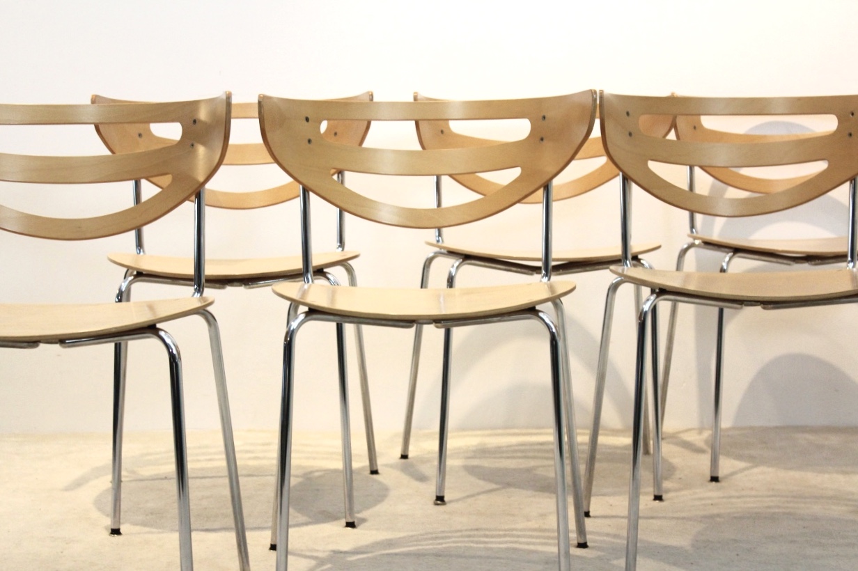 Sculptural set of six beautiful curved Thonet diner chairs. The chair is not a classic Thonet chair but a more modern version of their quality chairs. It is made of beechwood with a sophisticated chromed frame. The chairs are signed with a seal placed under the chair and are stackable. Surprisingly comfortable sit and in very good condition with normal wear due to use.