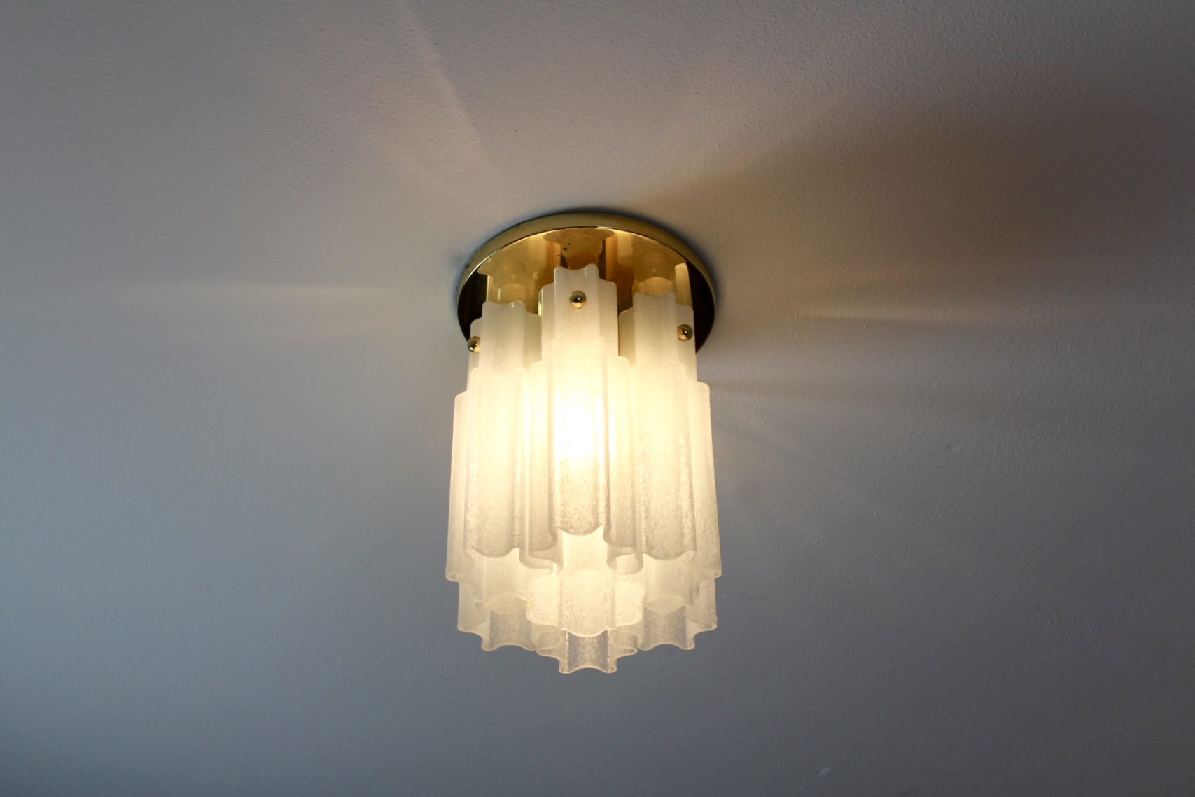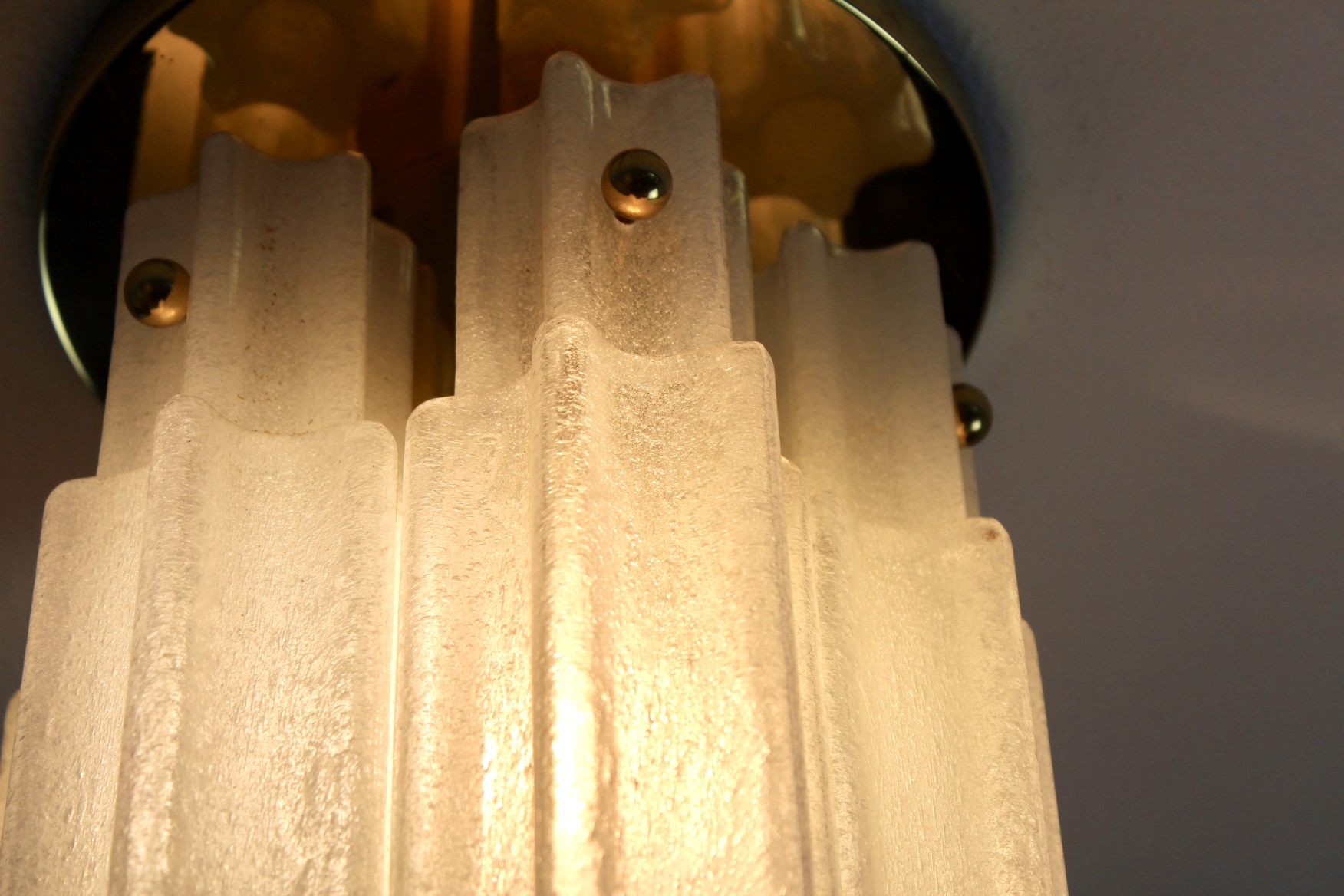 A high quality and characteristic Glashütte Limburg flush mount. We have a stock of 7 of these pieces available. They are an example of Limburg's Modernist quality lighting. Each lamp has a large and very solid round Brass base with 6 Star-shaped Frosted glass boilers in a circle. Each individual glass shade column shaped with a six sided star, all of which are the same size. Marked and in very good, solid and original condition with a beautiful light effect.
