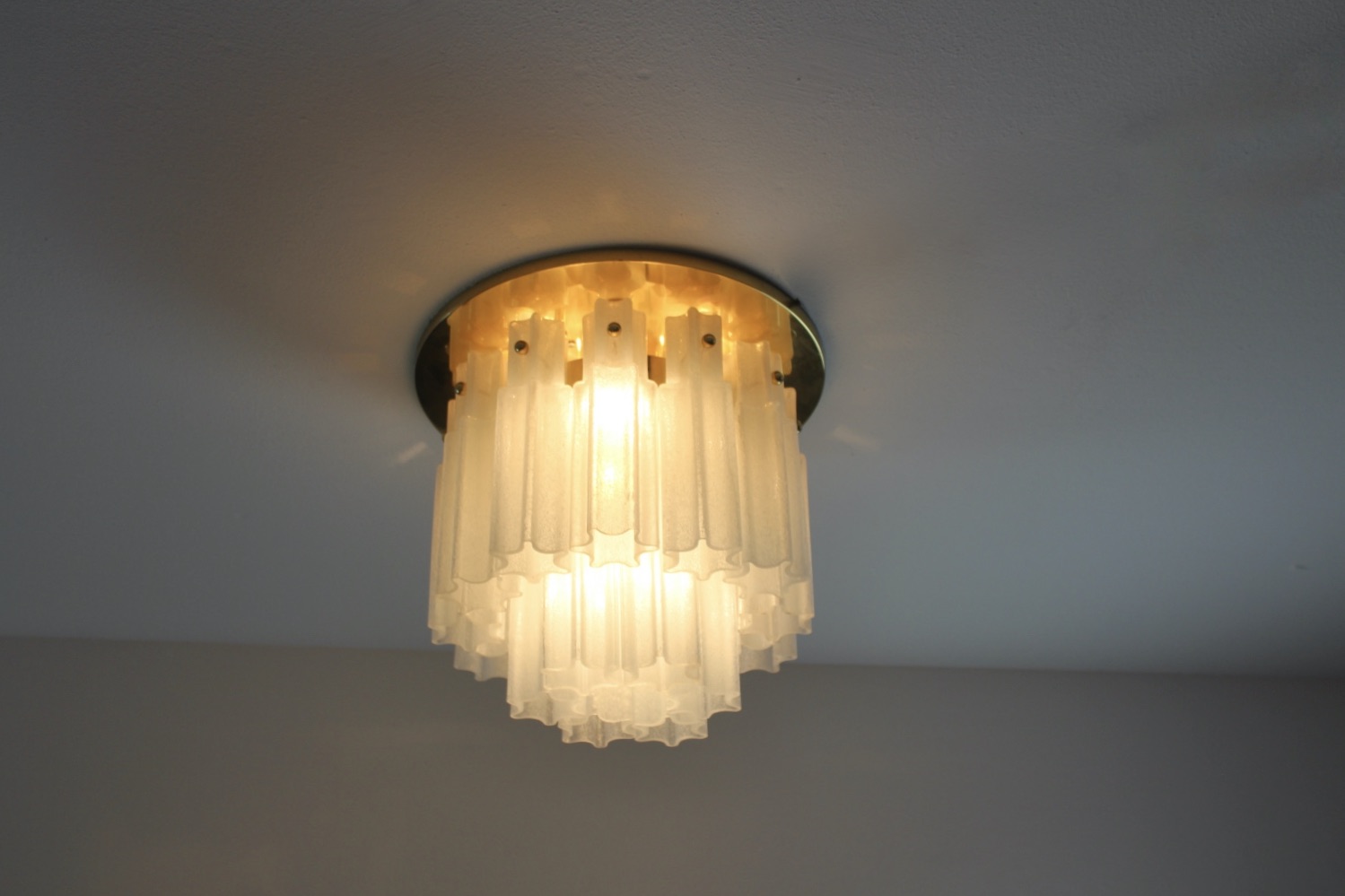A high quality and characteristic Glashütte Limburg flush mount. We have a stock of 3 of these pieces available. They are an example of Limburg's Modernist quality lighting. Each lamp has a large and very solid round Brass base with 18 Star-shaped Frosted glass boilers in a circle. Each individual glass shade column shaped with a six sided star, all of which are the same size. Marked and in very good, solid and original condition with a beautiful light effect.