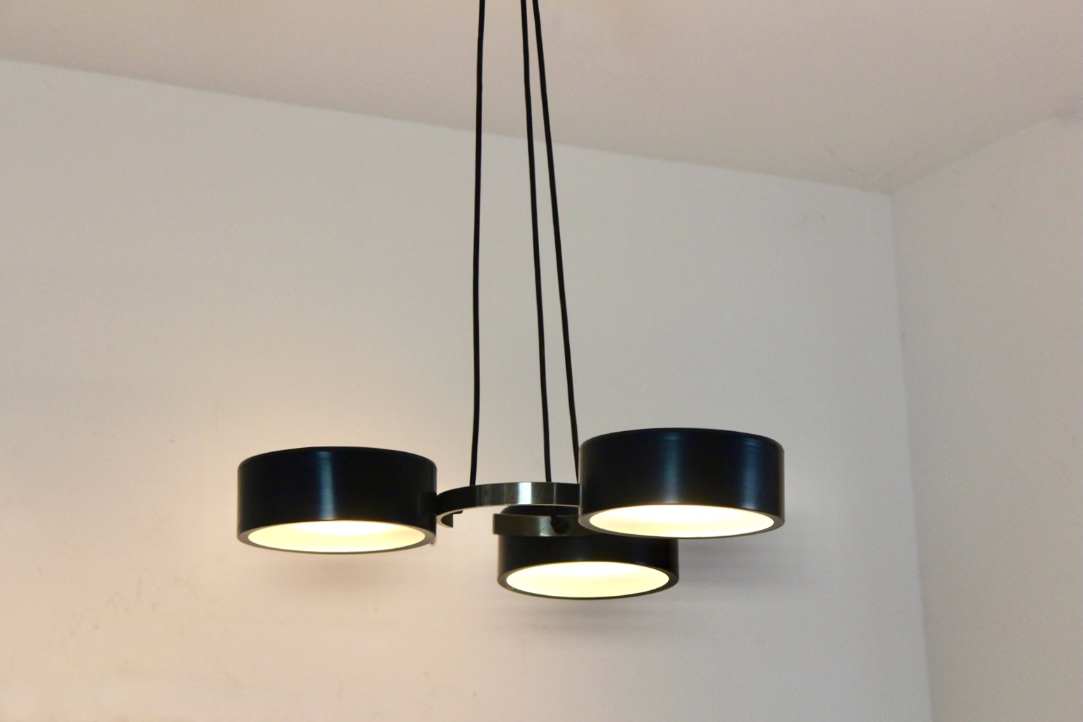 An exceptional example of Italian mid-century lighting, this sculptural triple pendant by Reggiani embodies the brand’s refined balance between architectural rigor and poetic light. Composed of three black lacquered metal shades suspended from slender rods around a central brushed steel ring, the piece demonstrates Reggiani’s characteristic precision in proportion and material contrast. The circular diffusers emit a soft, even glow, creating an interplay between solid geometry and atmospheric light — a hallmark of the studio’s approach during the 1960s.