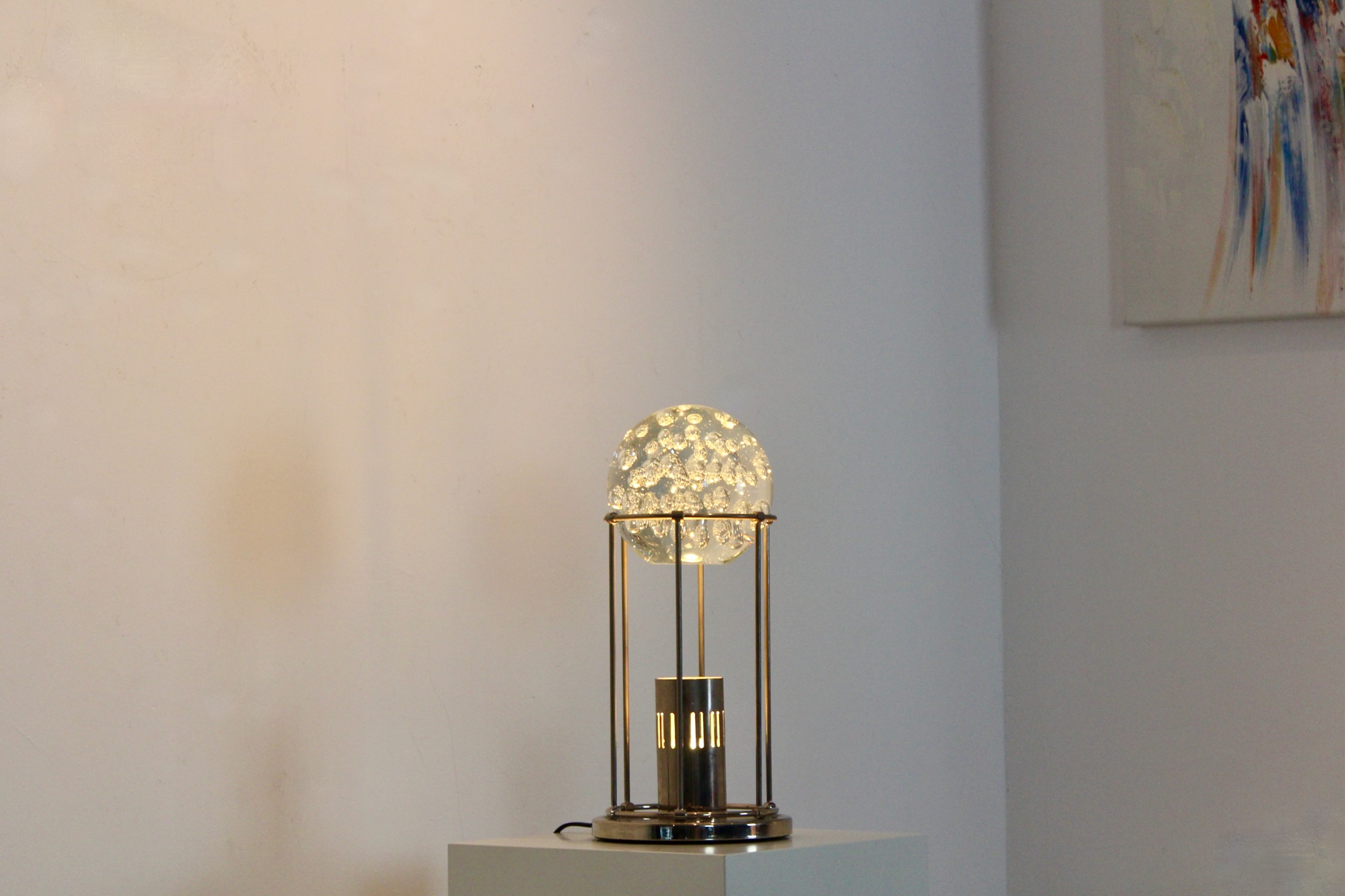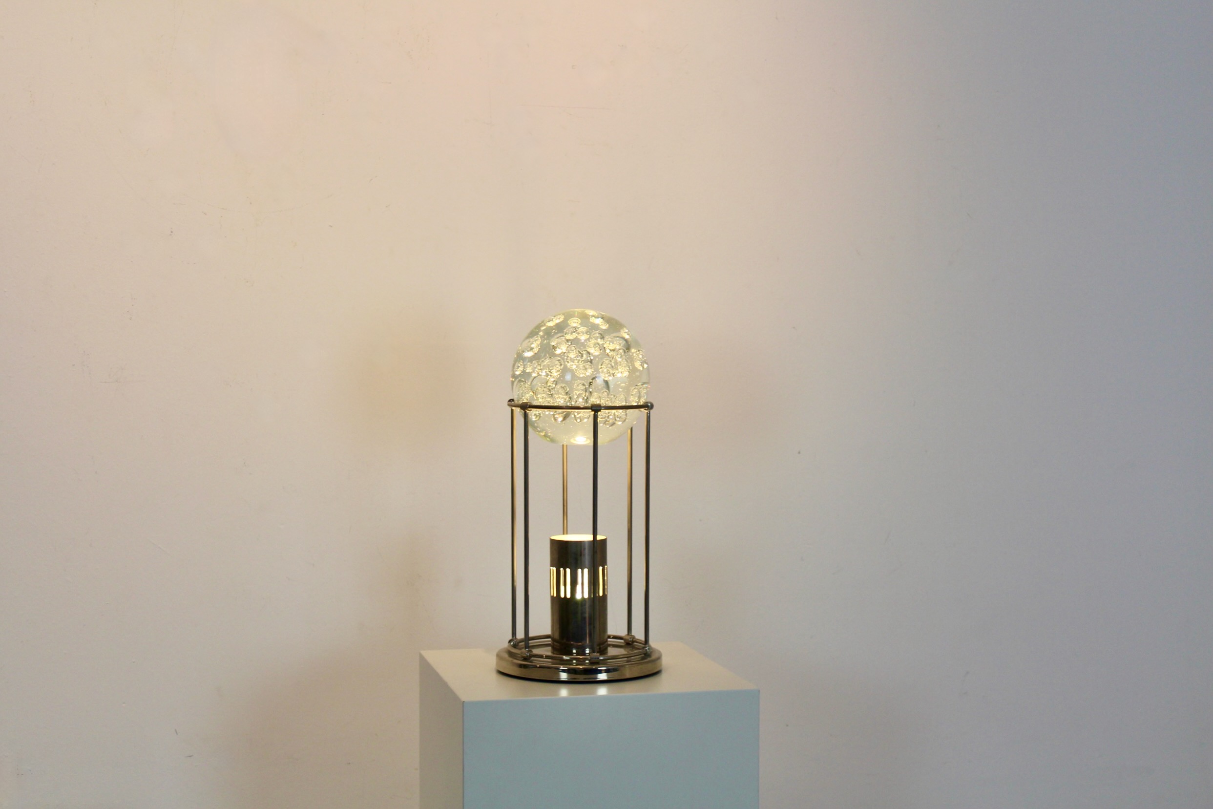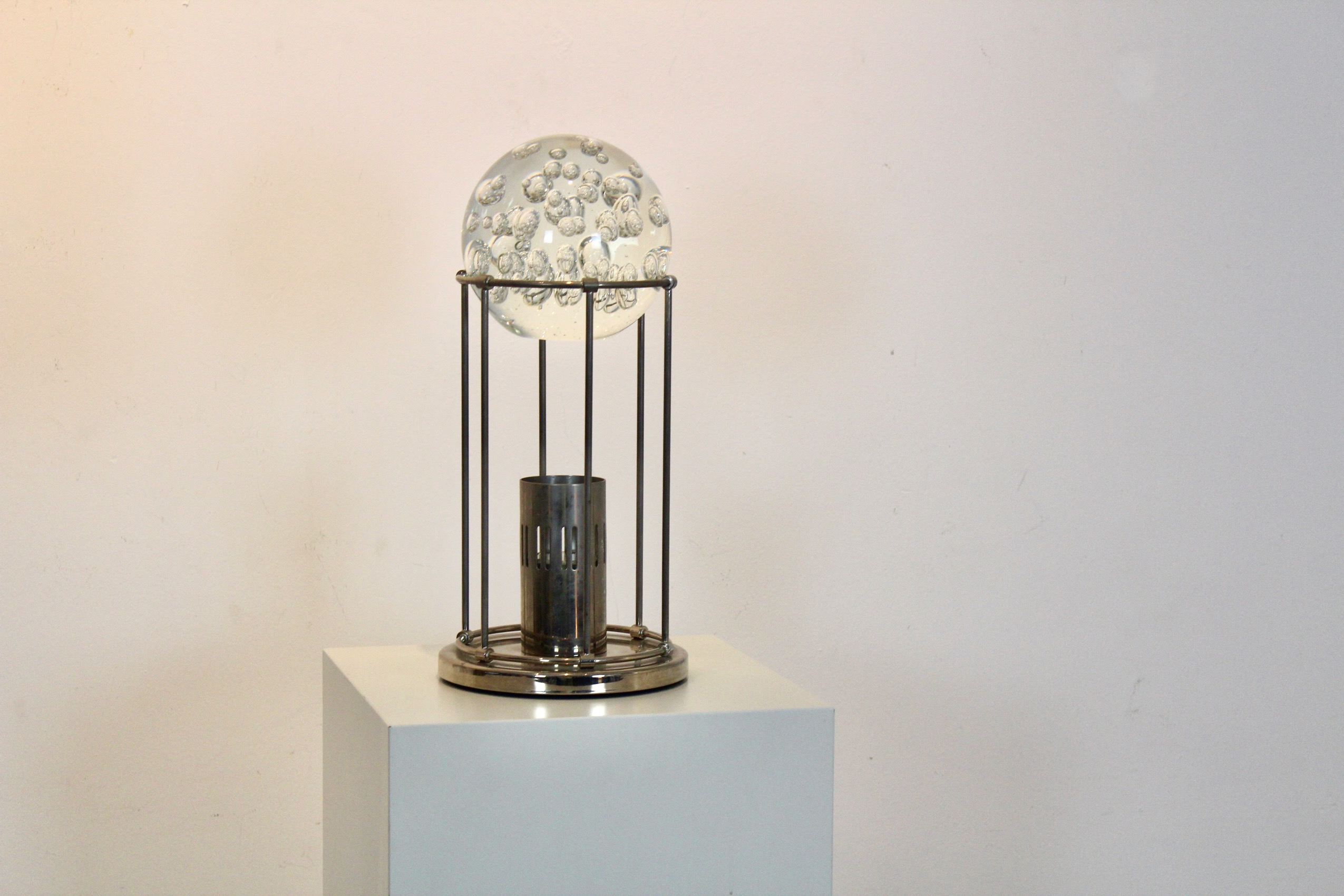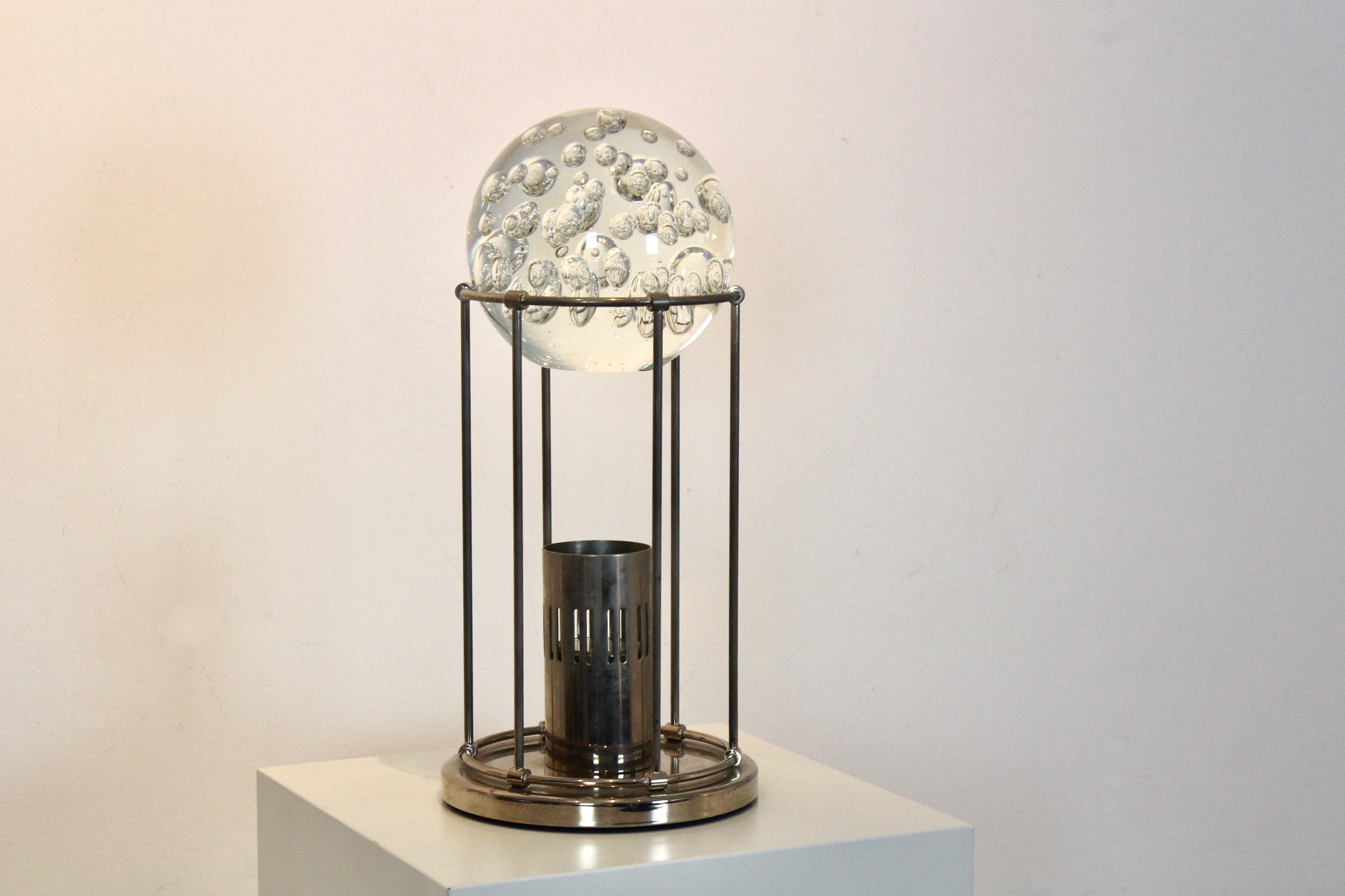 This sculptural table lamp offers a refined balance between decorative presence and architectural restraint, making it an ideal accent for curated interiors. Designed in West Germany in the late 1960s–1970s, it features a substantial clear glass bowl with controlled bubble inclusions, suspended within a minimalist polished steel frame.