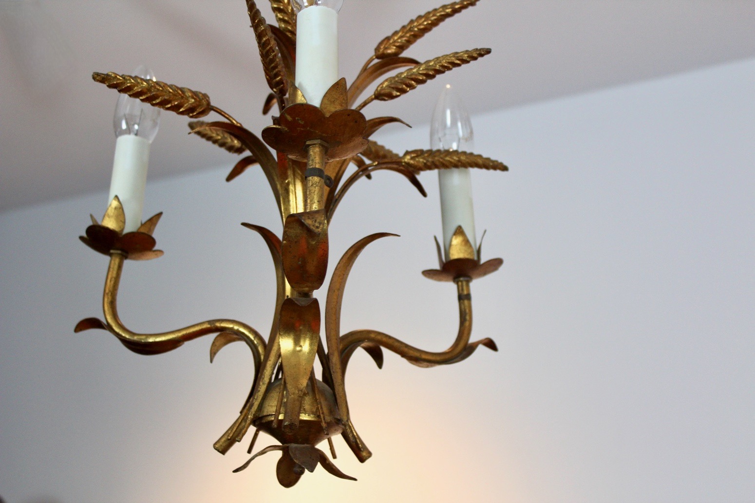 Exotic Hollywood Regency style gilt Wheat Sheaf Chandelier. Designed in Germany by Hans Kögl in the1970s. This classy and rare lamp has three lights mounted in holders with faux candle covers and beautiful gilded floral metal leaves. The lamp is decorated with gold leaves and Wheat Sheafs It is in a very good vintage condition. A real eye catcher with amazing contrasts when lit.
