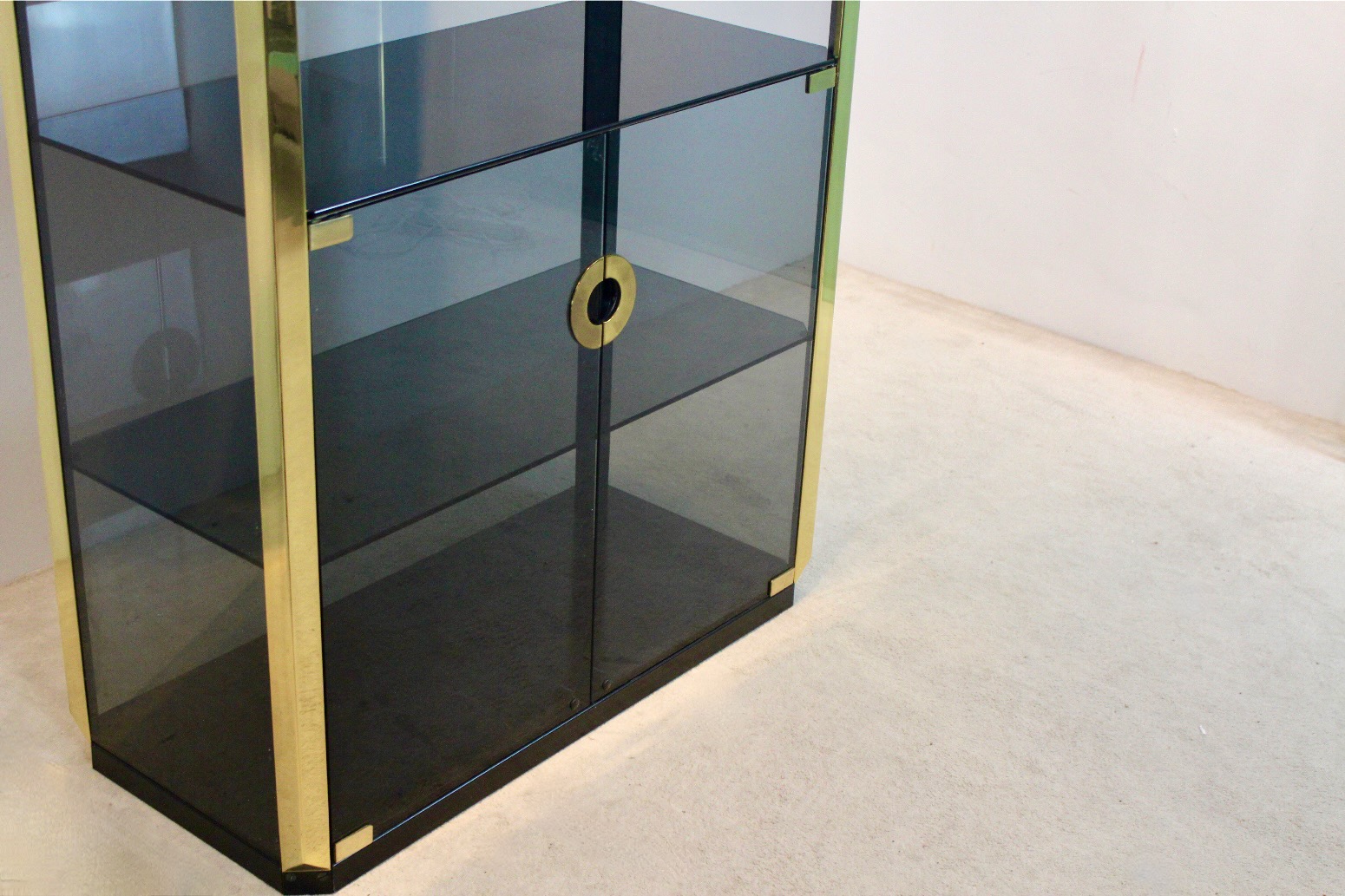 Beautiful Smoked Glass Cabinet designed by Willy Rizzo for Mario Sabot, 1970s. The cabinet comes with smoked glass with accenting brass hardware. The frame of the cabinet is made of very solid steel. The lower part can be closed and has two doors and two tiers. The upper part has three tiers. The cabinet is in very good condition and has normal wear due to use and age. It is unique and has a glamorous appearance. Very nice piece to own.